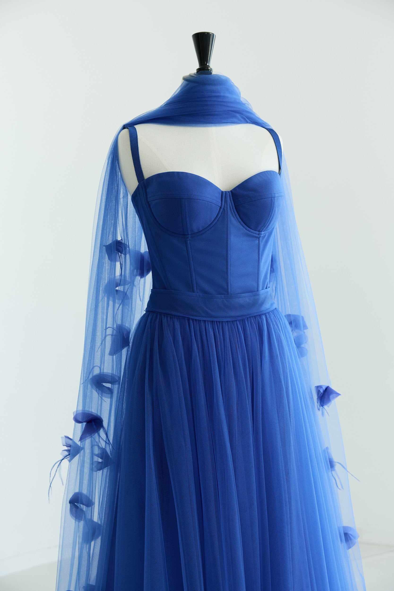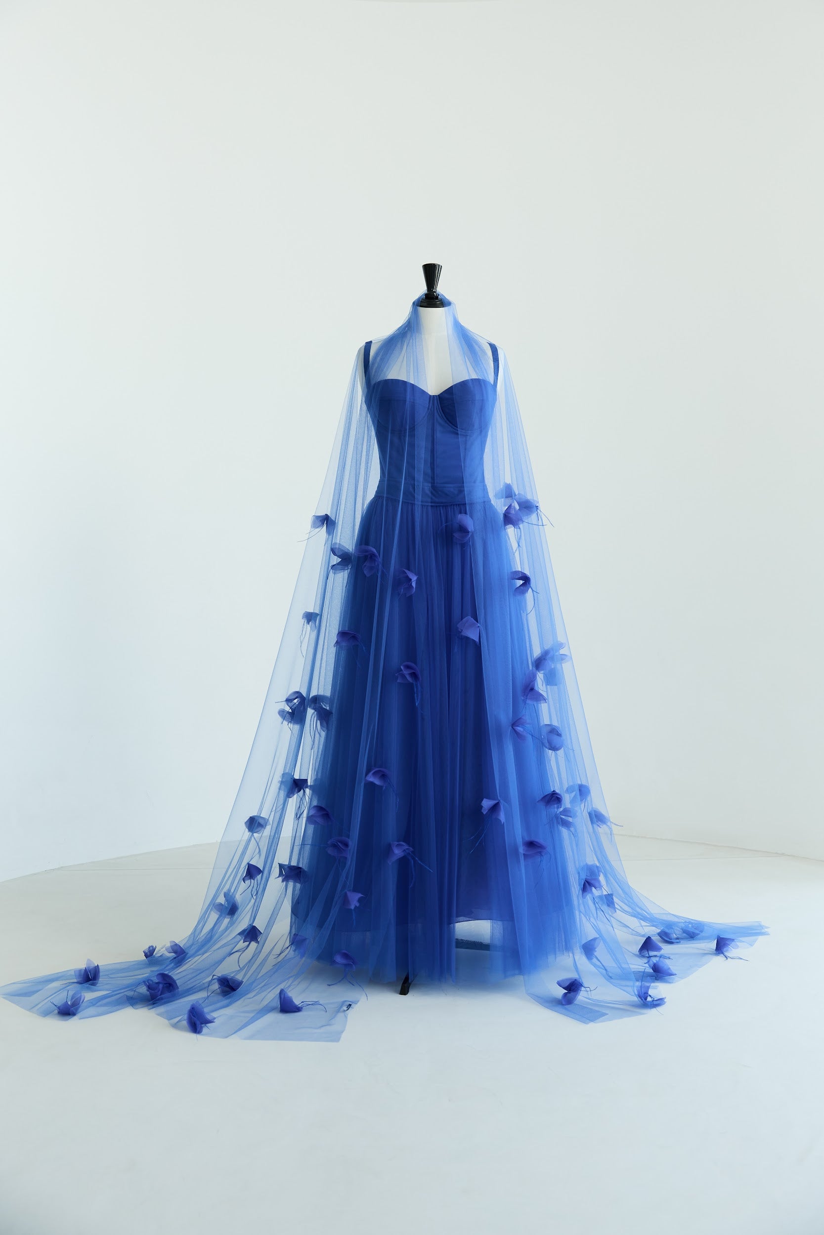 A sheer veil draped delicately over the shoulders, adding an element of poetic softness. Adorned with subtle floral accents, it floats around the silhouette like a whisper of movement. Light and transparent, the veil enhances the look with a romantic, dreamlike finish while revealing the form beneath.