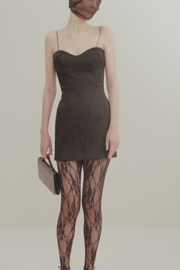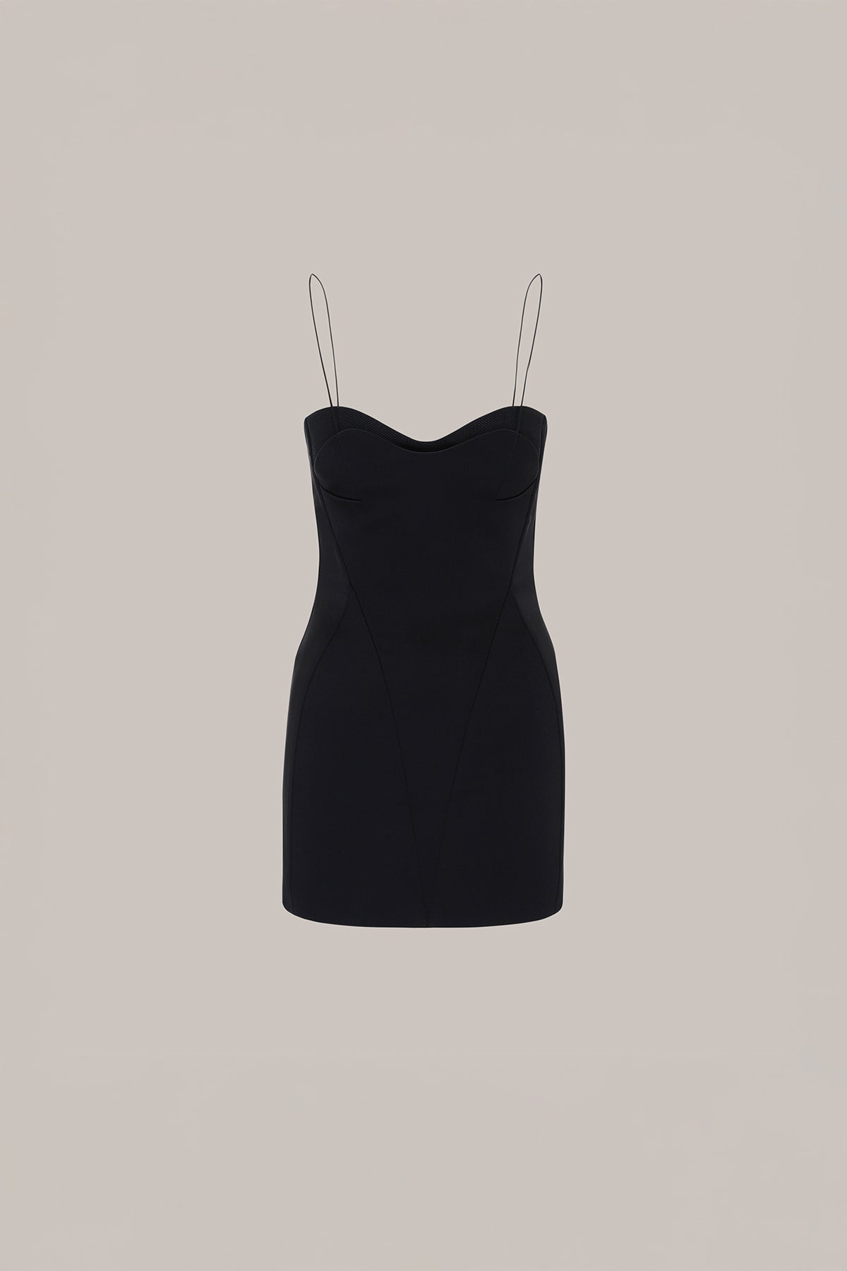 A structured black mini dress defined by precision lines and sculpted double cups.