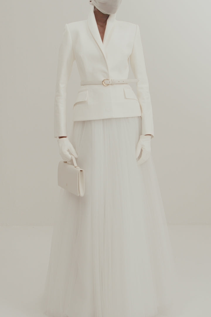A sculptural expression of strength and softness. Her Silhouette White Leather Jacket frames the body with precision, revealing a powerful yet feminine presence.