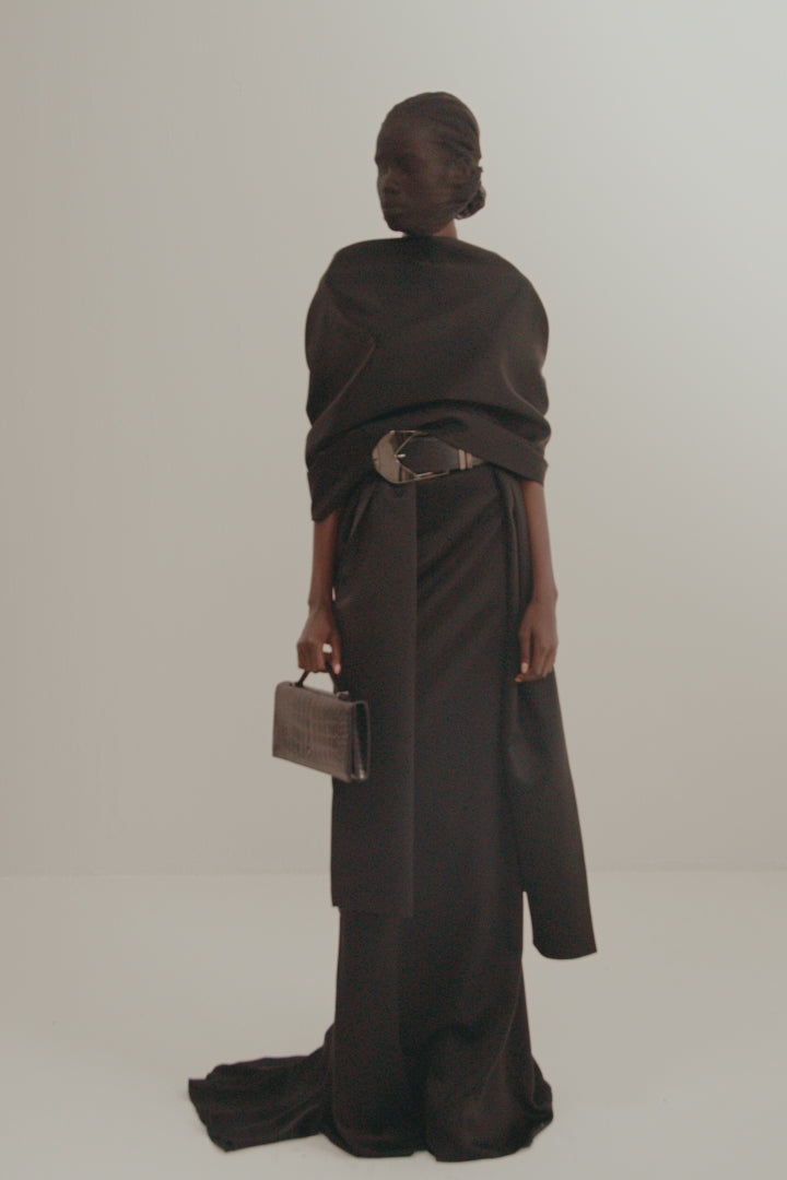 Crafted from a luxurious silk-viscose blend, this black pencil skirt embraces the figure with refined precision. The flared back detail introduces fluid movement and contemporary femininity, balancing structure with grace. A versatile piece, it transitions seamlessly from formal to modern styling.