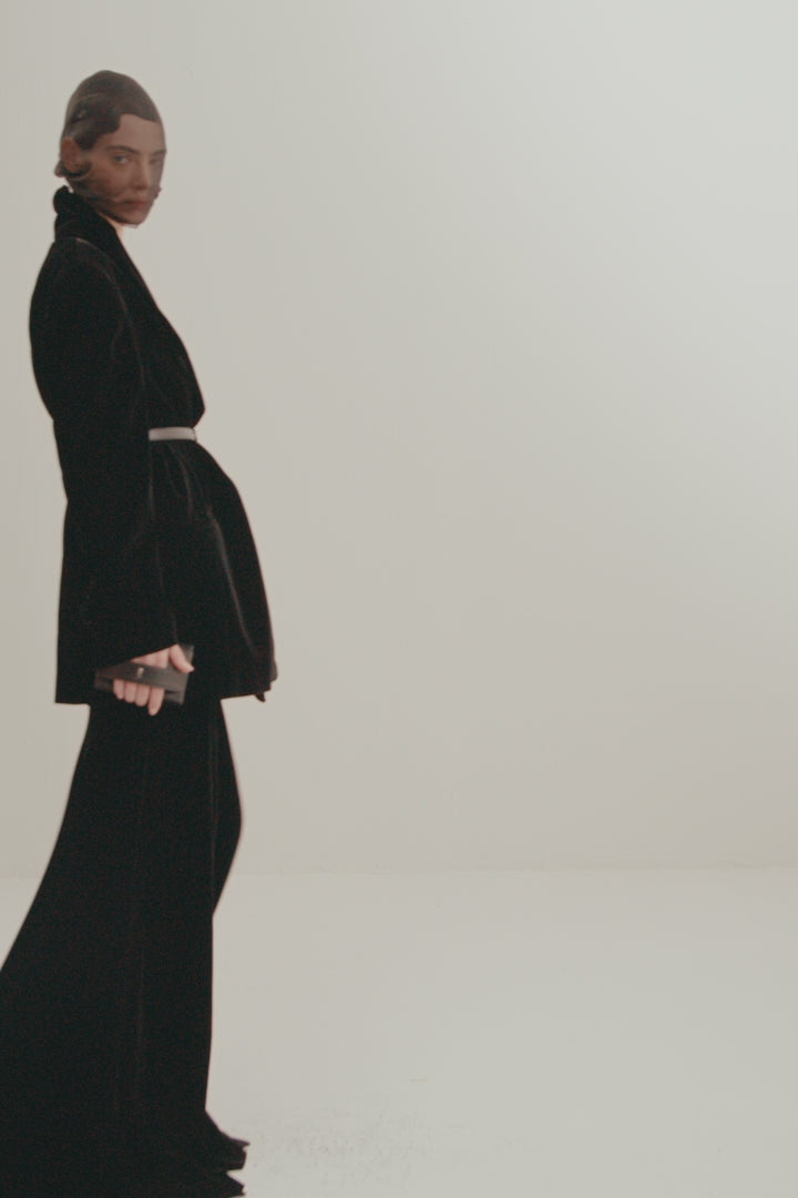 A corseted waist shaping deep black velvet — structure meeting softness, refinement flowing into movement. A silhouette defined by quiet strength and sensual texture.