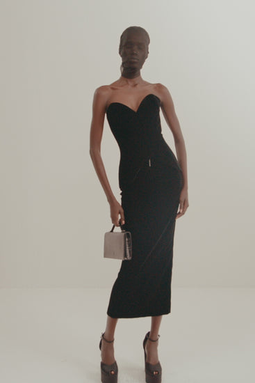 A black velvet pencil skirt cut to a refined midi length — sleek, tactile, and effortlessly feminine.