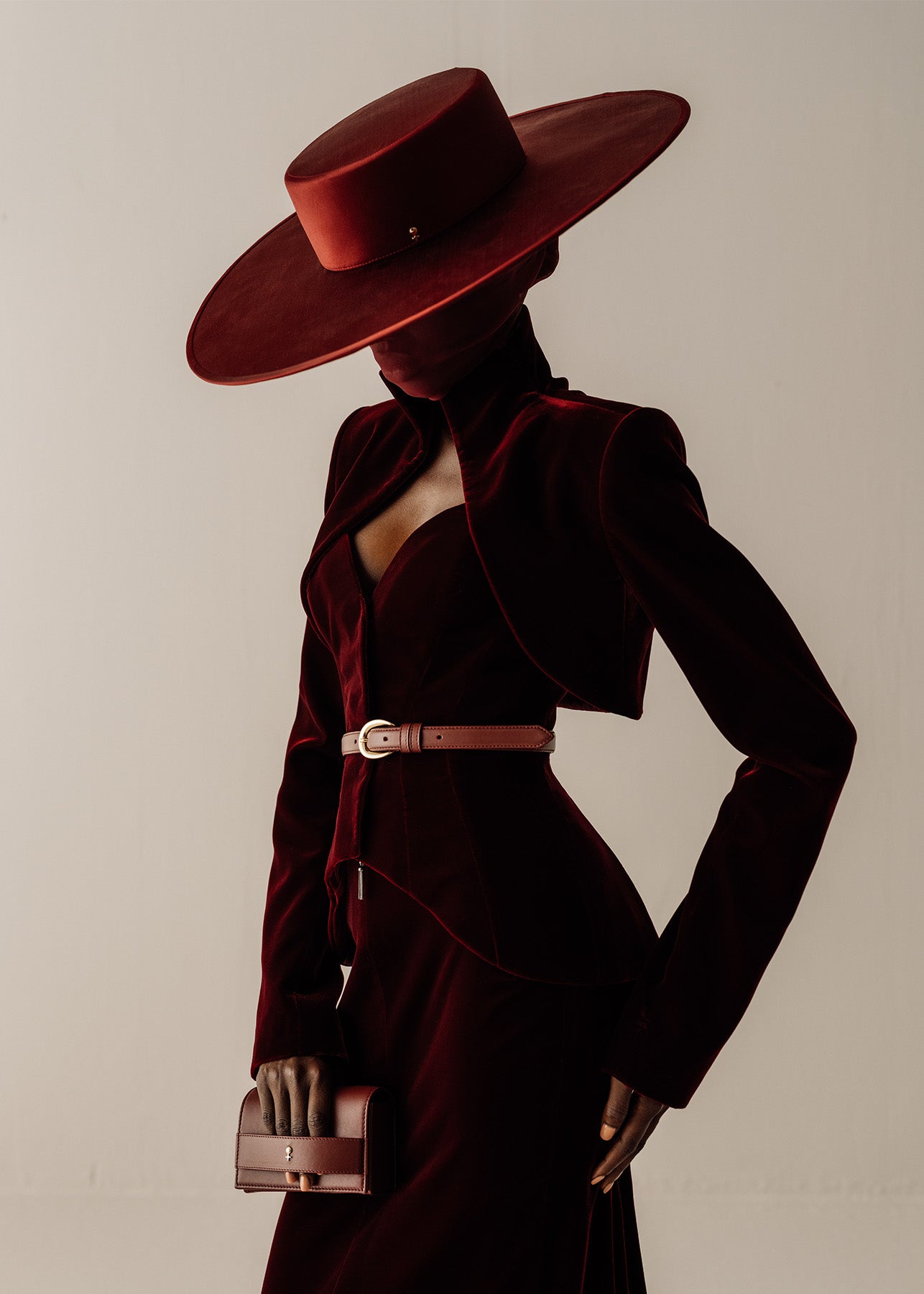 A small sculpted clutch in deep burgundy leather — a tactile gesture of femininity and quiet strength, made to accompany you with effortless grace.