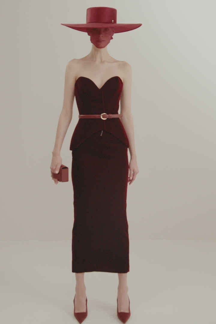 A burgundy velvet pencil skirt cut to a refined midi length — sleek, tactile, and effortlessly feminine.