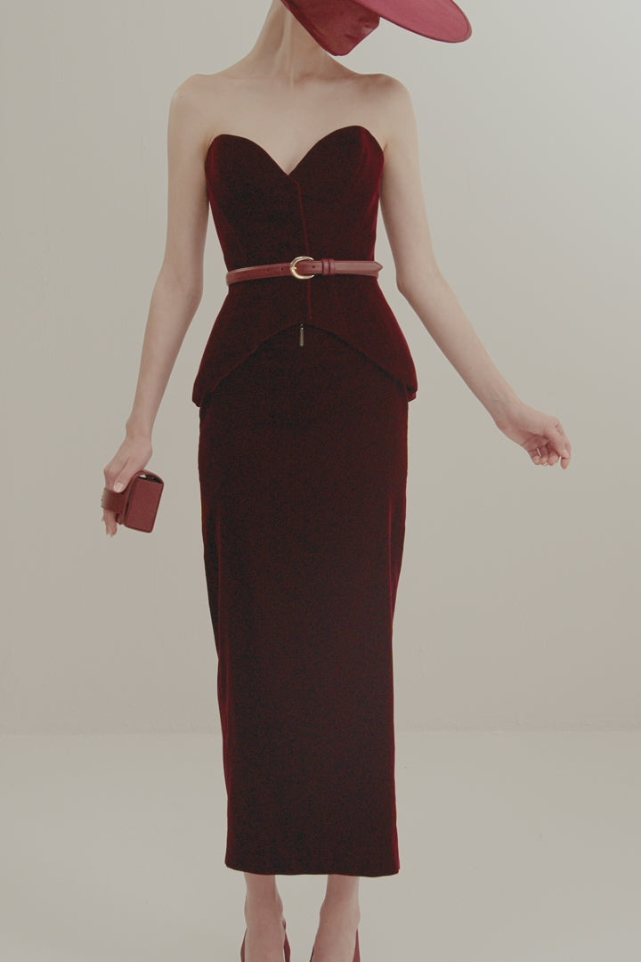 Velvet shaped into a tuxedo corset, opening at the front like a quiet gesture of confidence. Structured lines meet soft texture, creating a silhouette both strong and feminine.