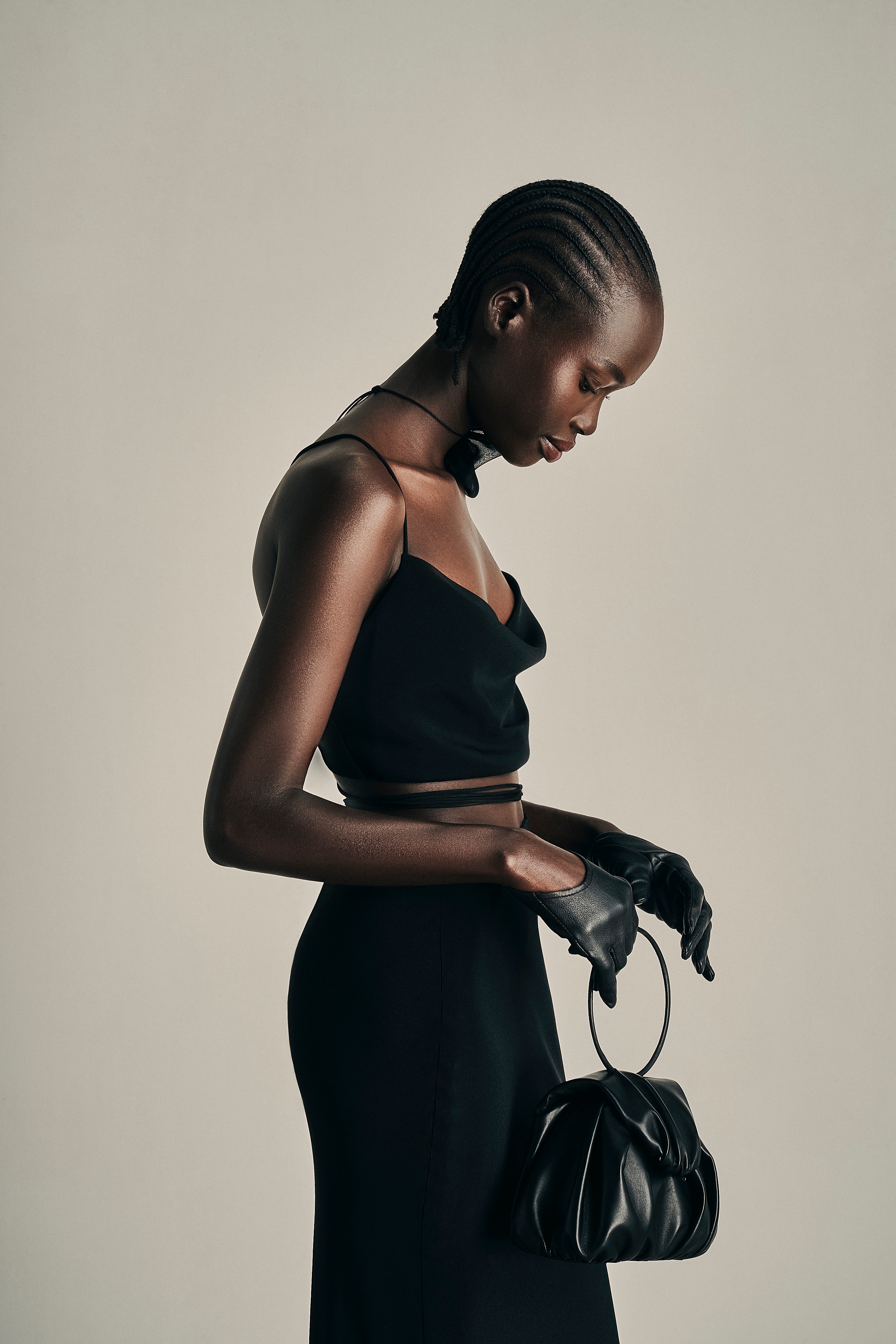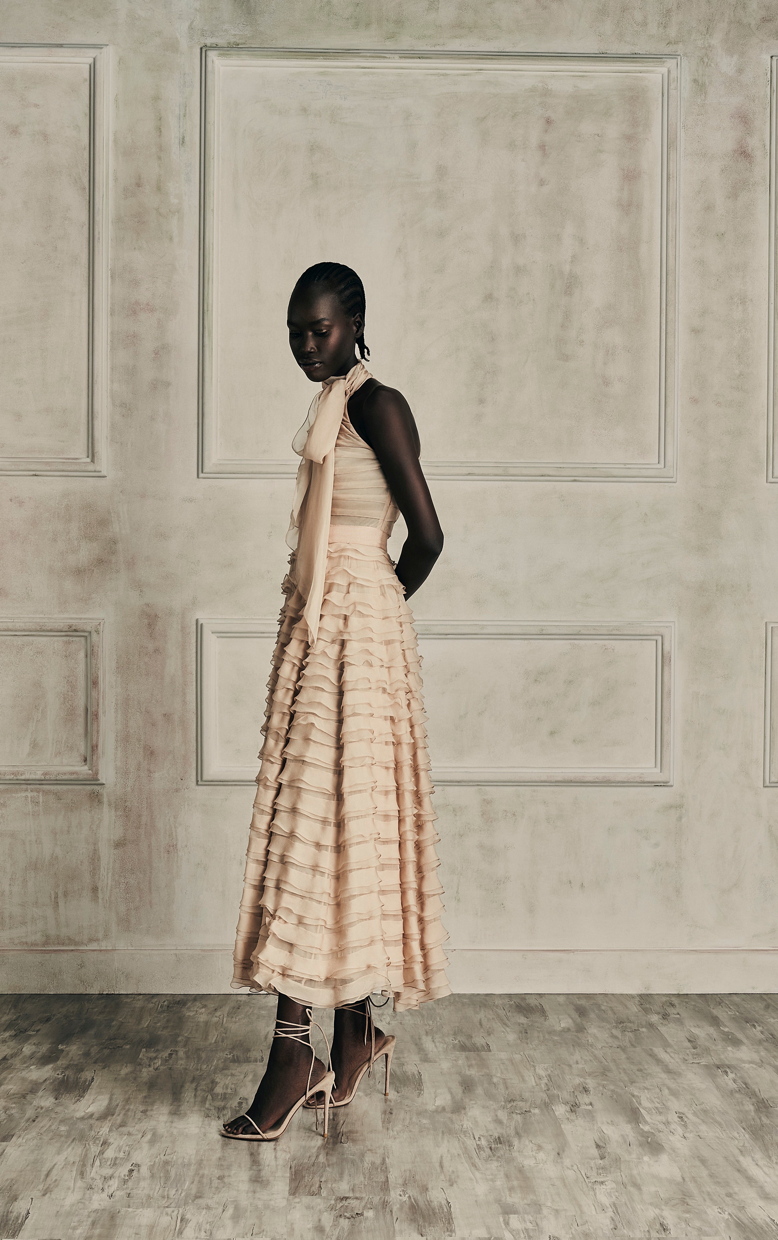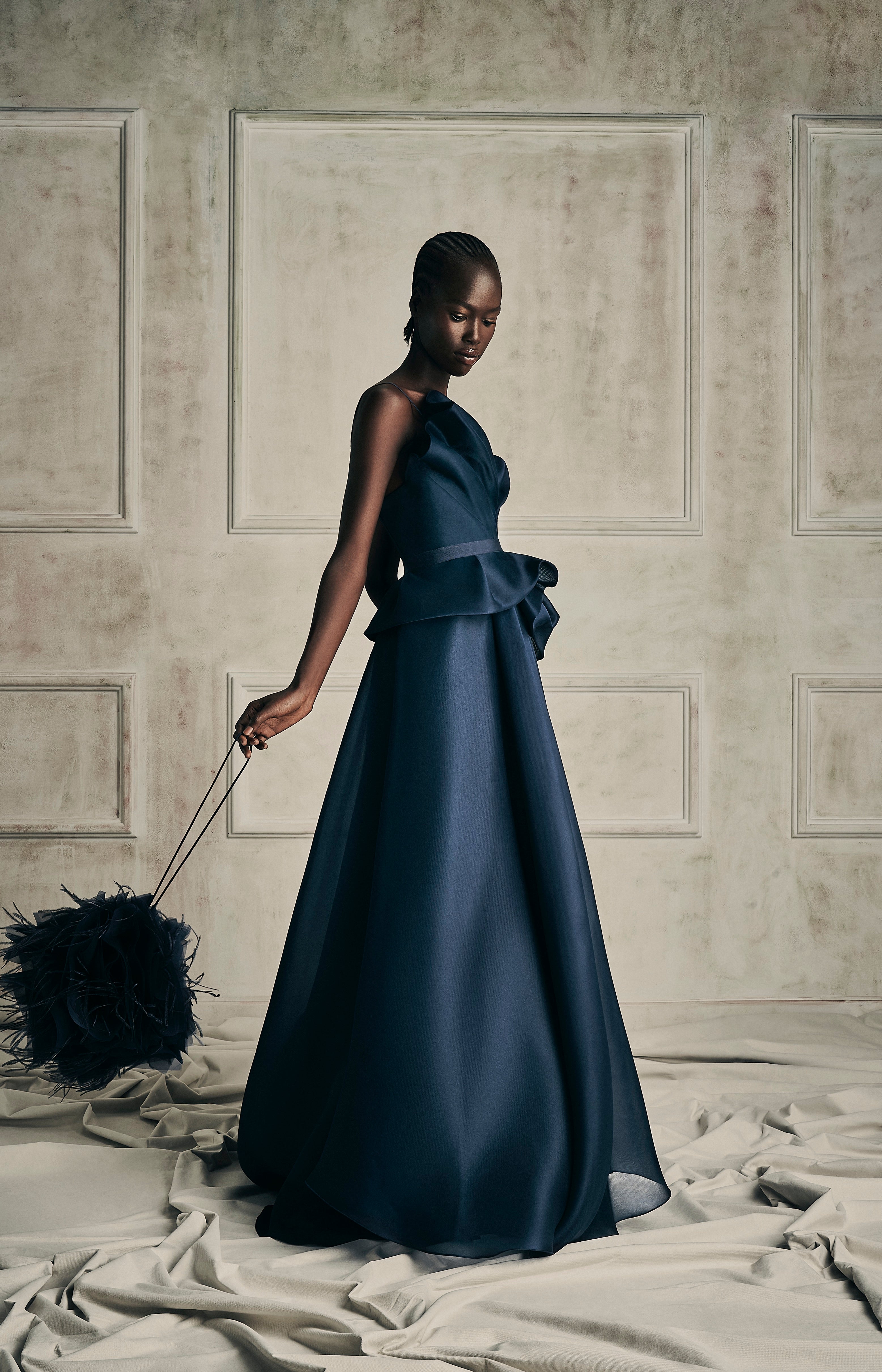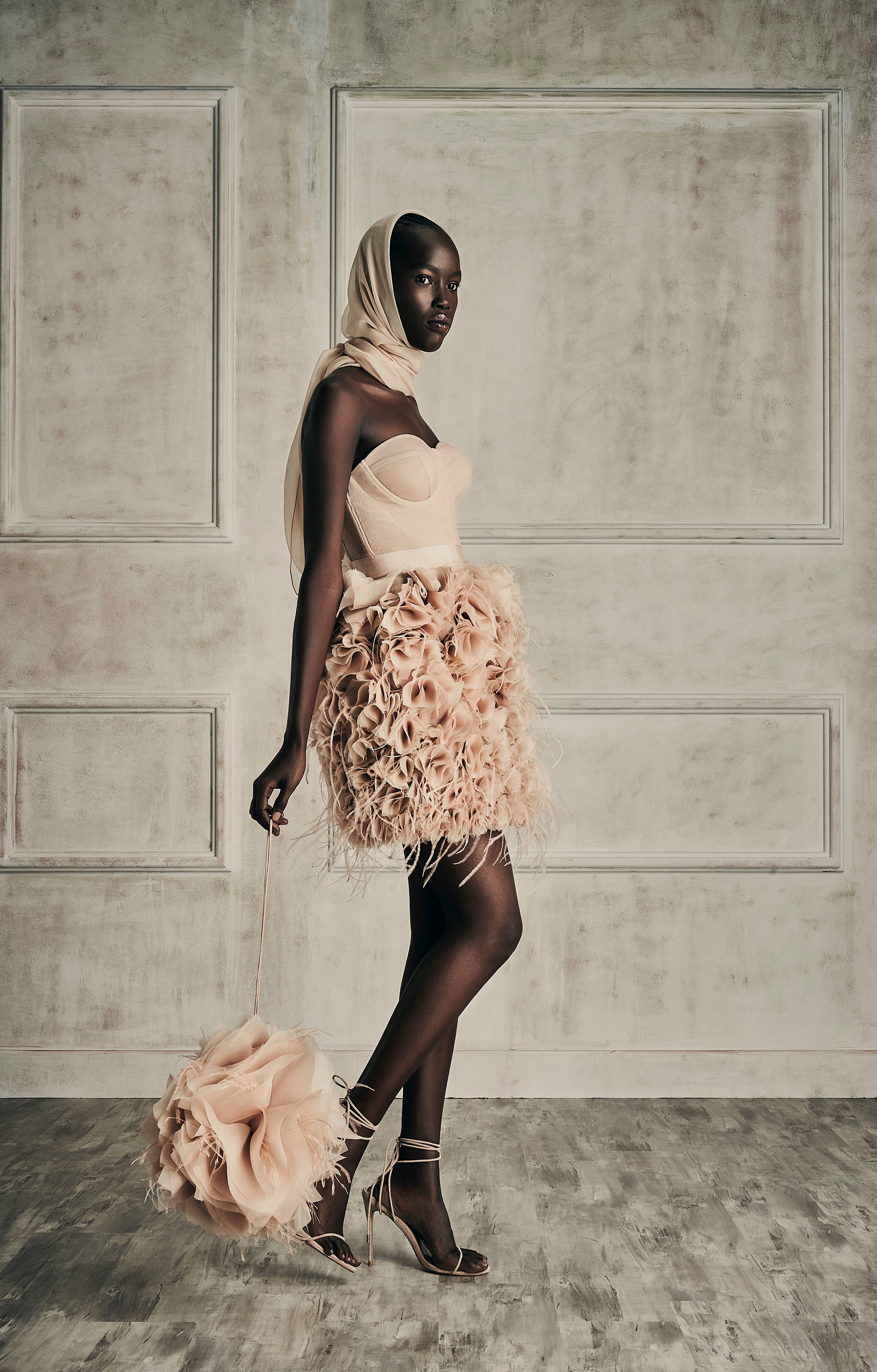 The embodiment of timeless shade of nudes, white cream canvas, midnight blue and intense black encapsulating the multifaceted nature of her femininity.