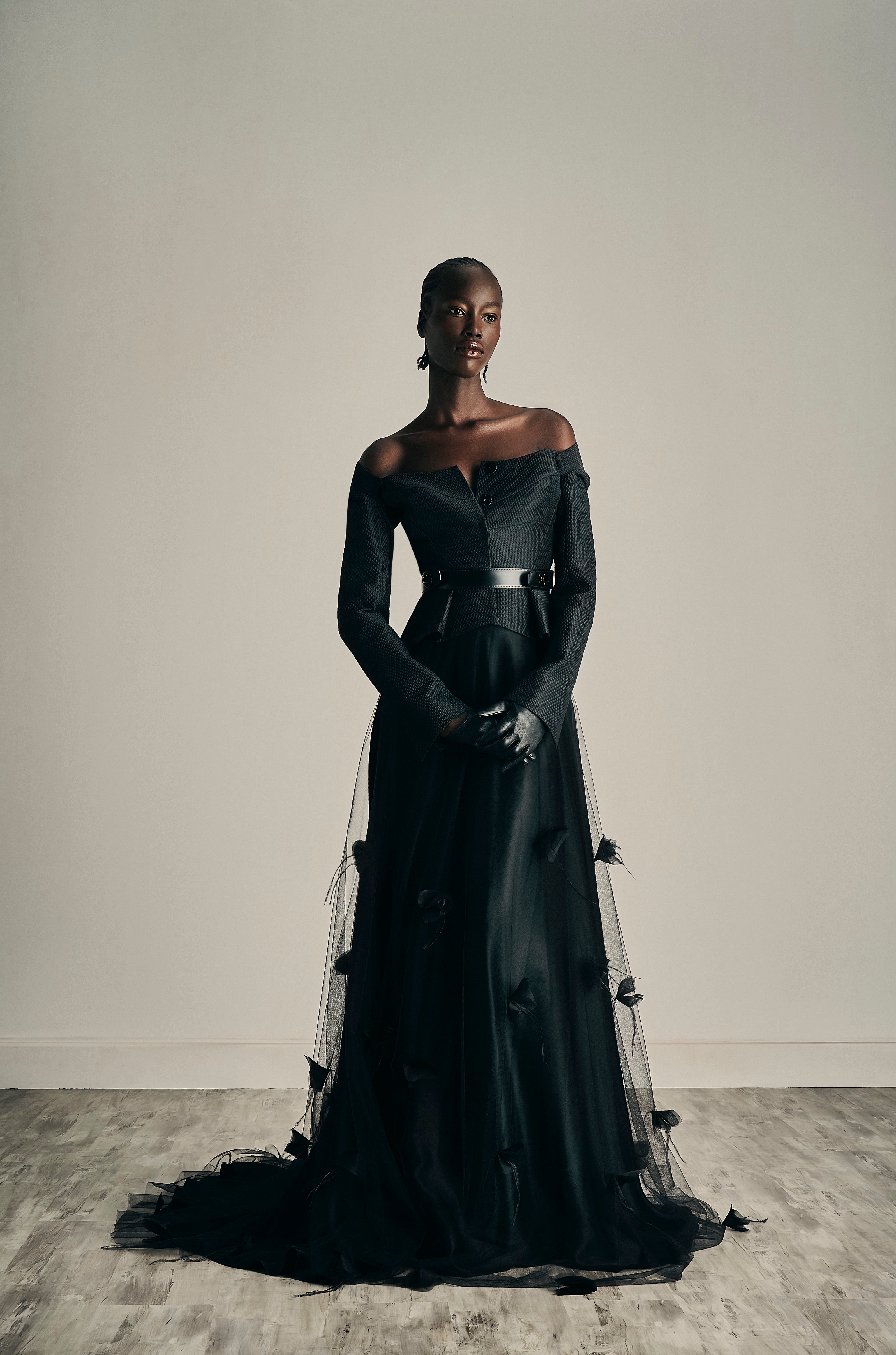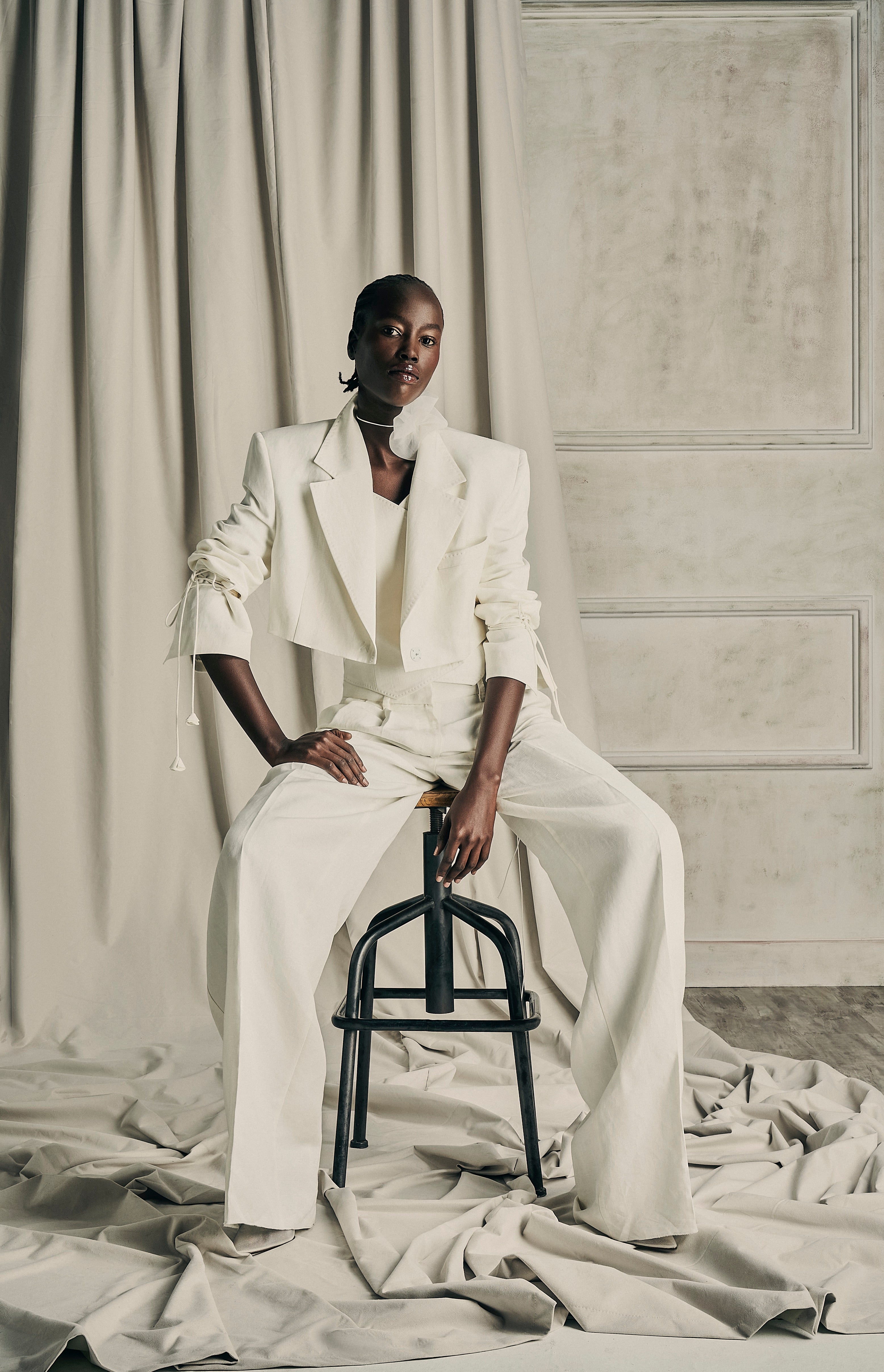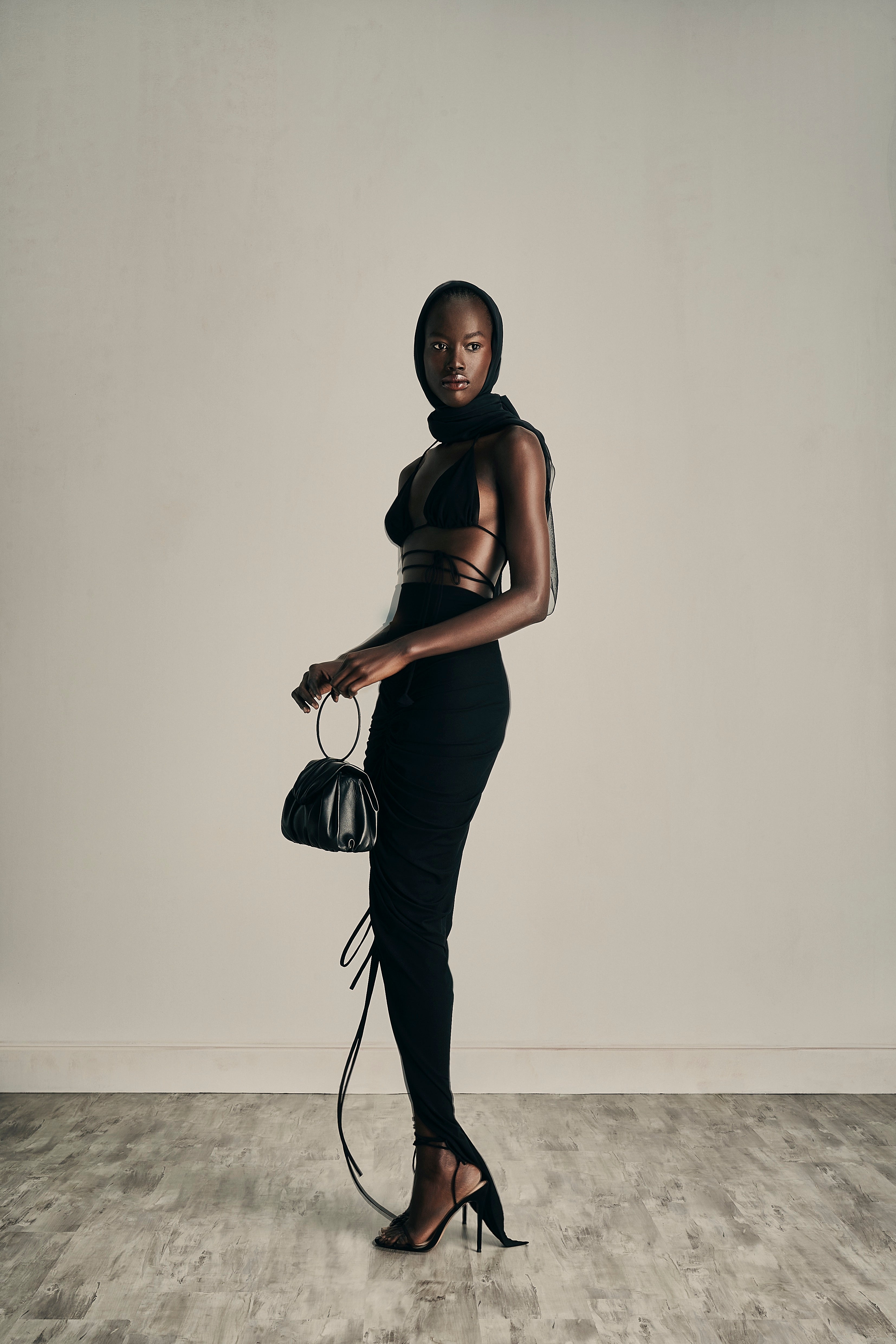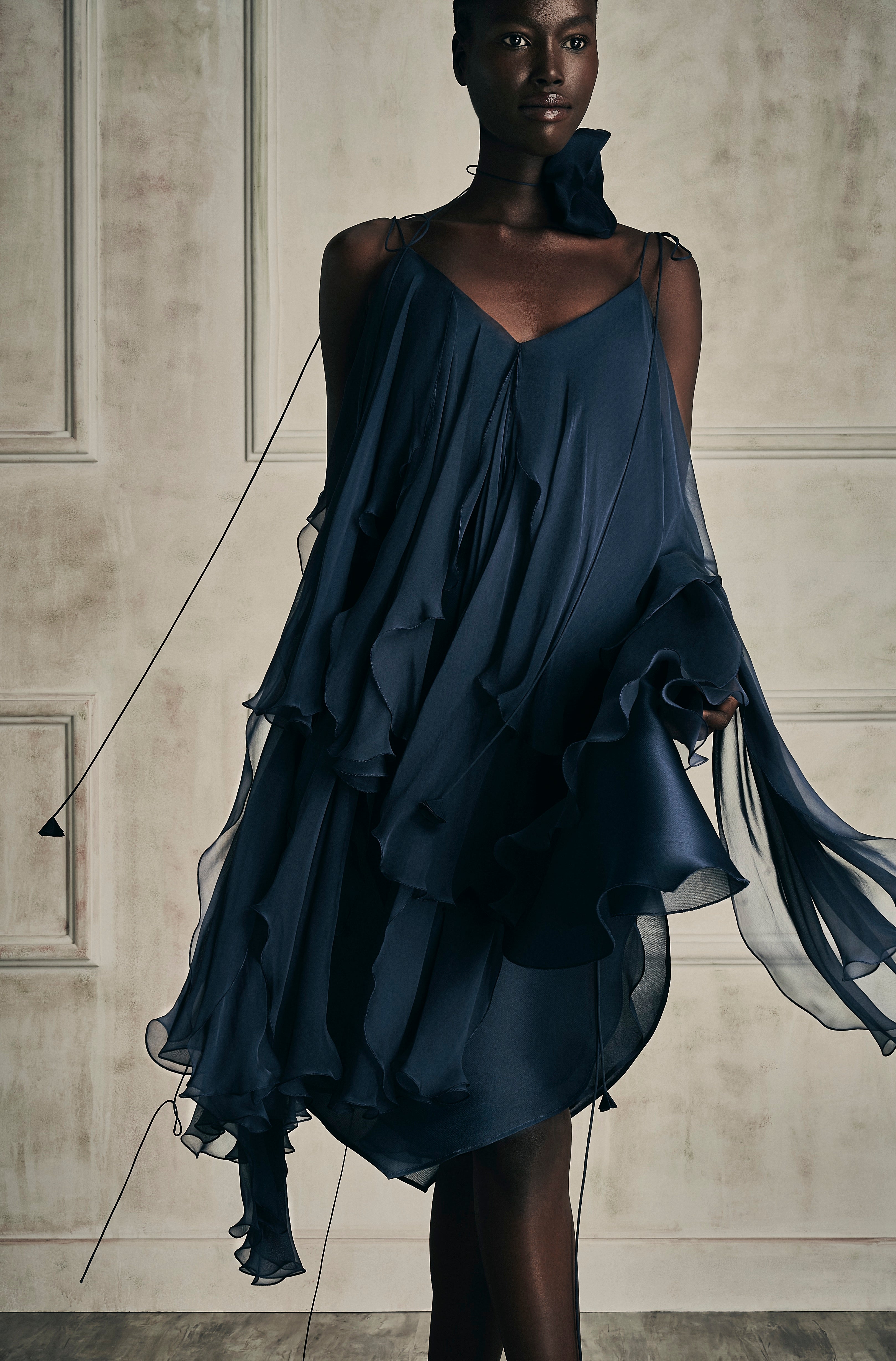 The embodiment of timeless shade of nudes, white cream canvas, midnight blue and intense black encapsulating the multifaceted nature of her femininity.