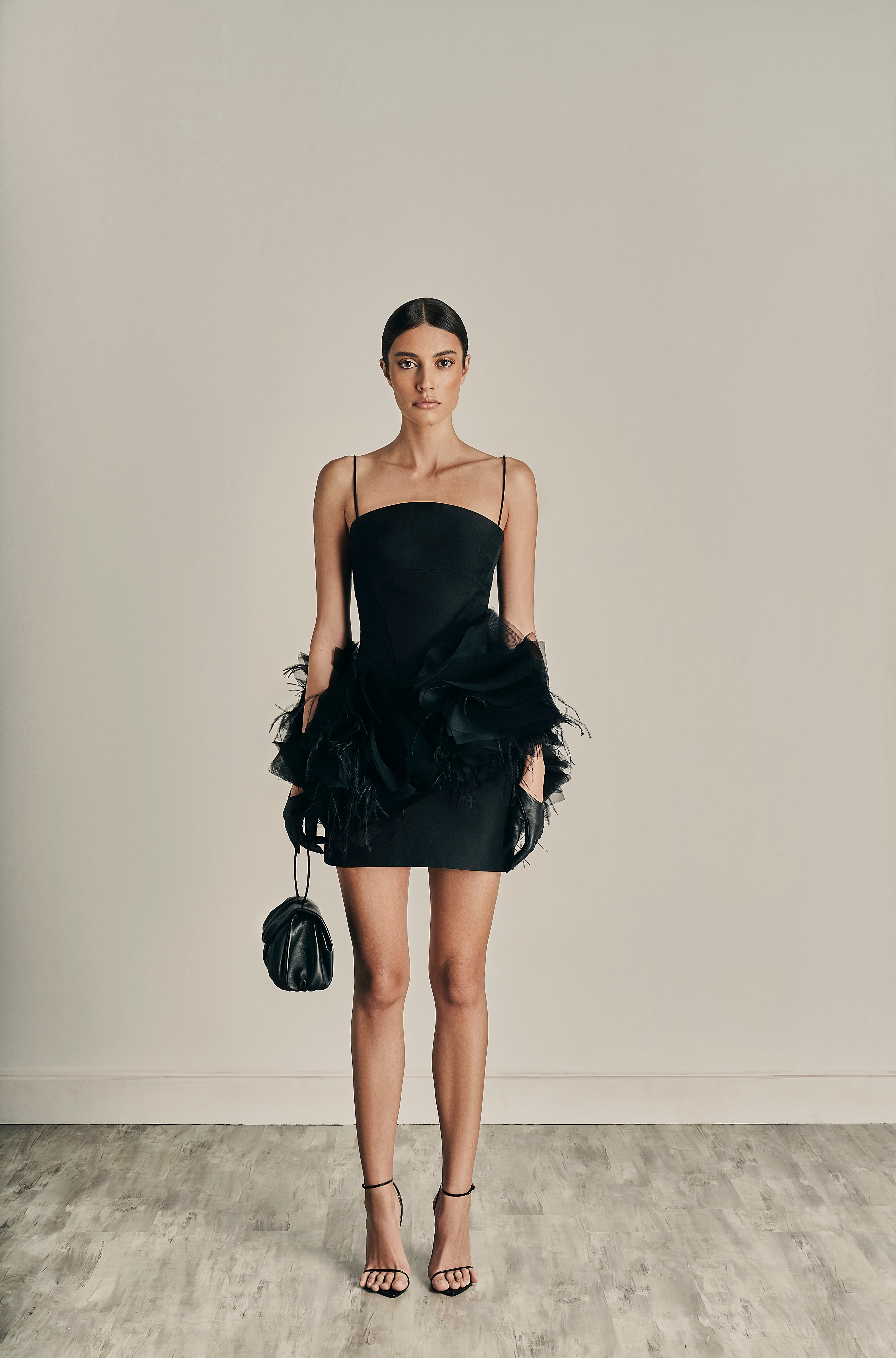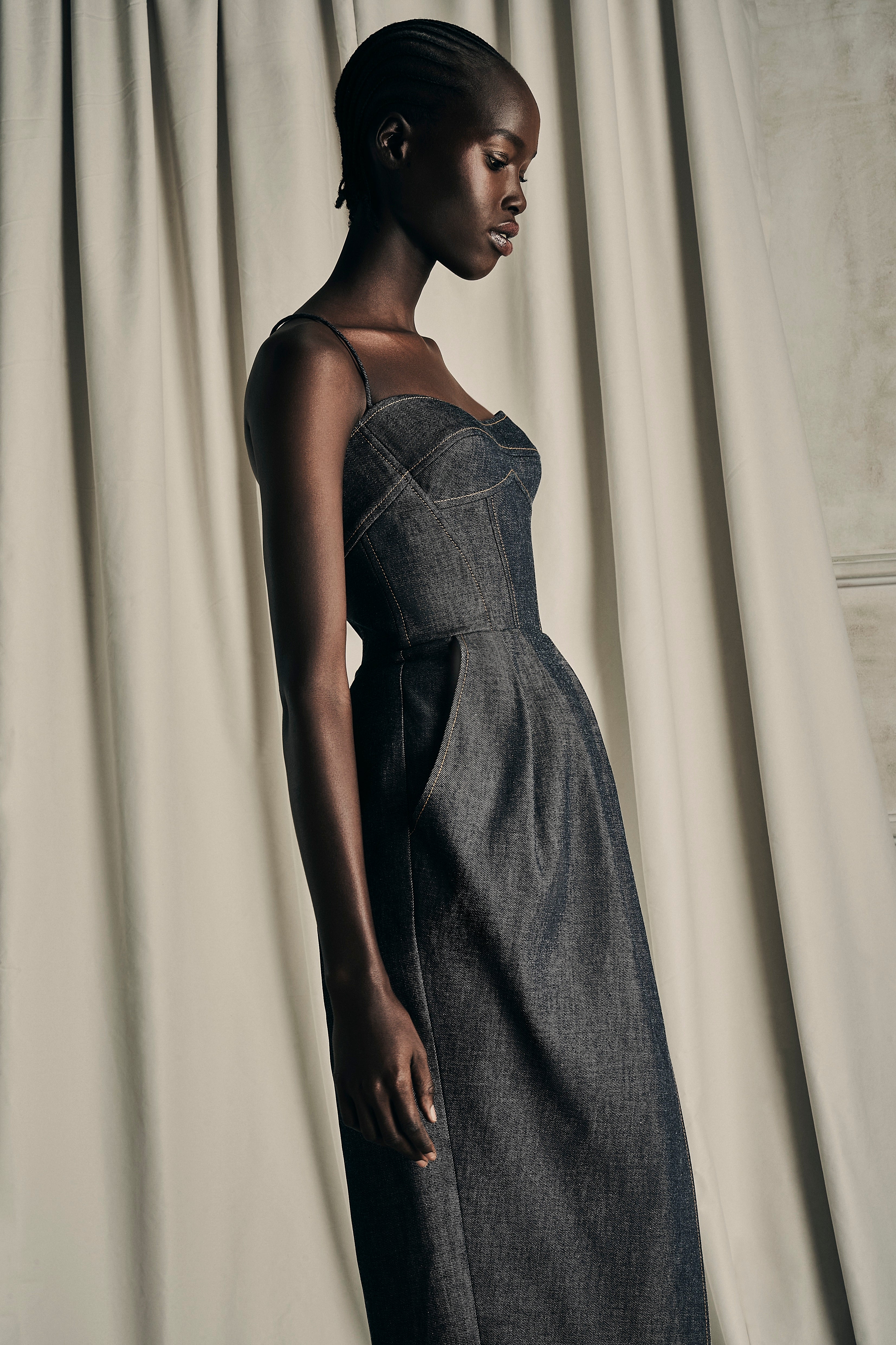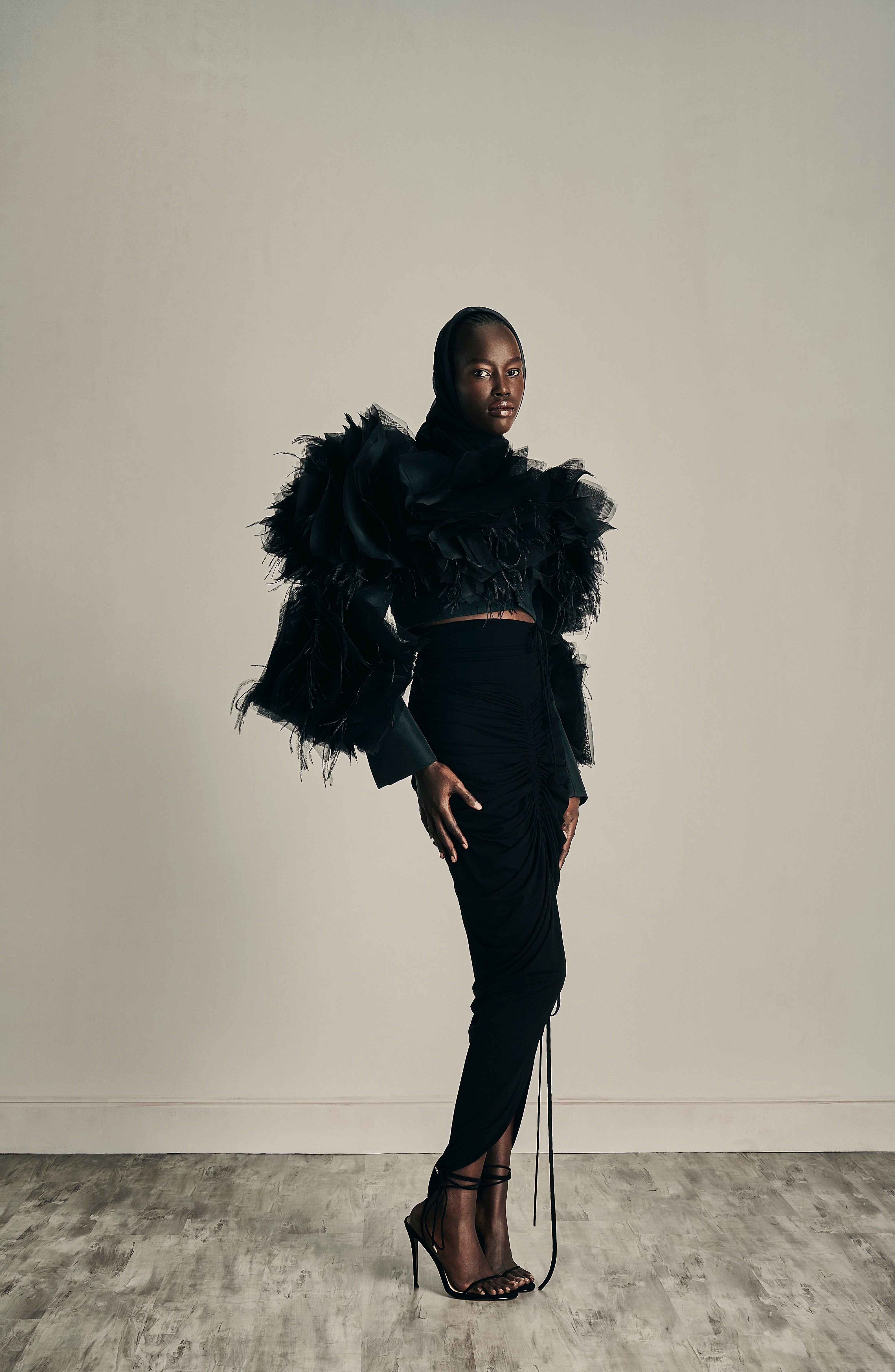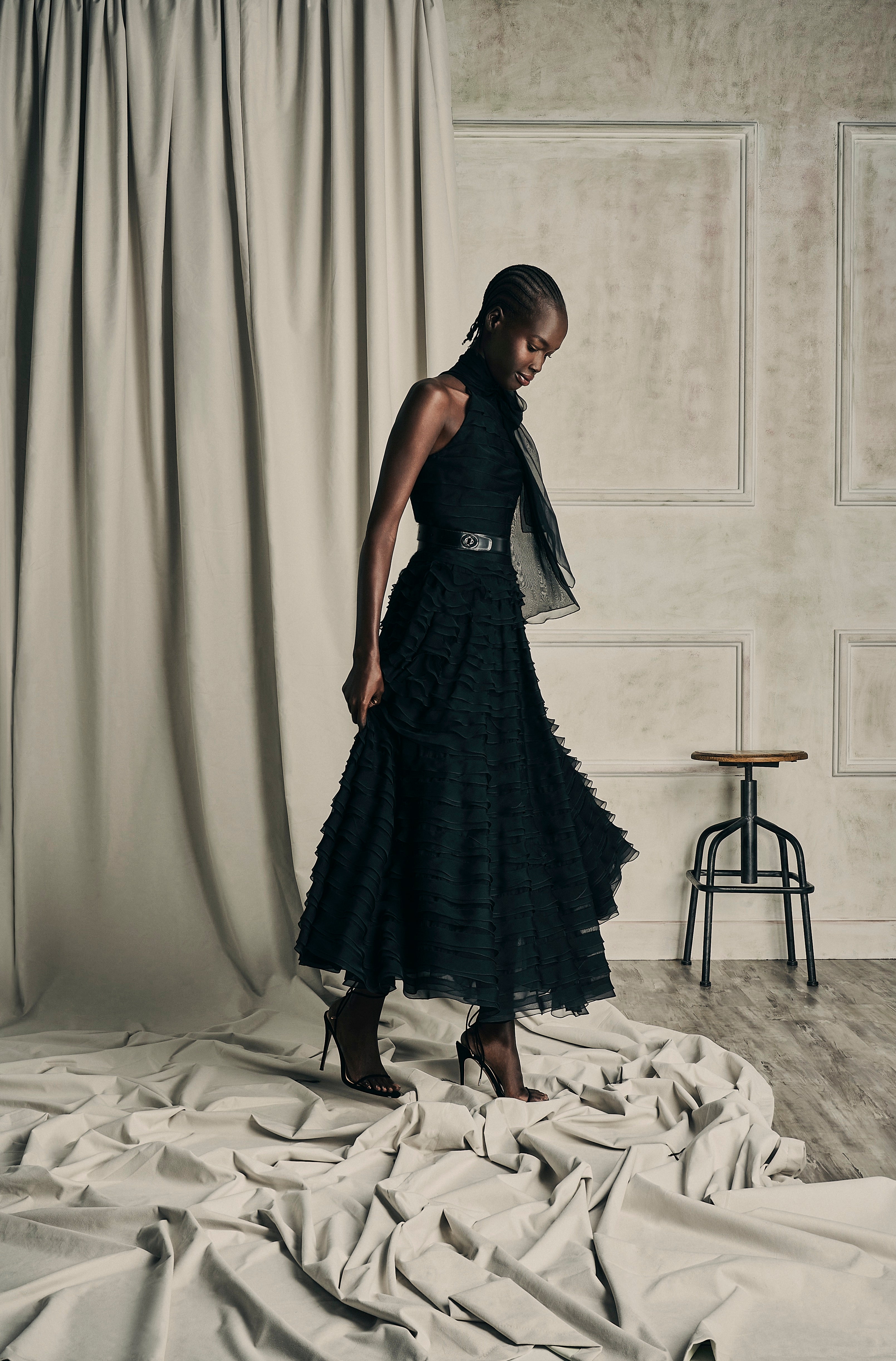 The embodiment of timeless shade of nudes, white cream canvas, midnight blue and intense black encapsulating the multifaceted nature of her femininity.