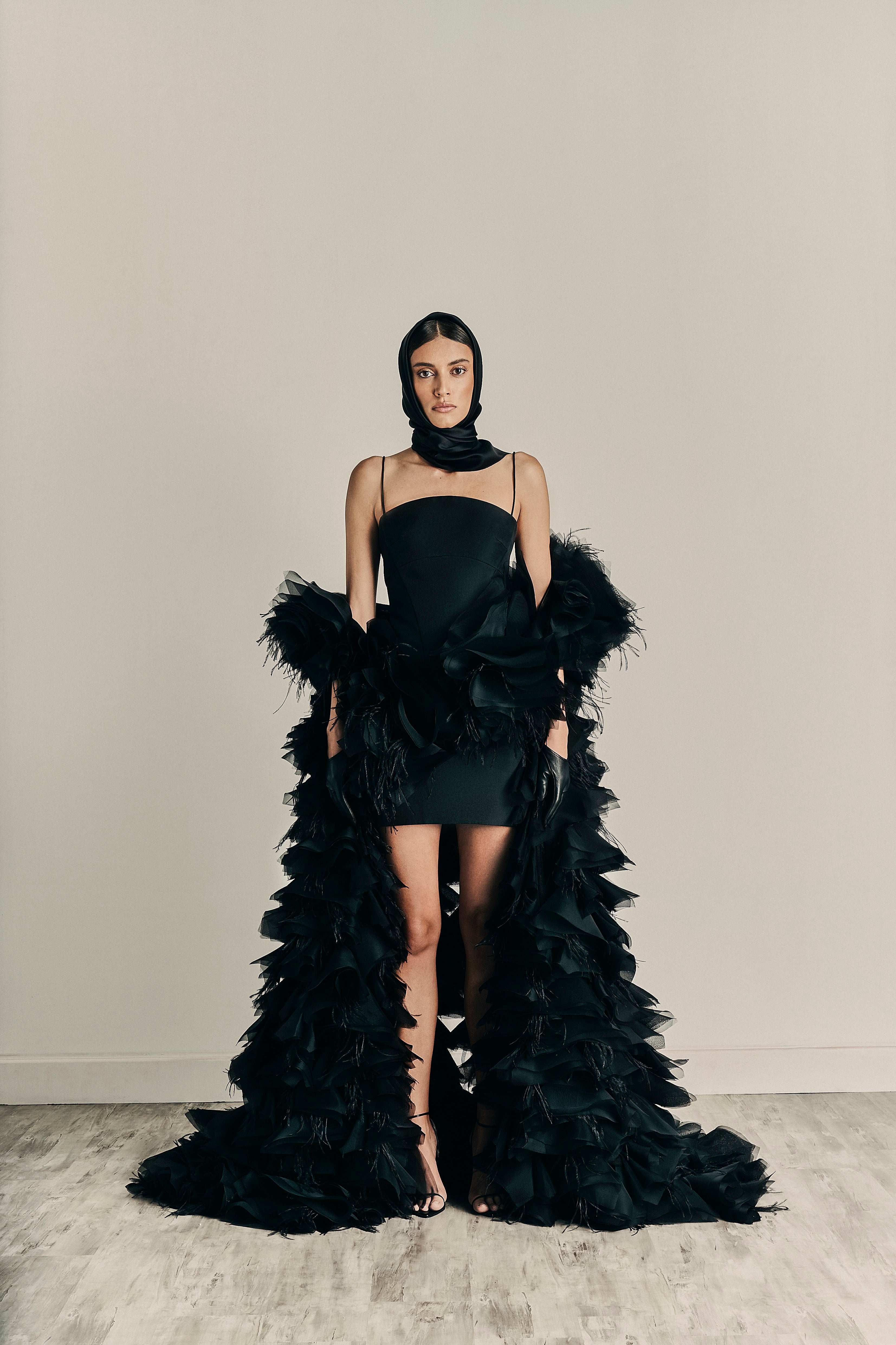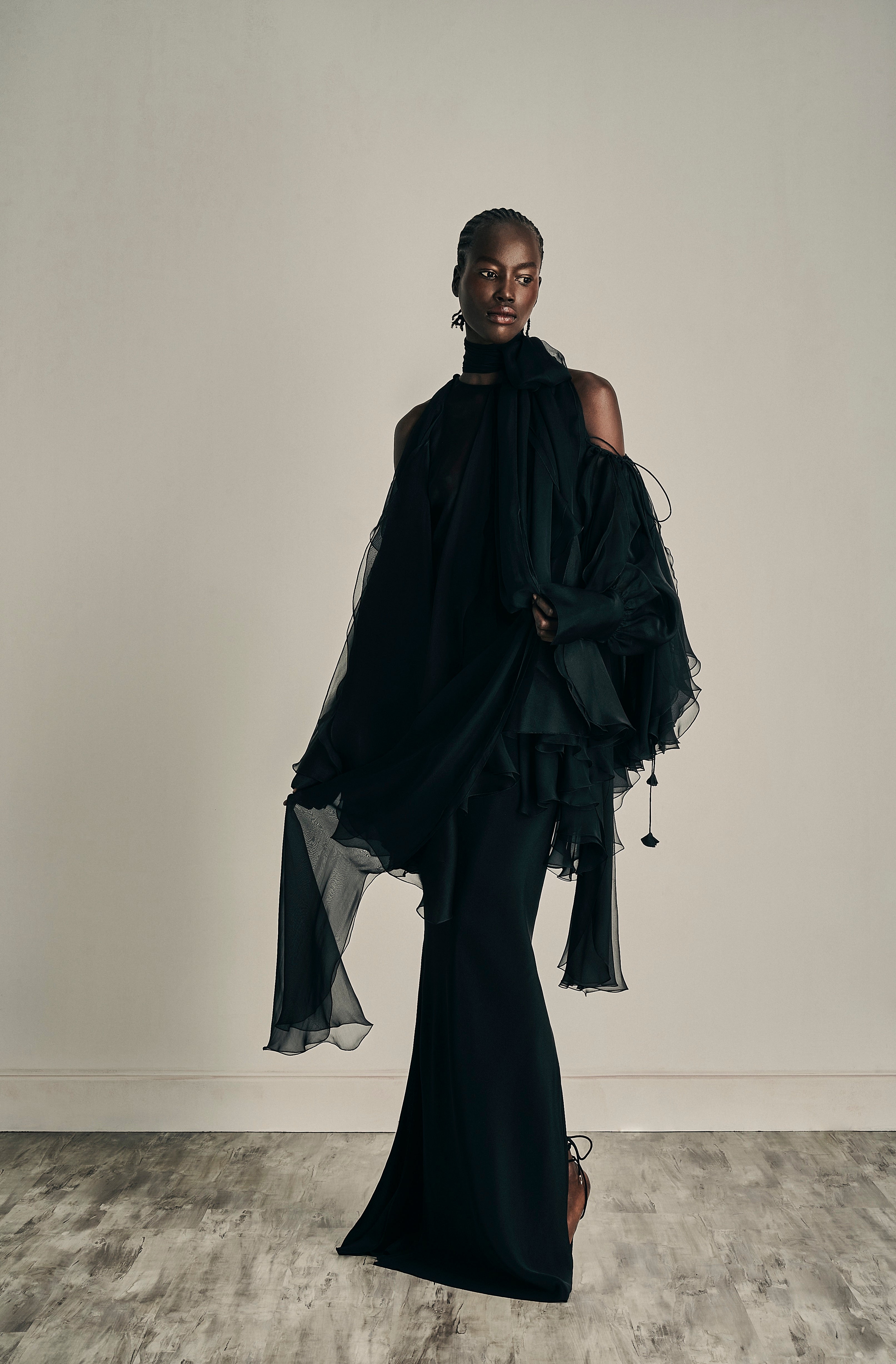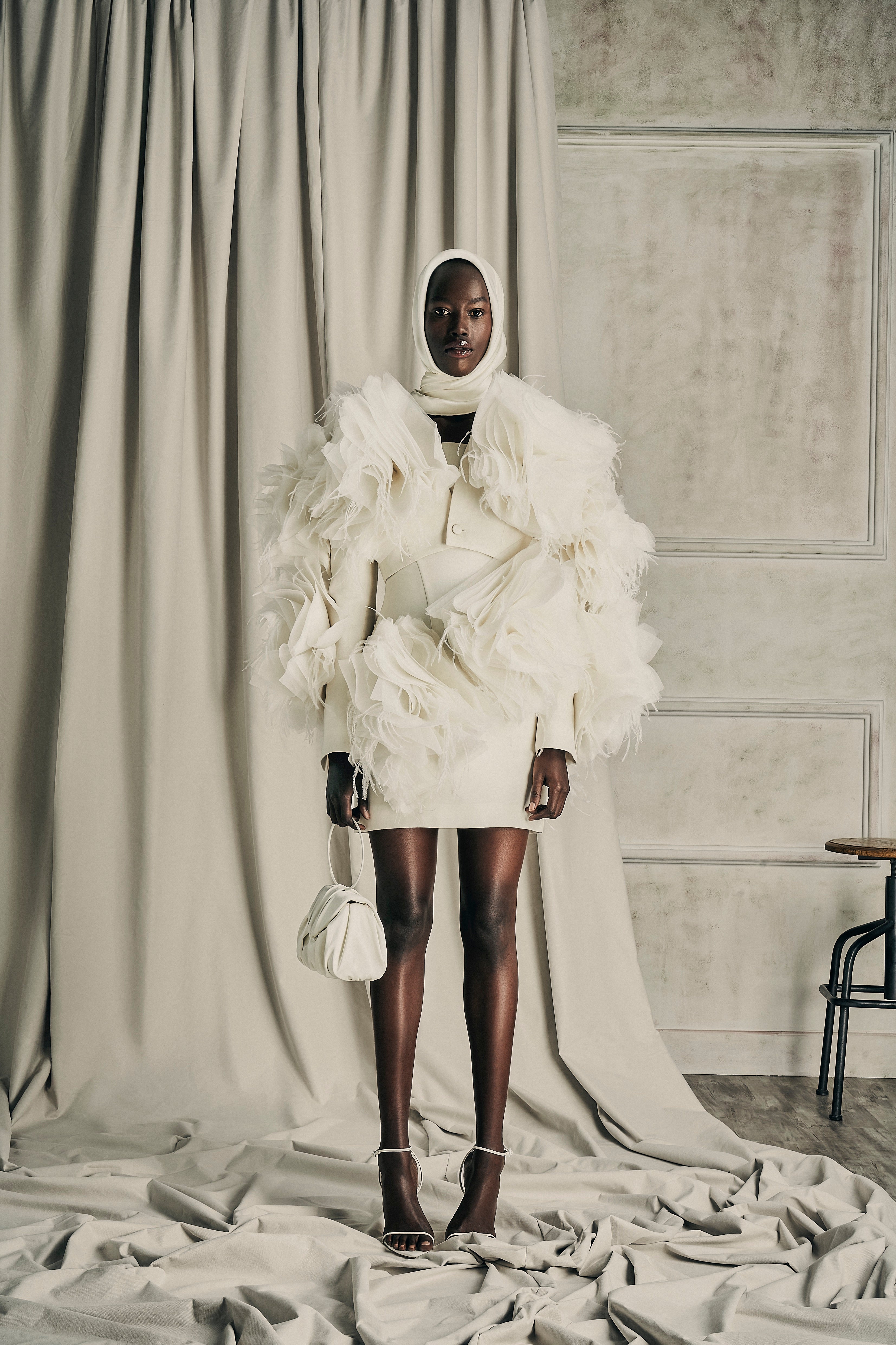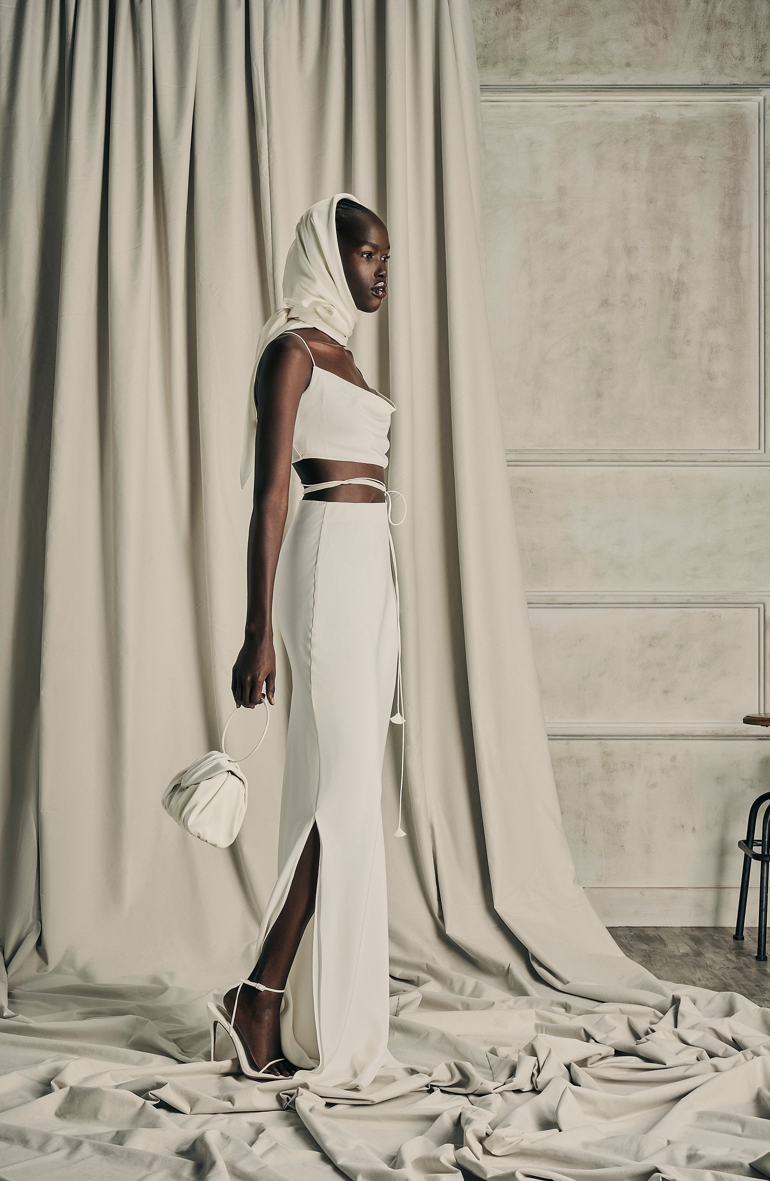 Exquisite assemblage of garments drawn into elongated and monochrome silhouettes paired with weightless and flowy movement. Her transparency as a soul created around the fabric, a soft narrative of dreams to discover the delicate enveloped femininity.