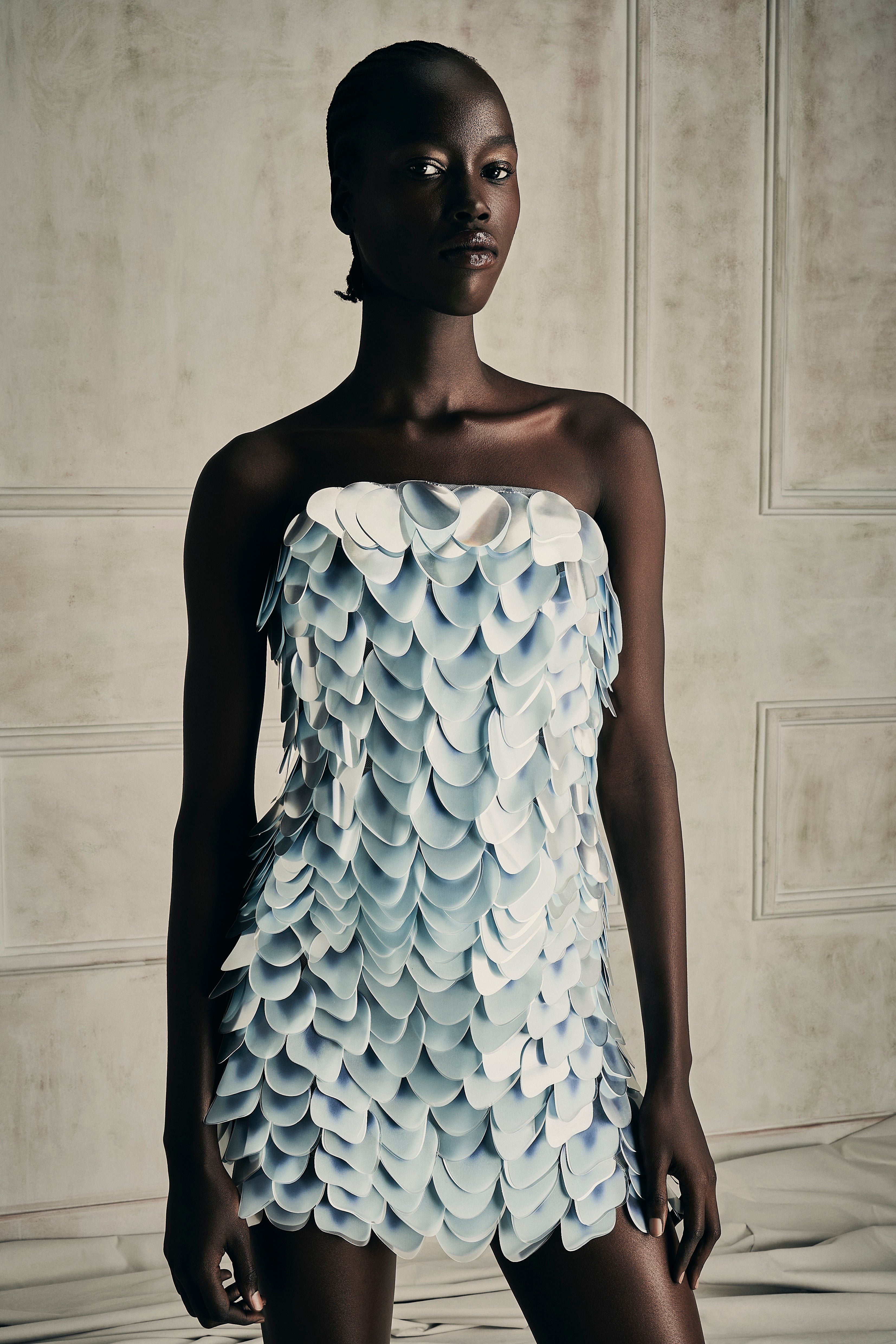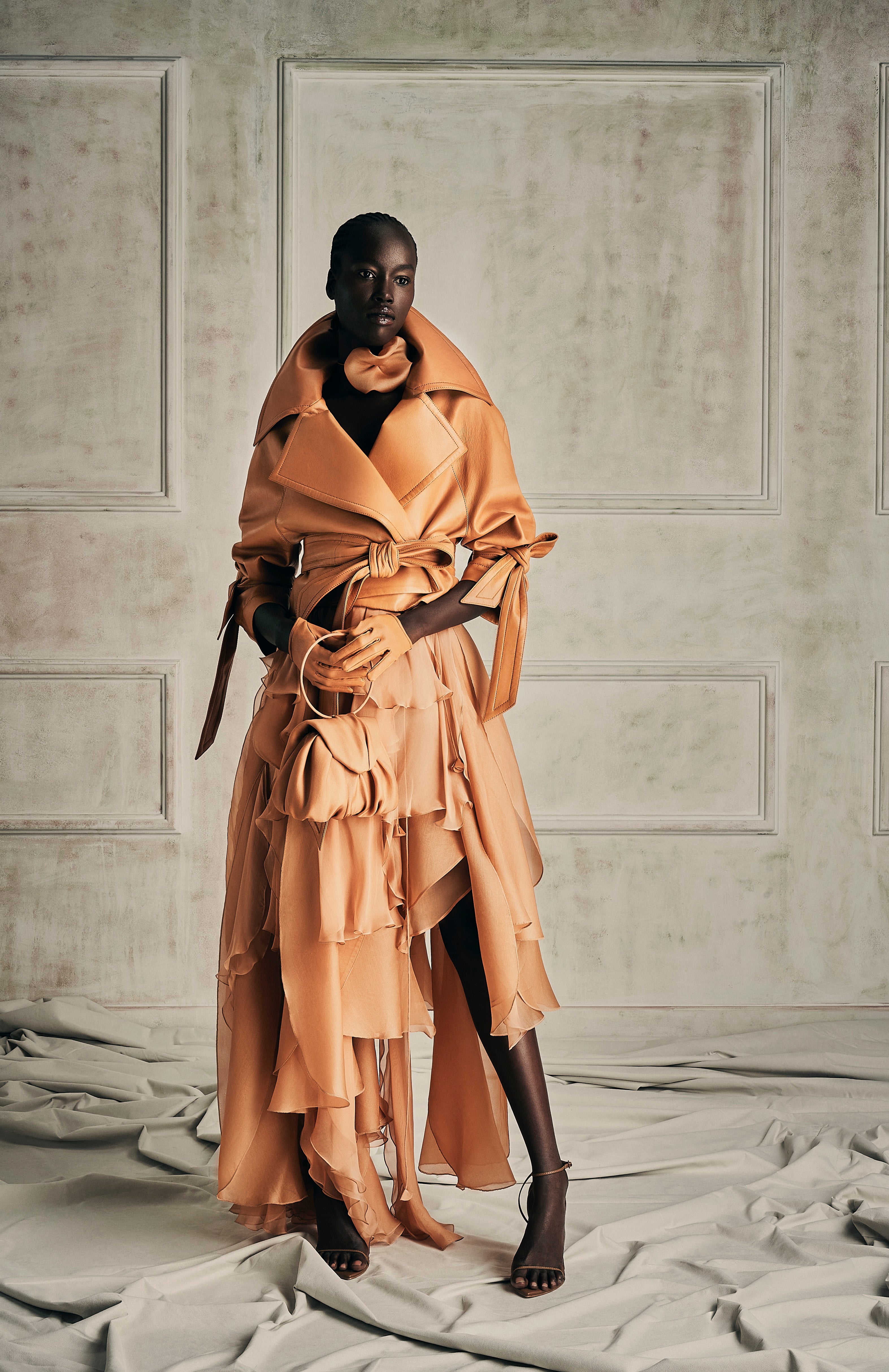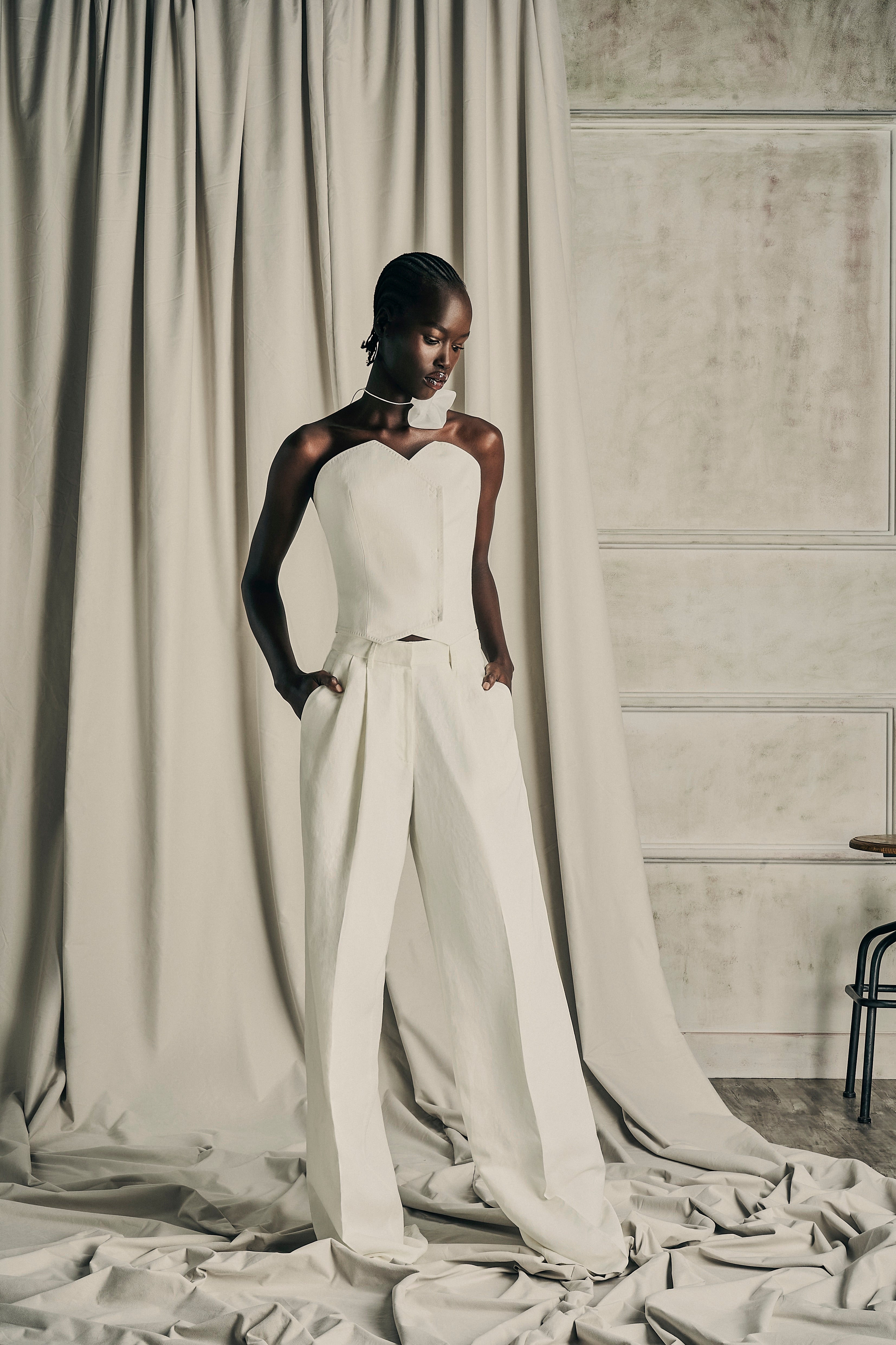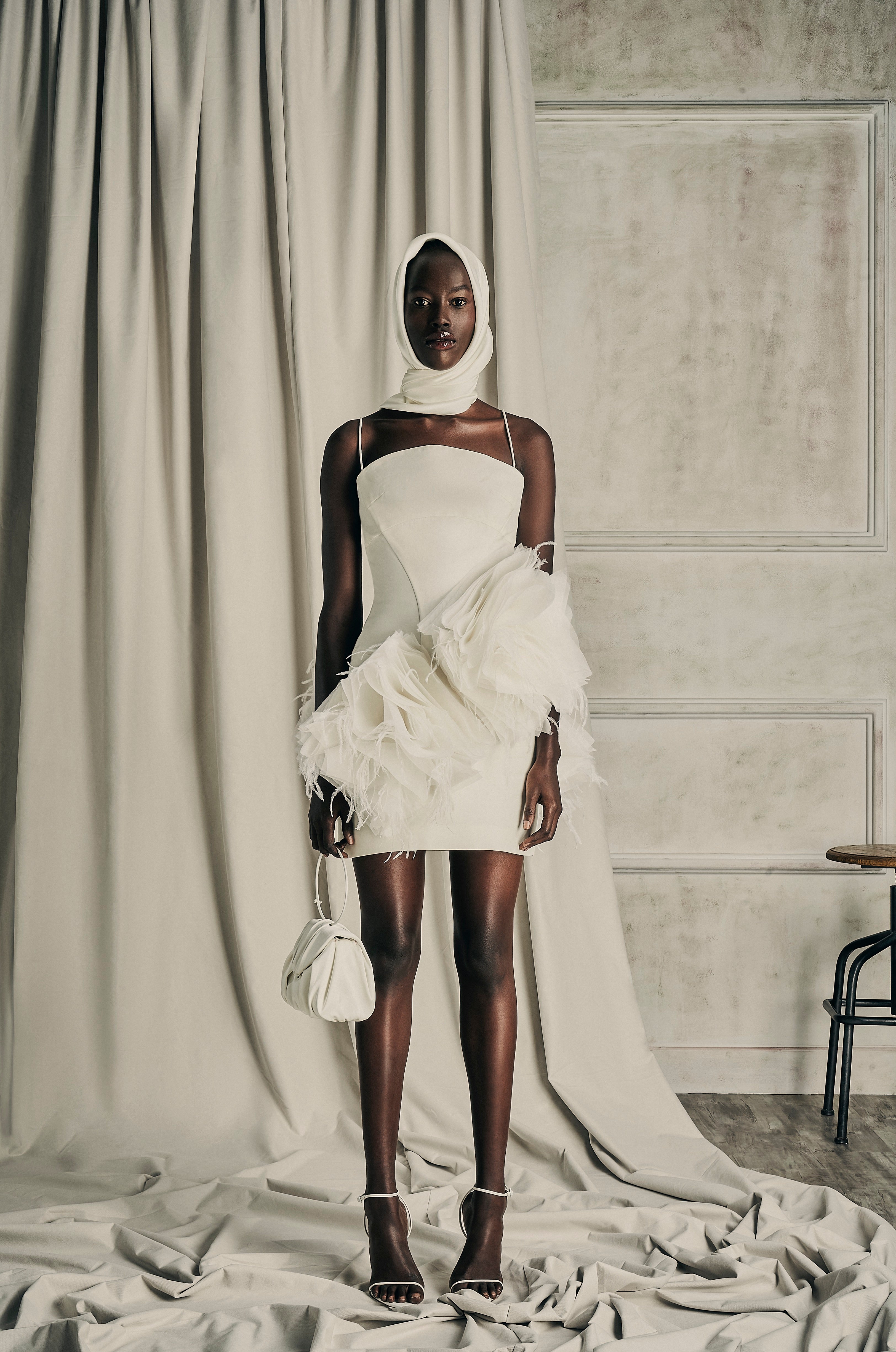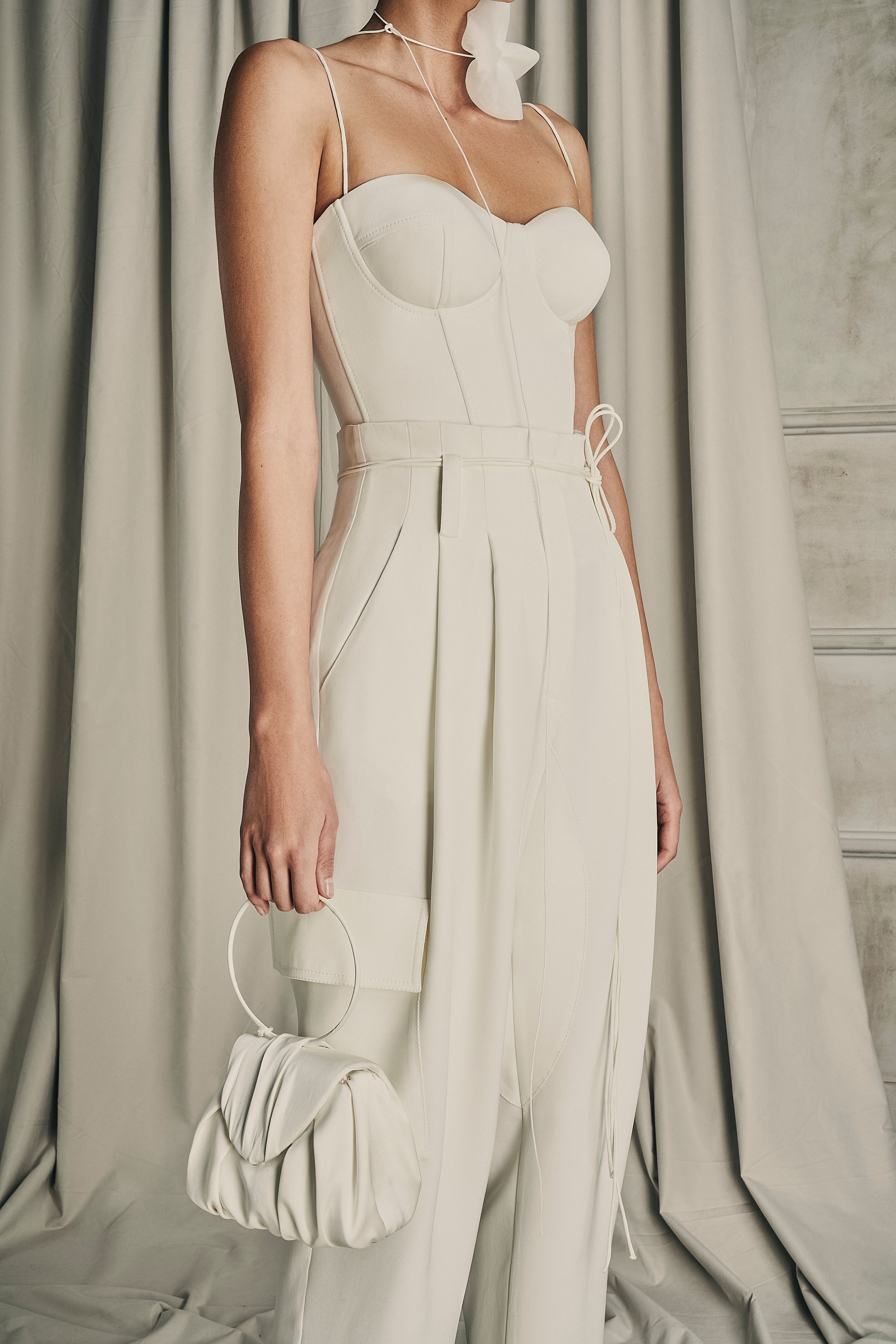 Exquisite assemblage of garments drawn into elongated and monochrome silhouettes paired with weightless and flowy movement. Her transparency as a soul created around the fabric, a soft narrative of dreams to discover the delicate enveloped femininity.