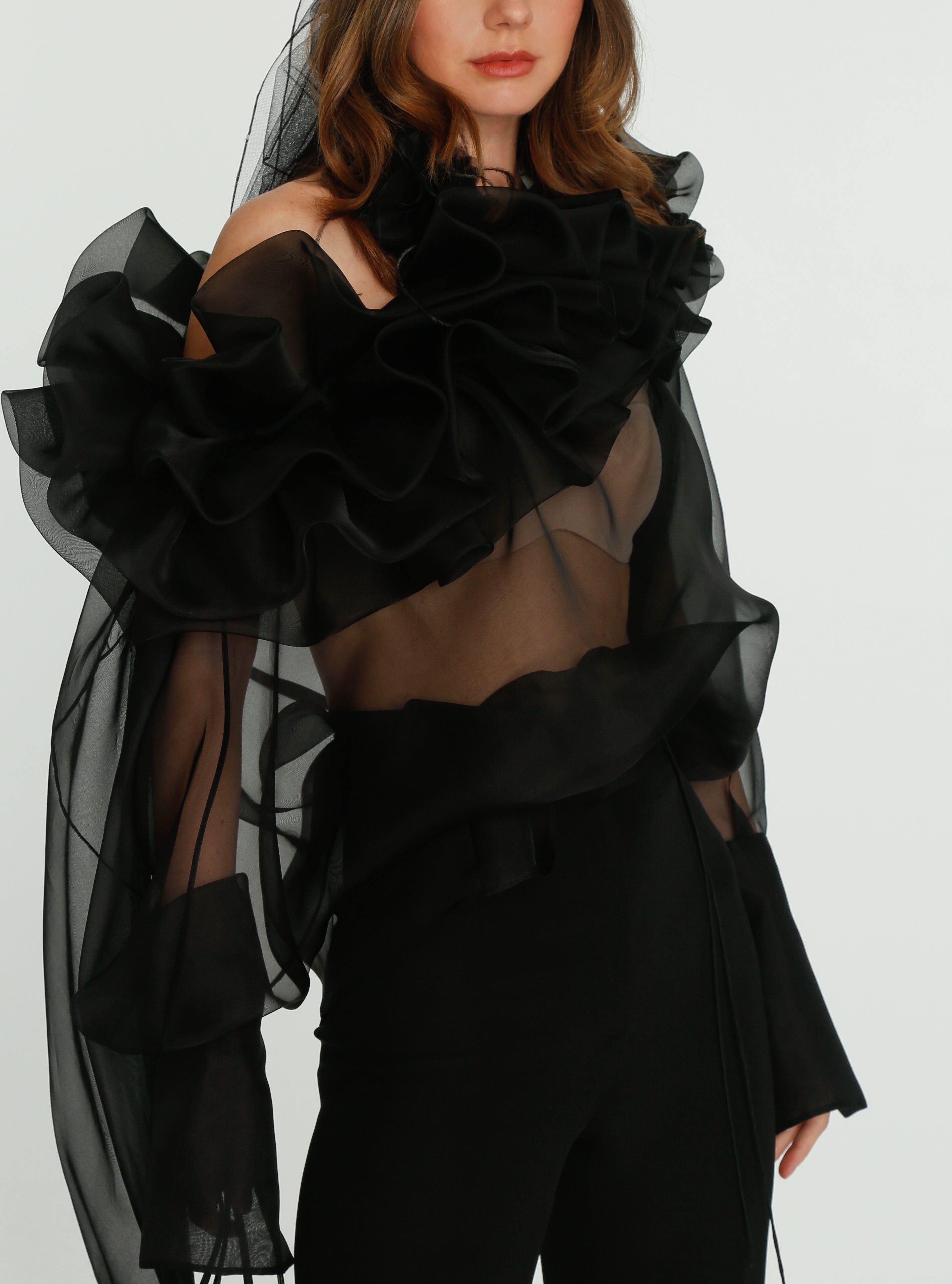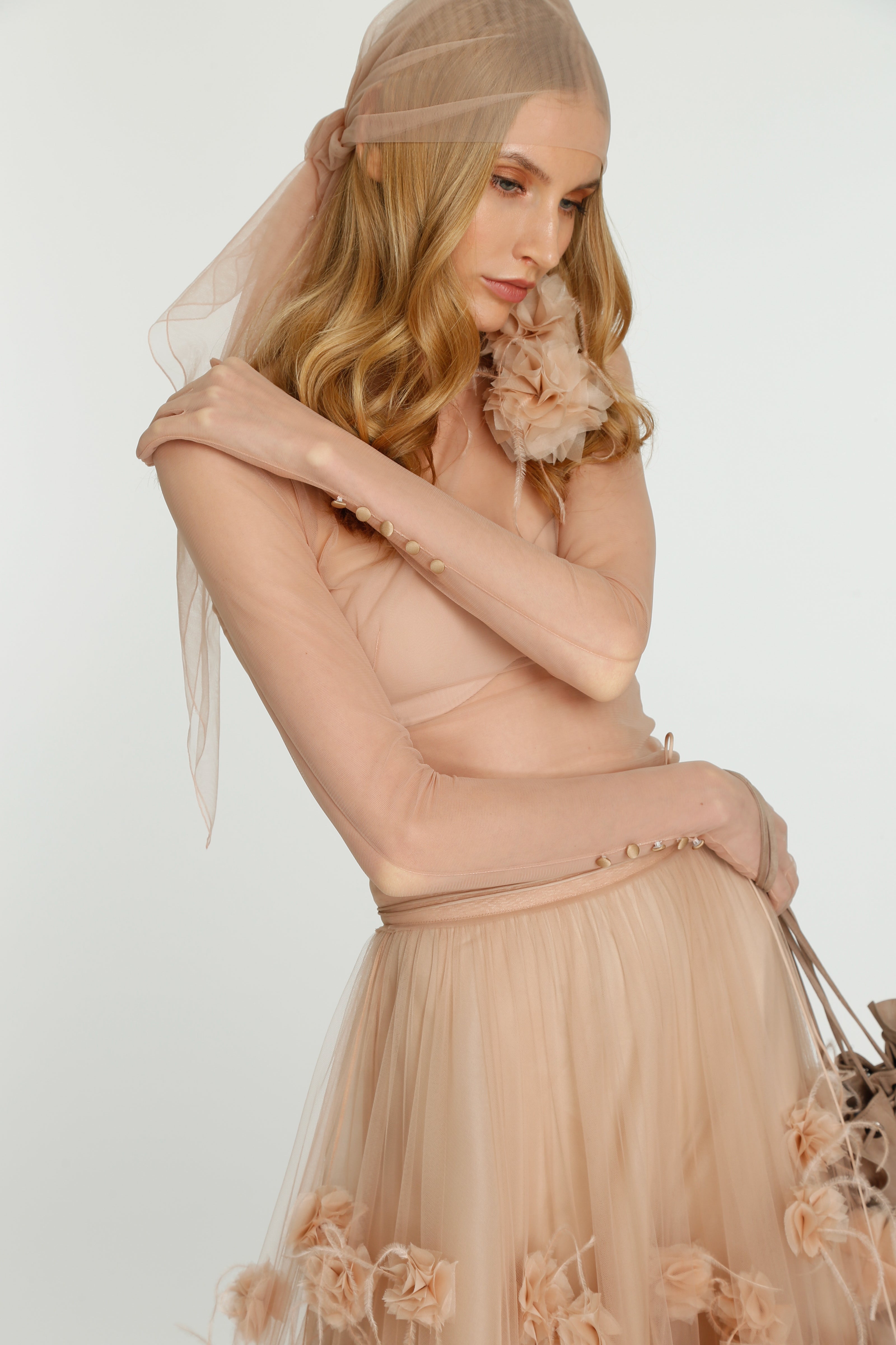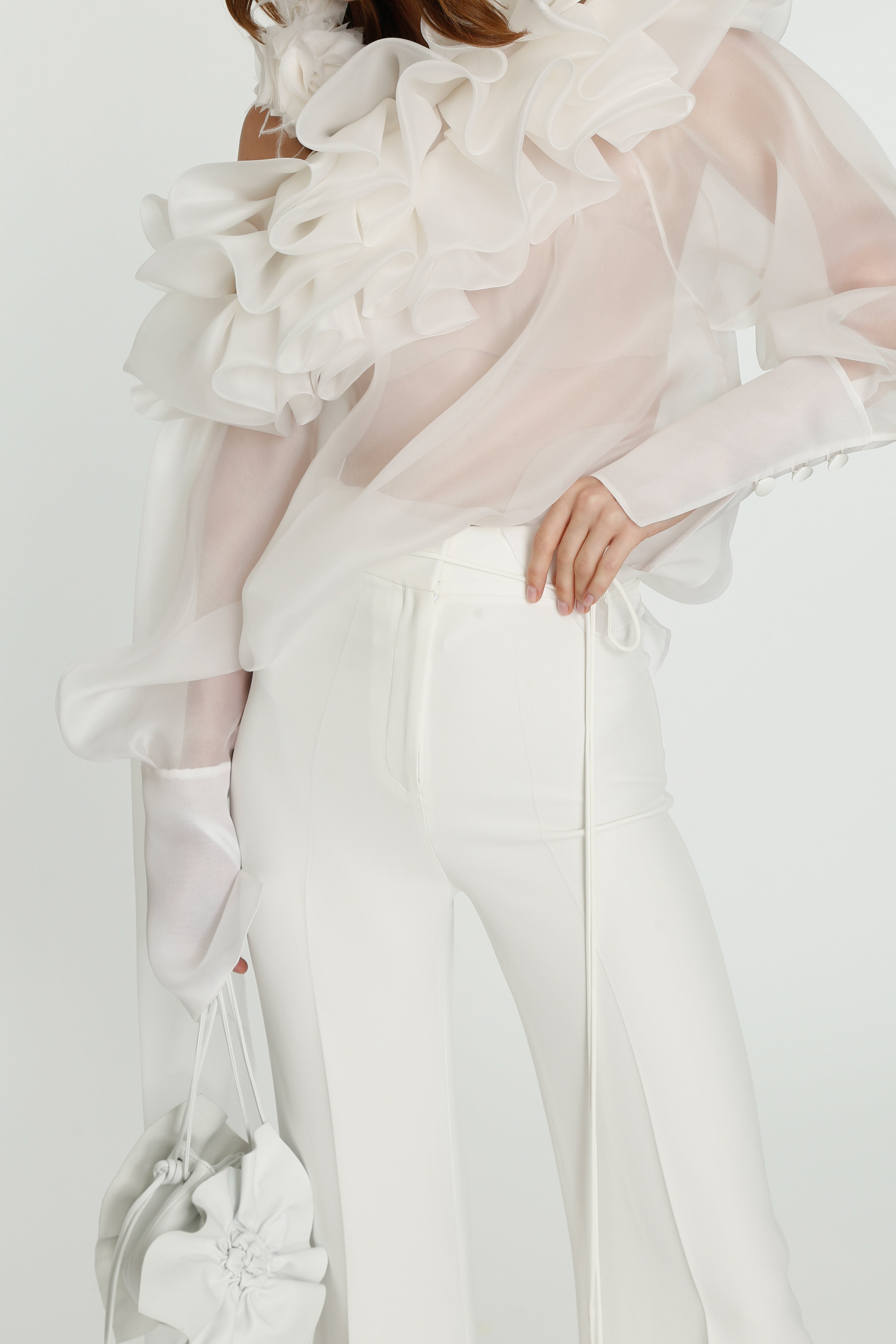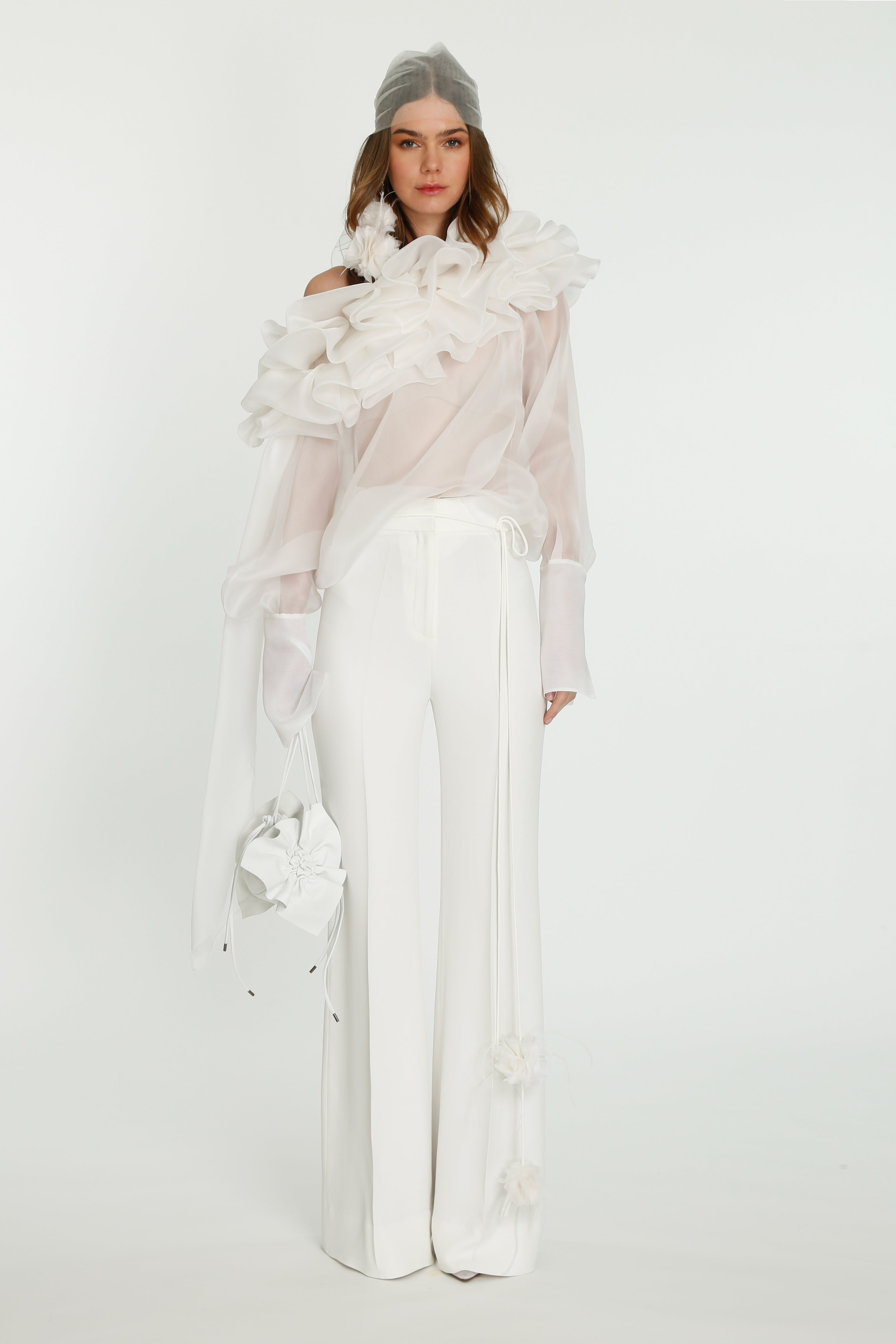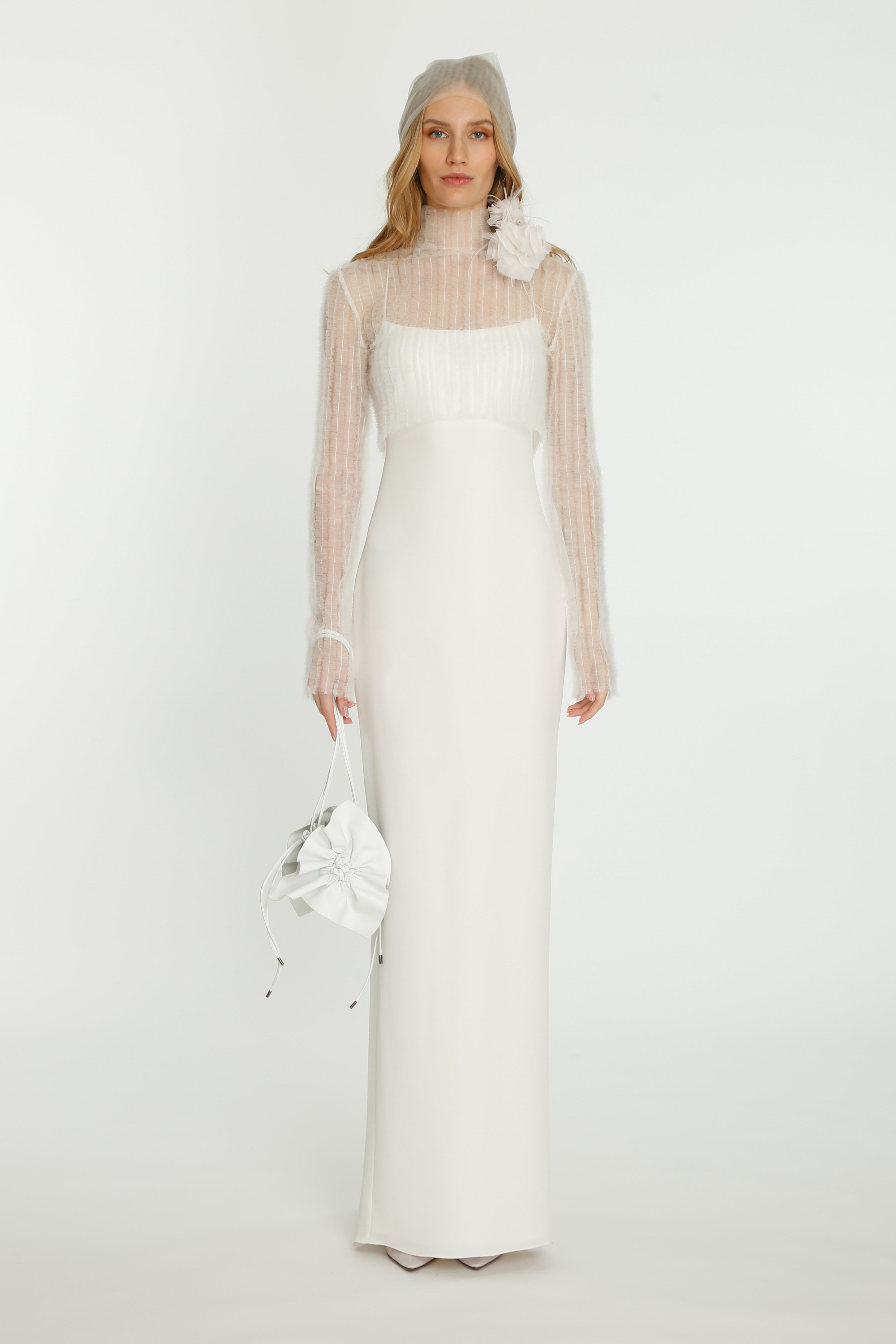Coming into the character of a soft femininity blooming as a desirable flower, the notion of transformation unfolds until the very tip of our fingers in the transparency of the lightweight elements from organza blouses with extended balloon sleeves, integrated gloves high-neck tulle dresses as well as tops, delicate mousseline skirts and