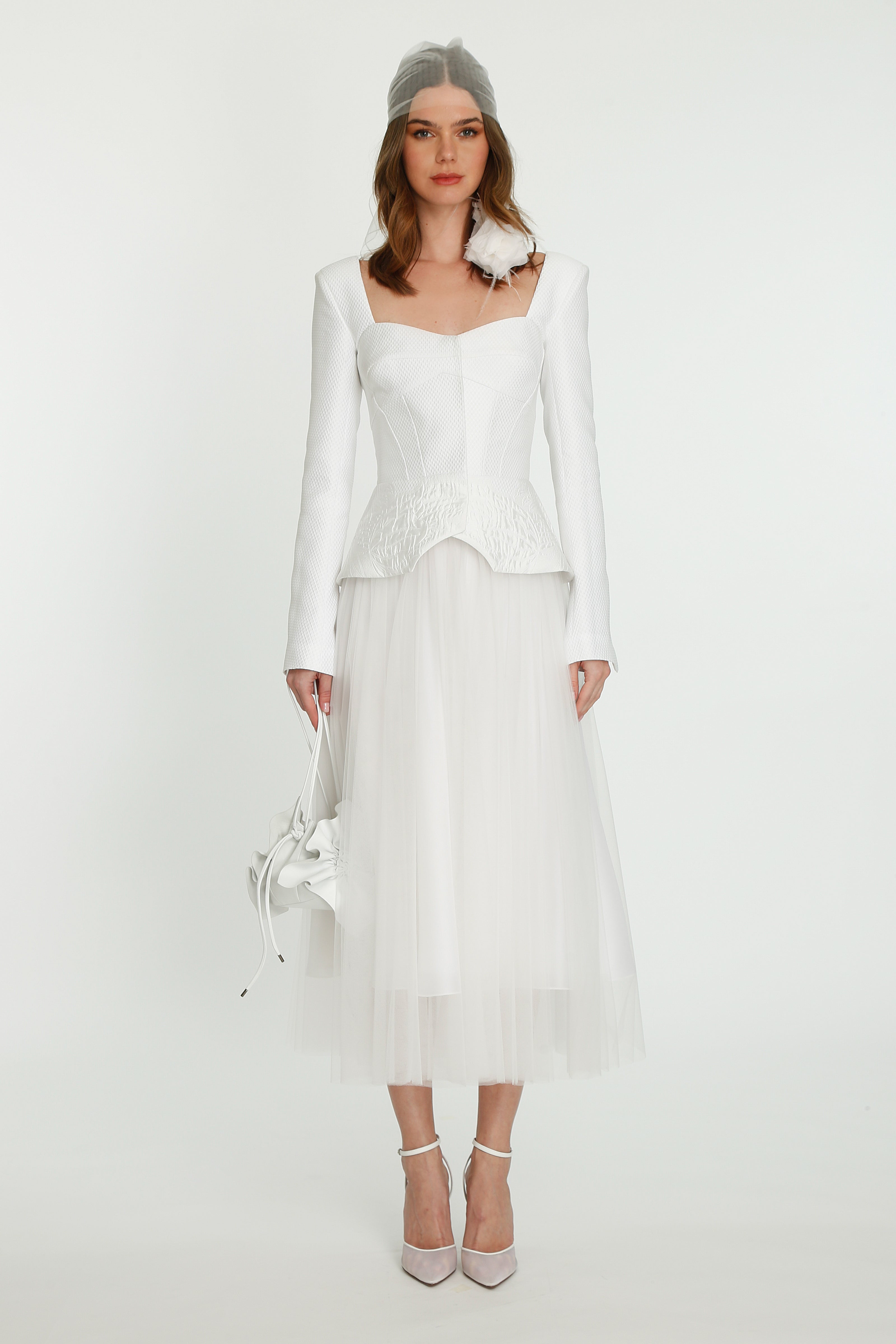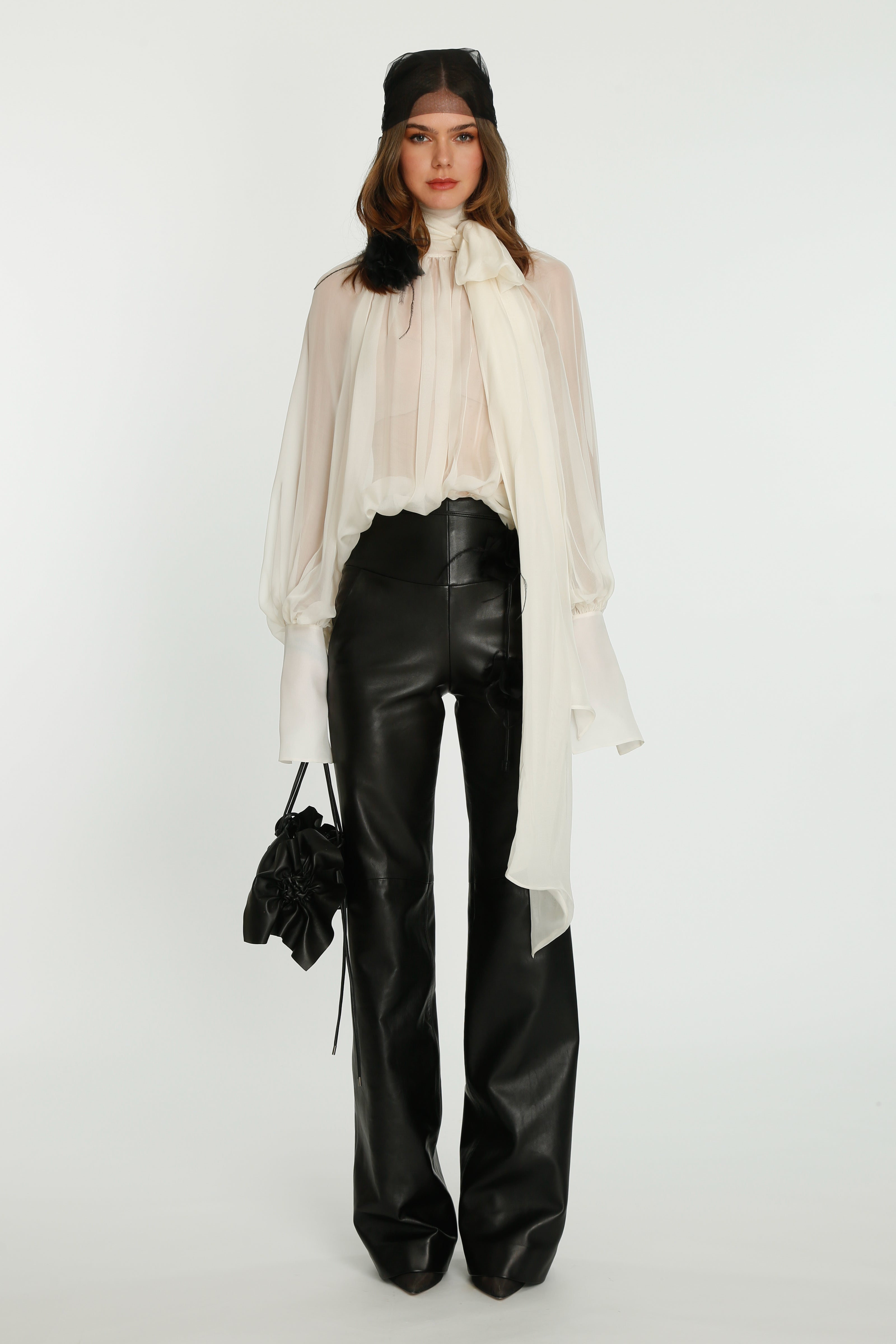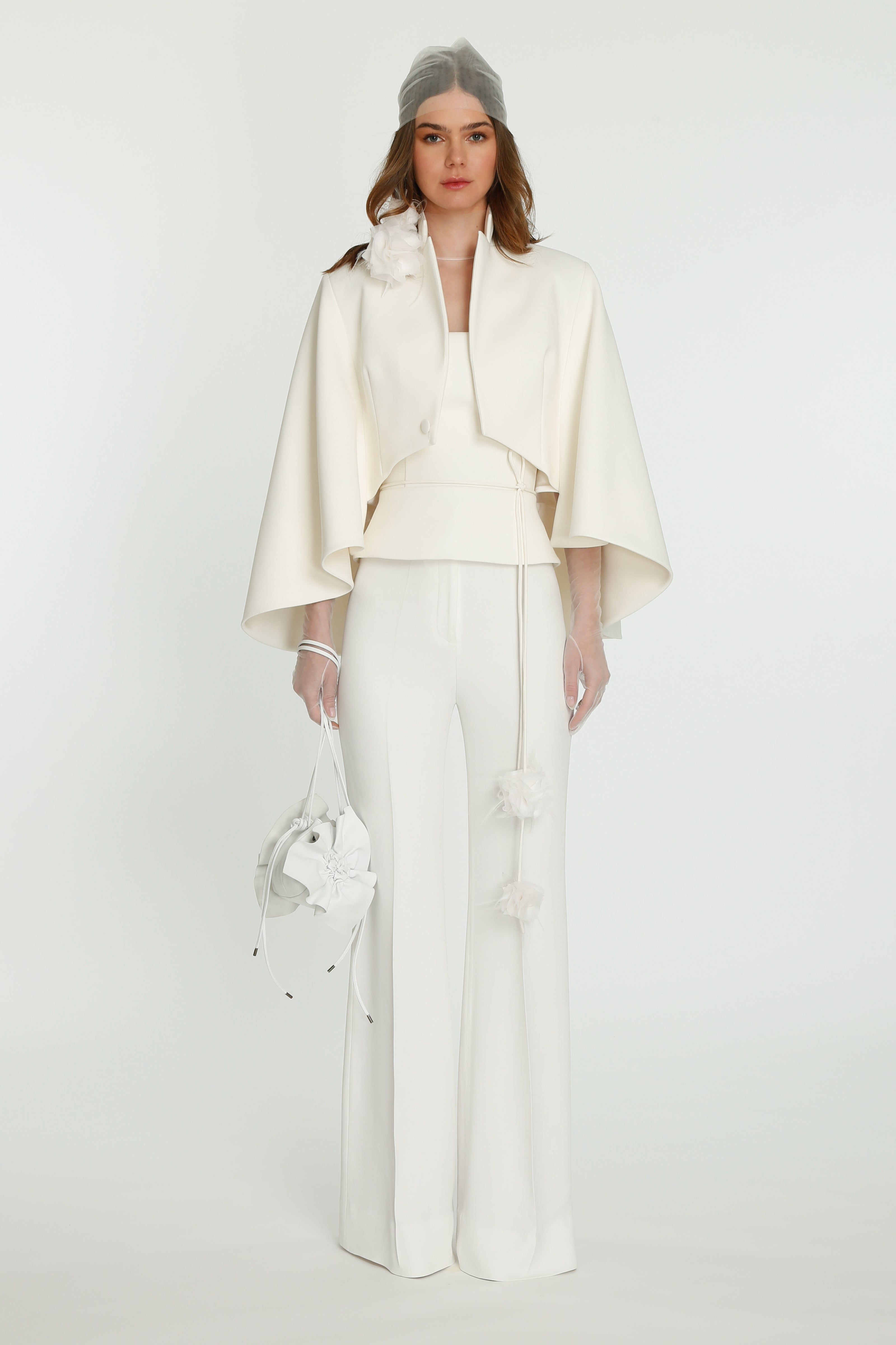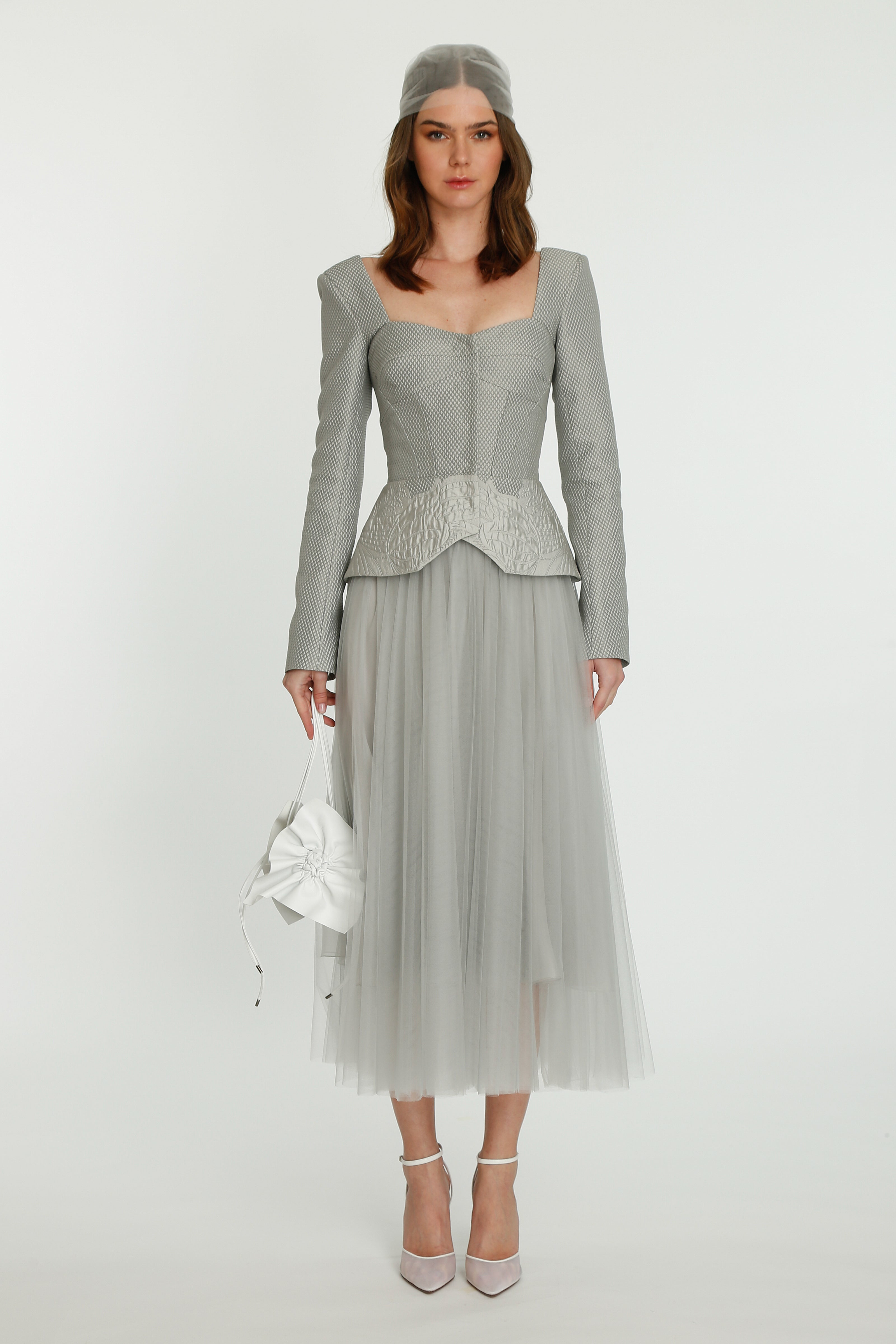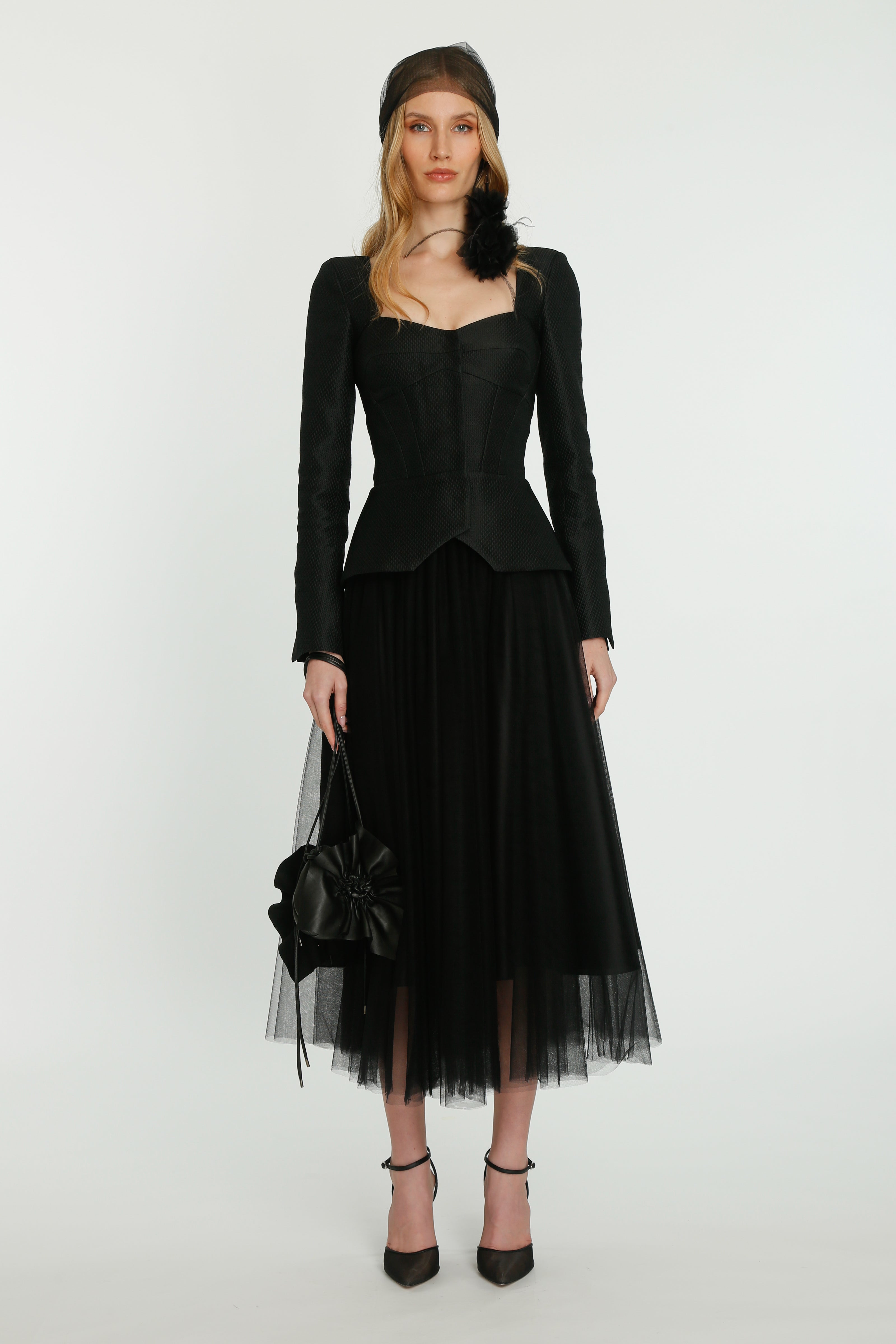 Coming into the character of a soft femininity blooming as a desirable flower, the notion of transformation unfolds until the very tip of our fingers in the transparency of the lightweight elements from organza blouses with extended balloon sleeves, integrated gloves high-neck tulle dresses as well as tops, delicate mousseline skirts and
