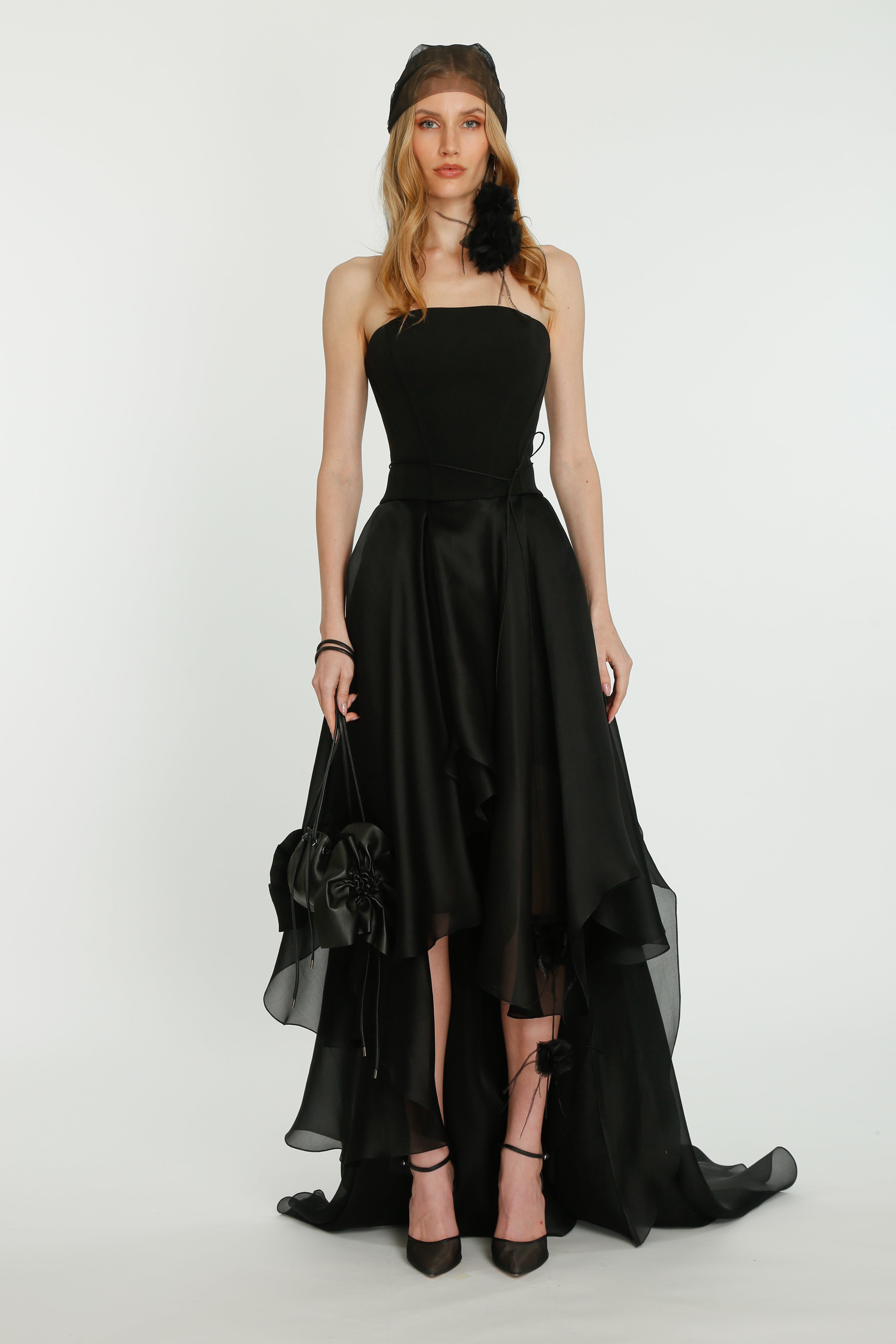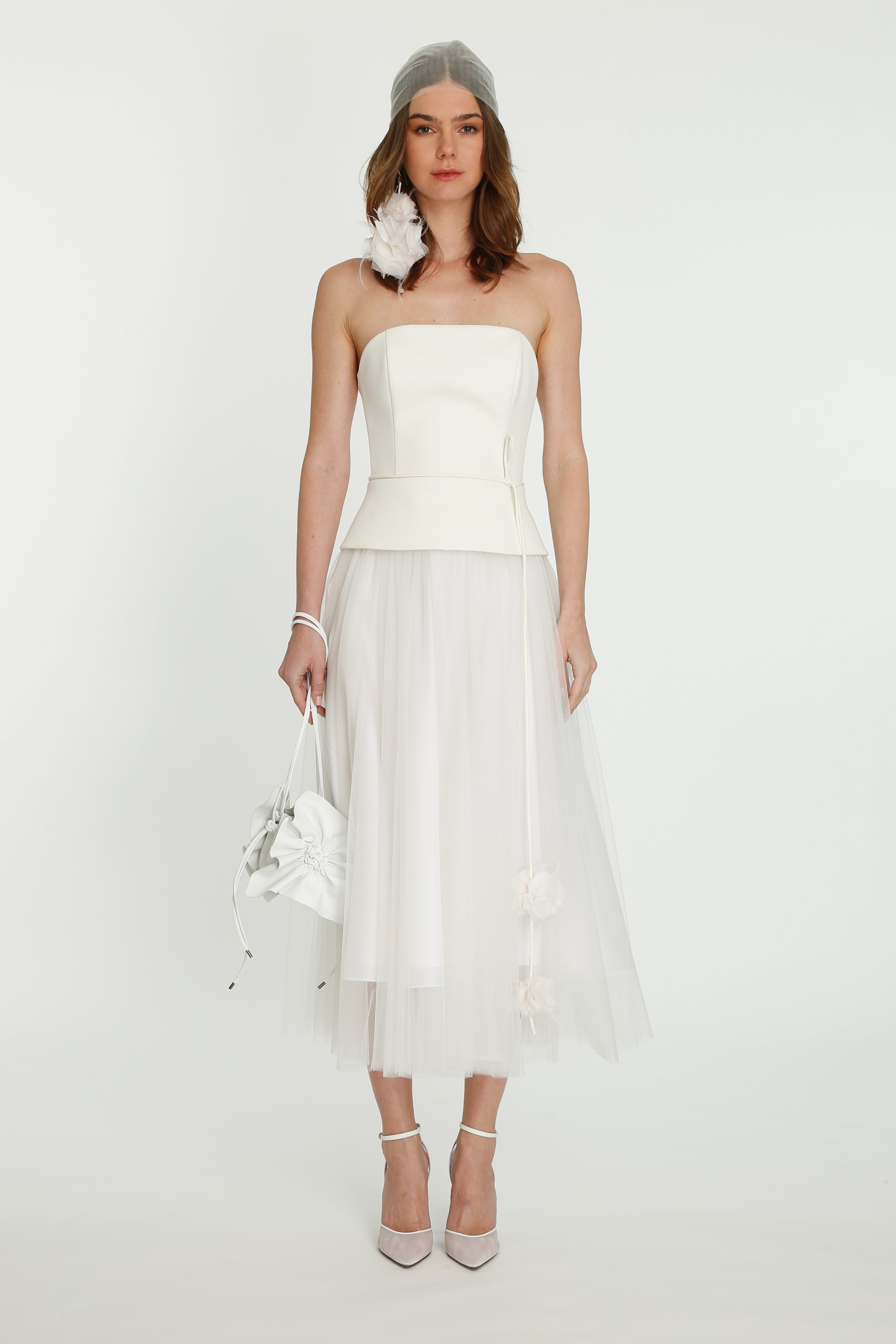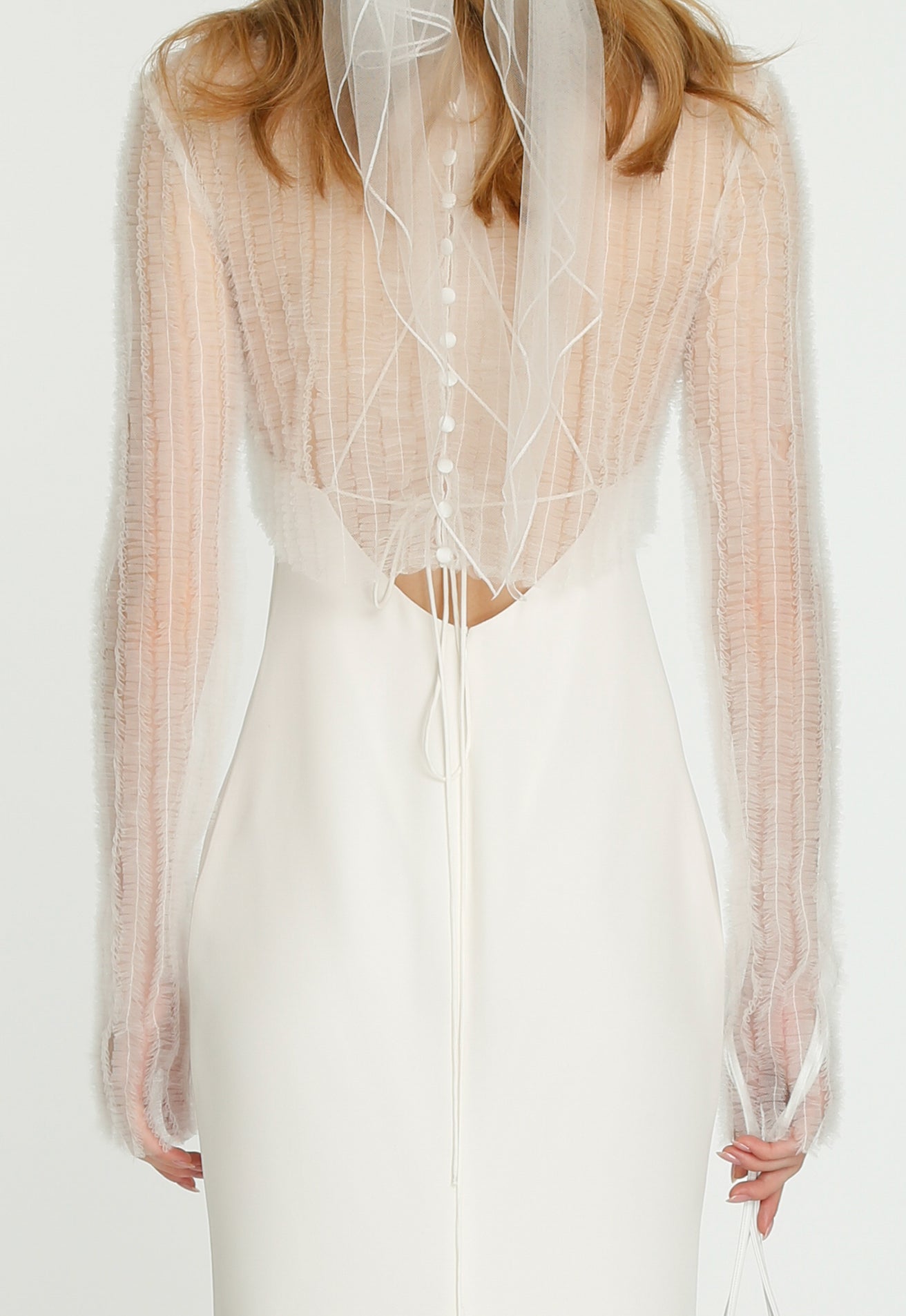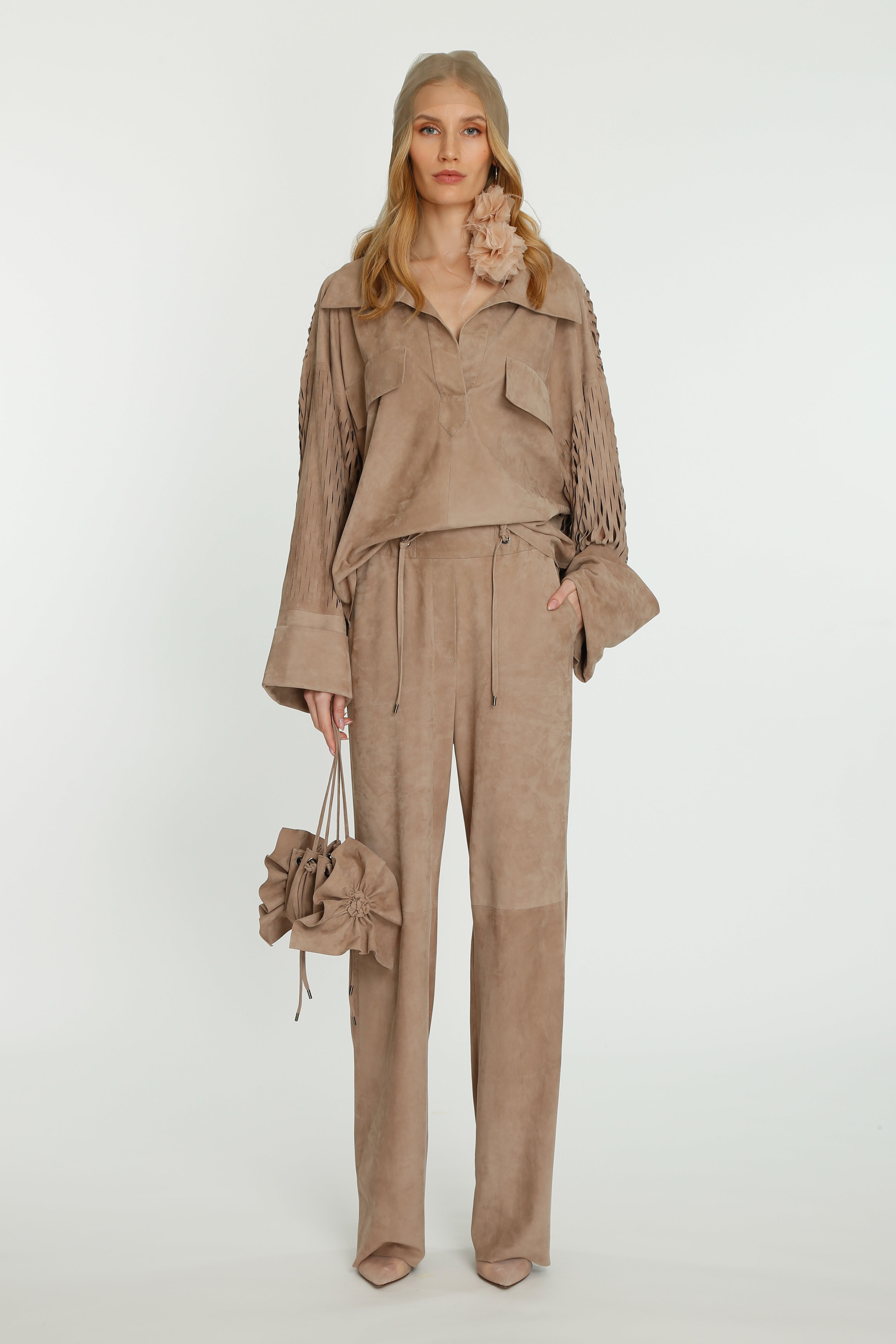 Coming into the character of a soft femininity blooming as a desirable flower, the notion of transformation unfolds until the very tip of our fingers in the transparency of the lightweight elements from organza blouses with extended balloon sleeves, integrated gloves high-neck tulle dresses as well as tops, delicate mousseline skirts and