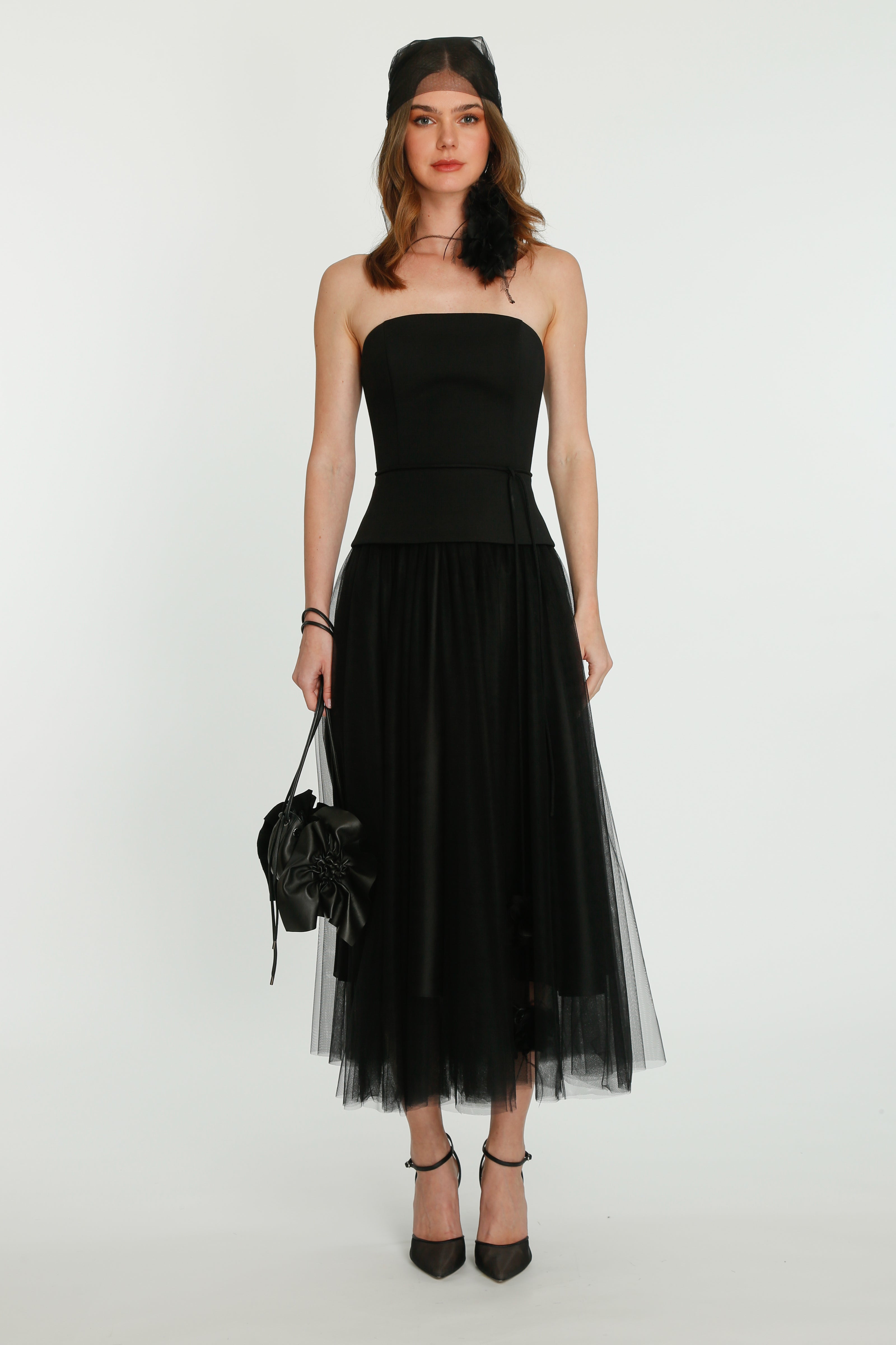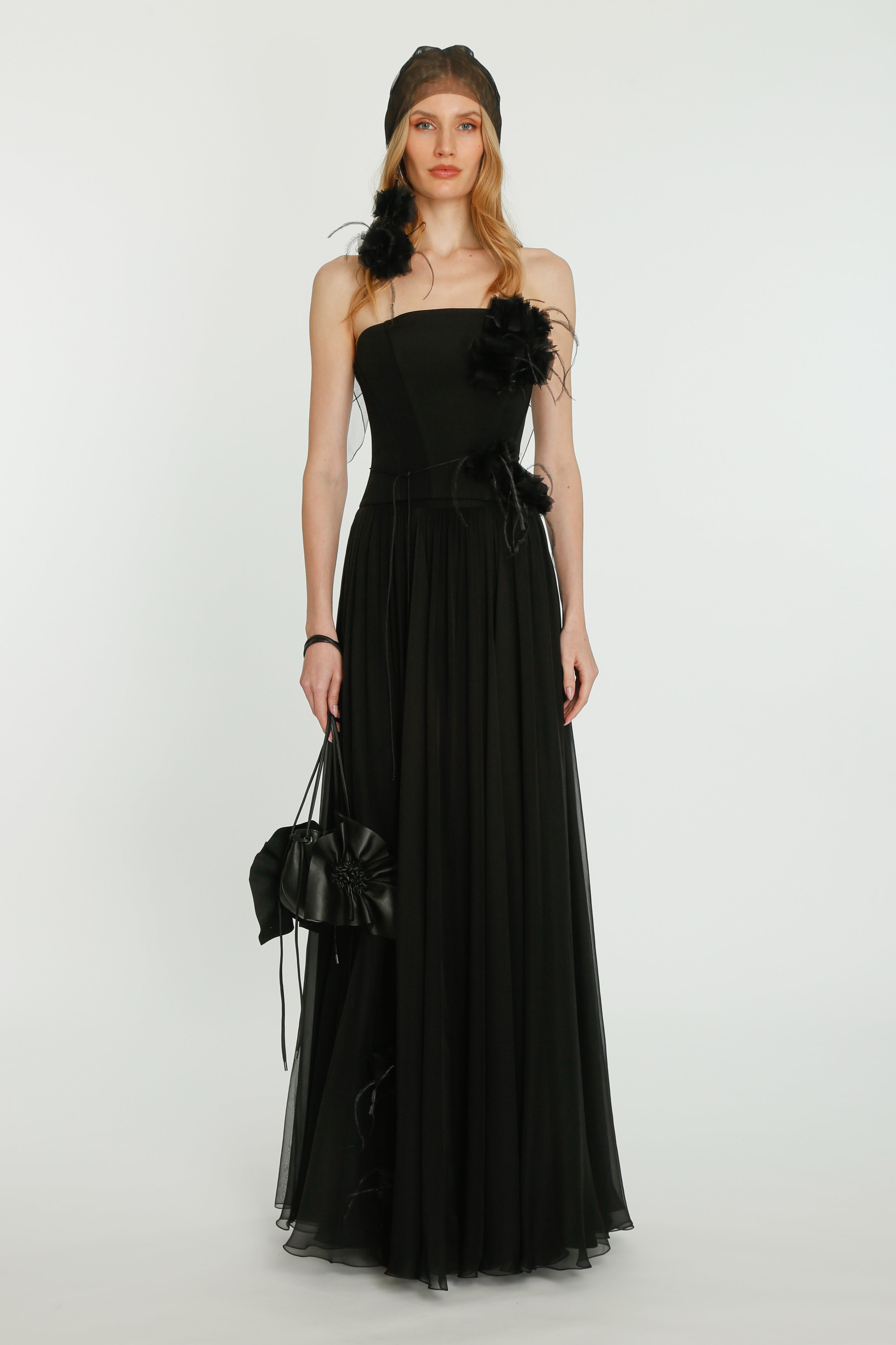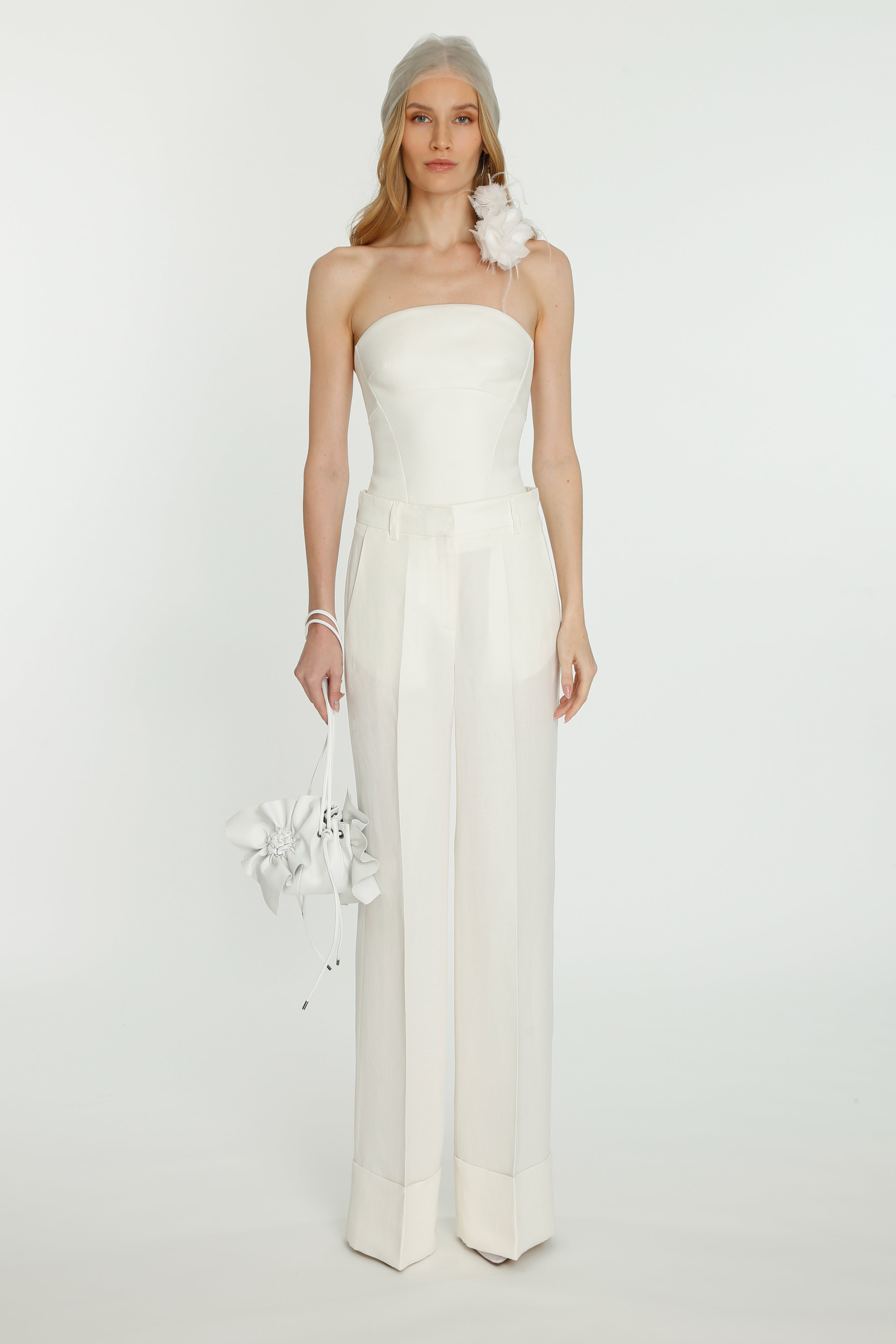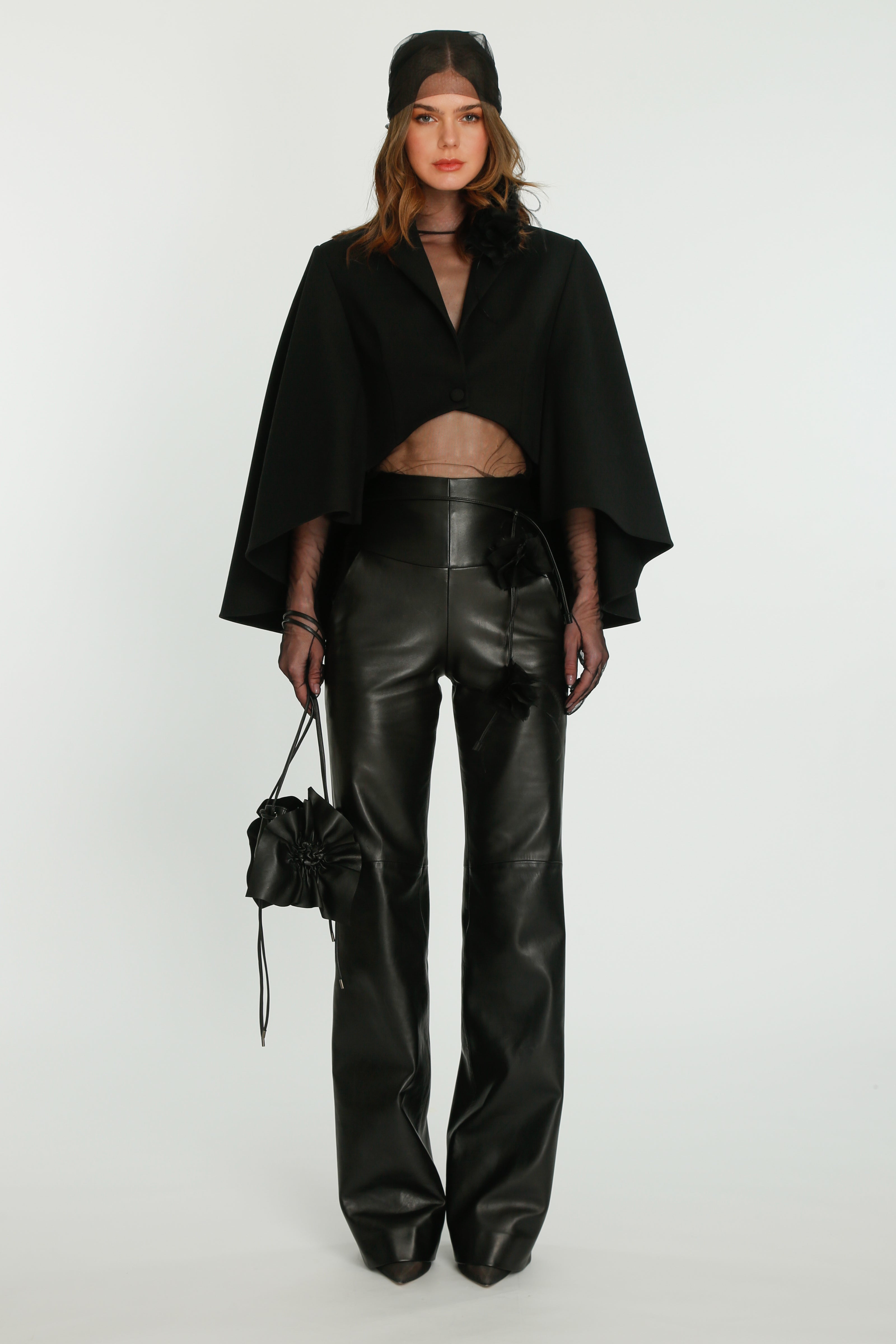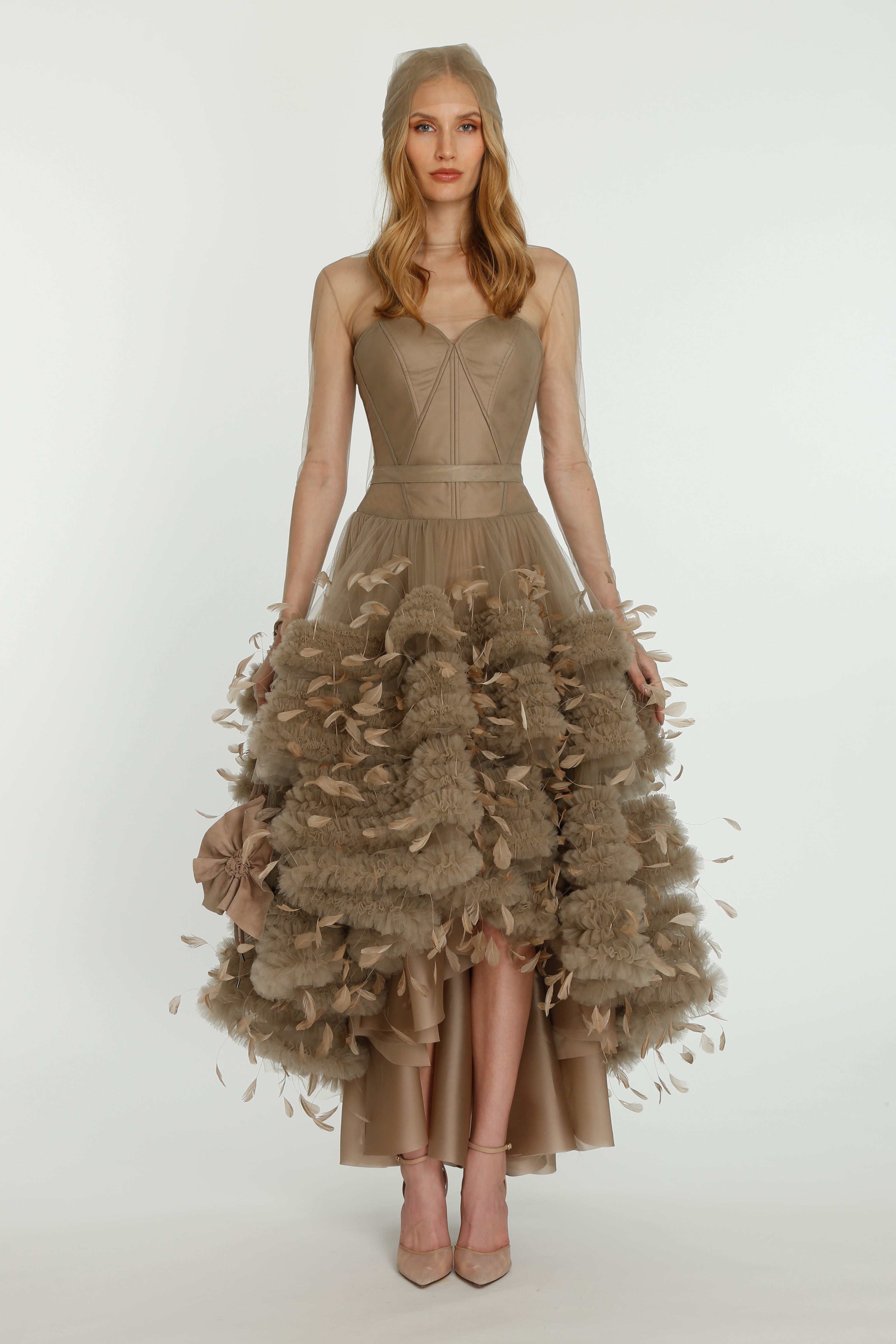 Coming into the character of a soft femininity blooming as a desirable flower, the notion of transformation unfolds until the very tip of our fingers in the transparency of the lightweight elements from organza blouses with extended balloon sleeves, integrated gloves high-neck tulle dresses as well as tops, delicate mousseline skirts and