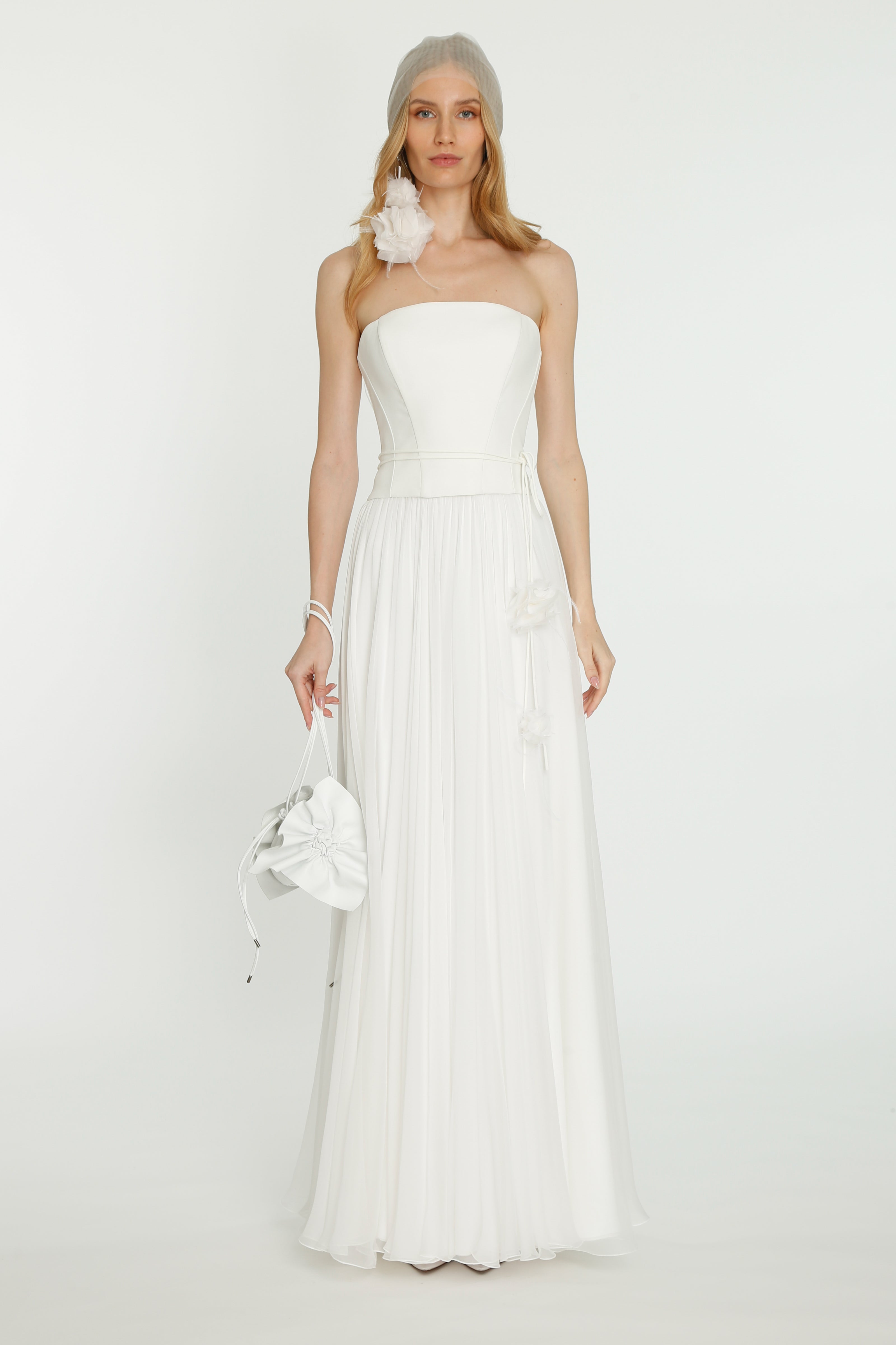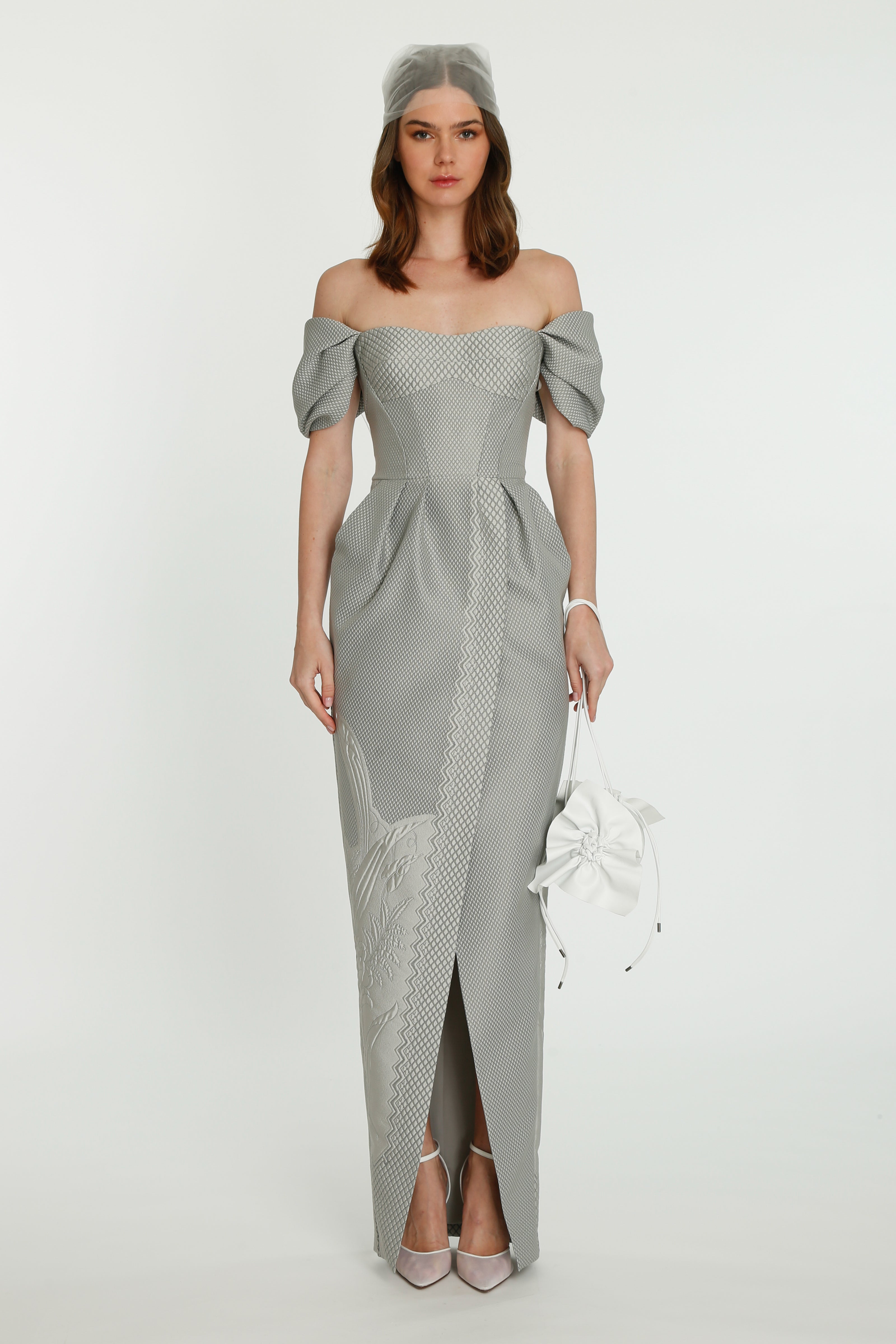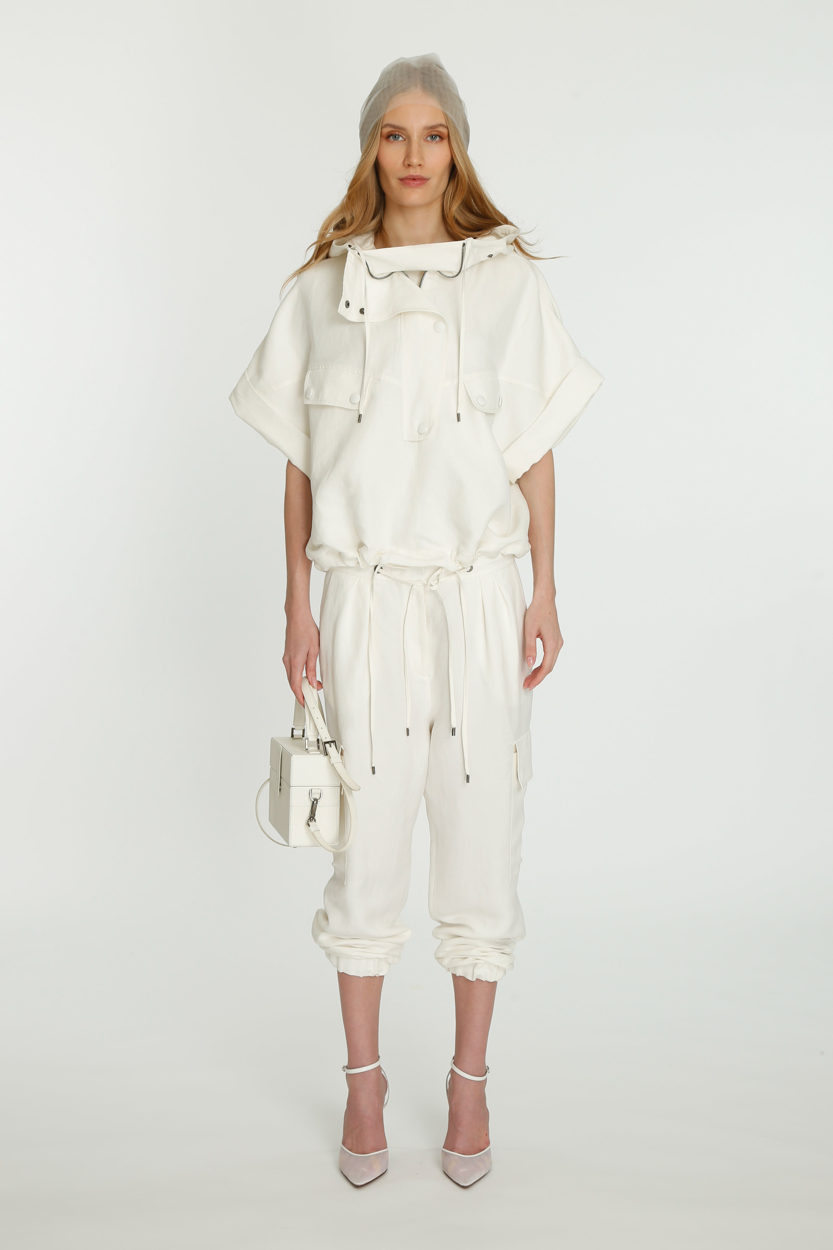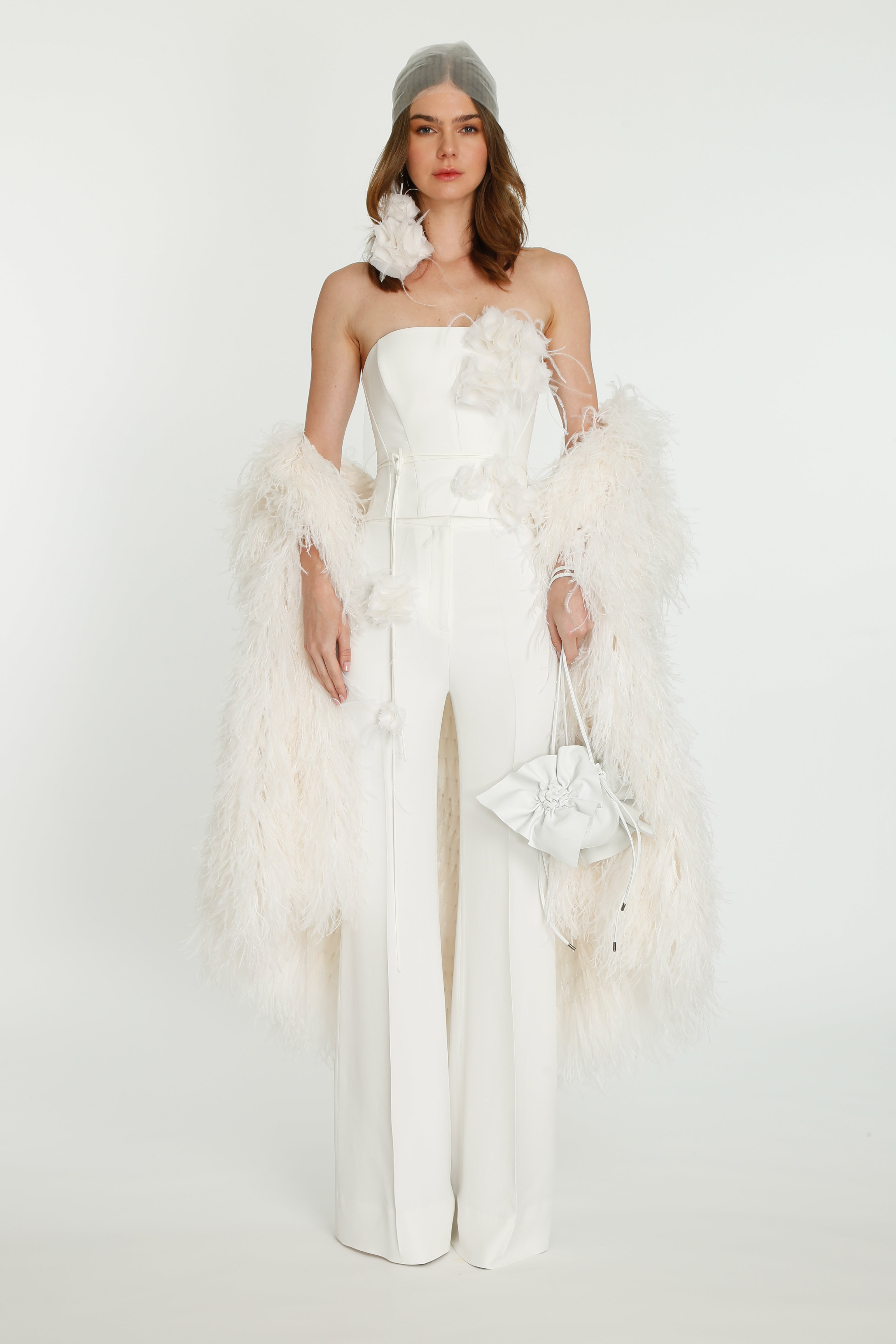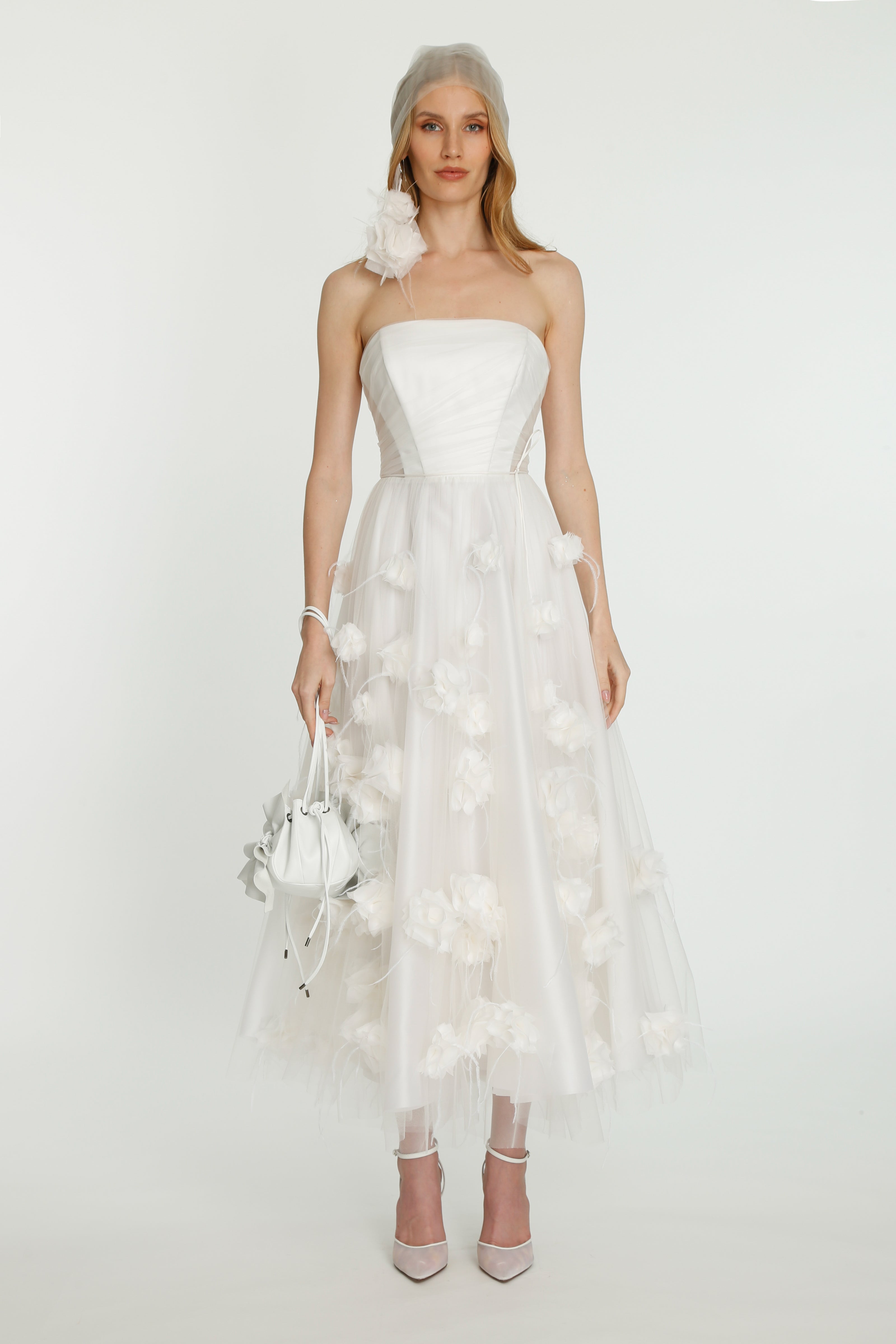 Coming into the character of a soft femininity blooming as a desirable flower, the notion of transformation unfolds until the very tip of our fingers in the transparency of the lightweight elements from organza blouses with extended balloon sleeves, integrated gloves high-neck tulle dresses as well as tops, delicate mousseline skirts and
