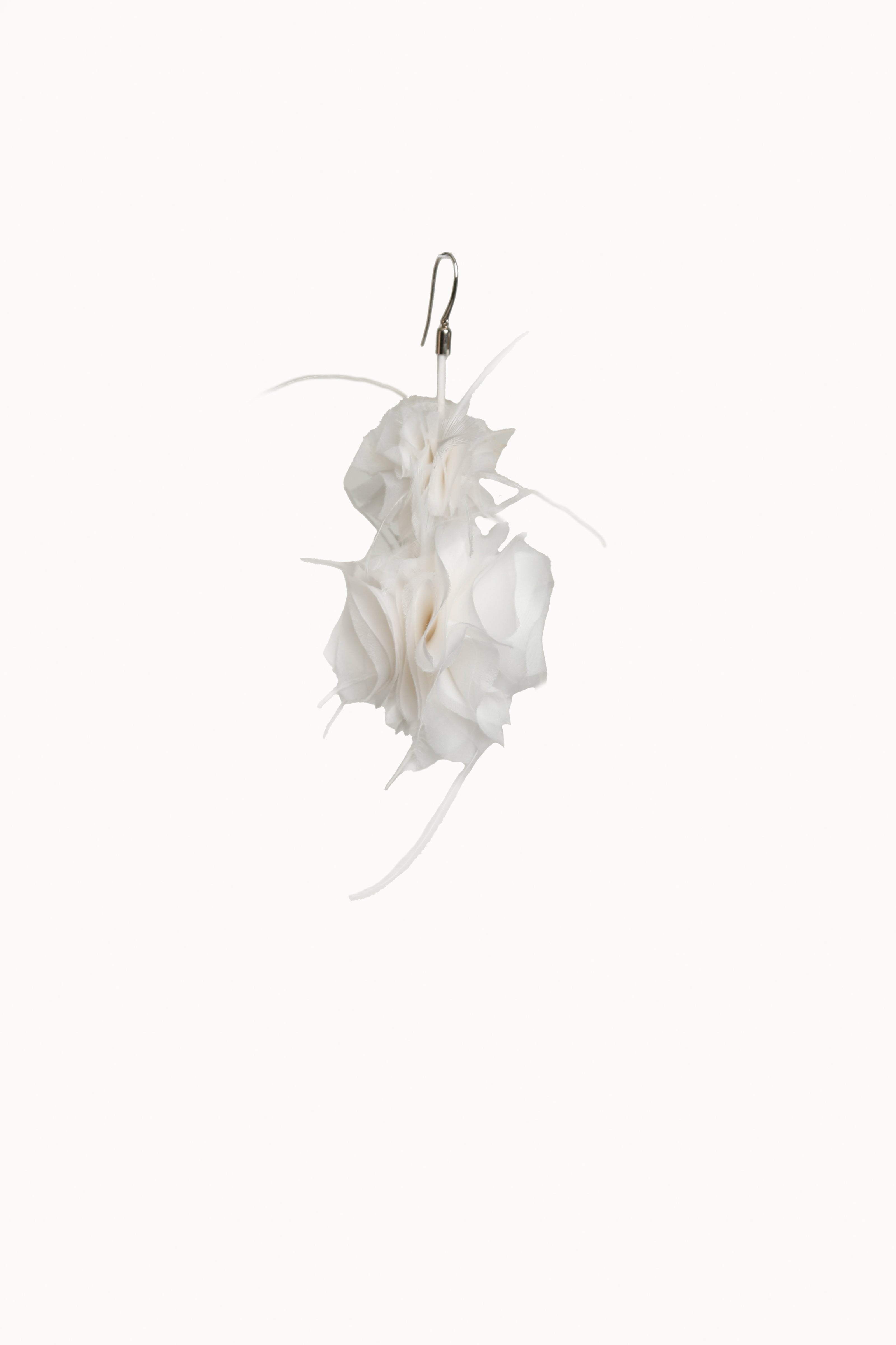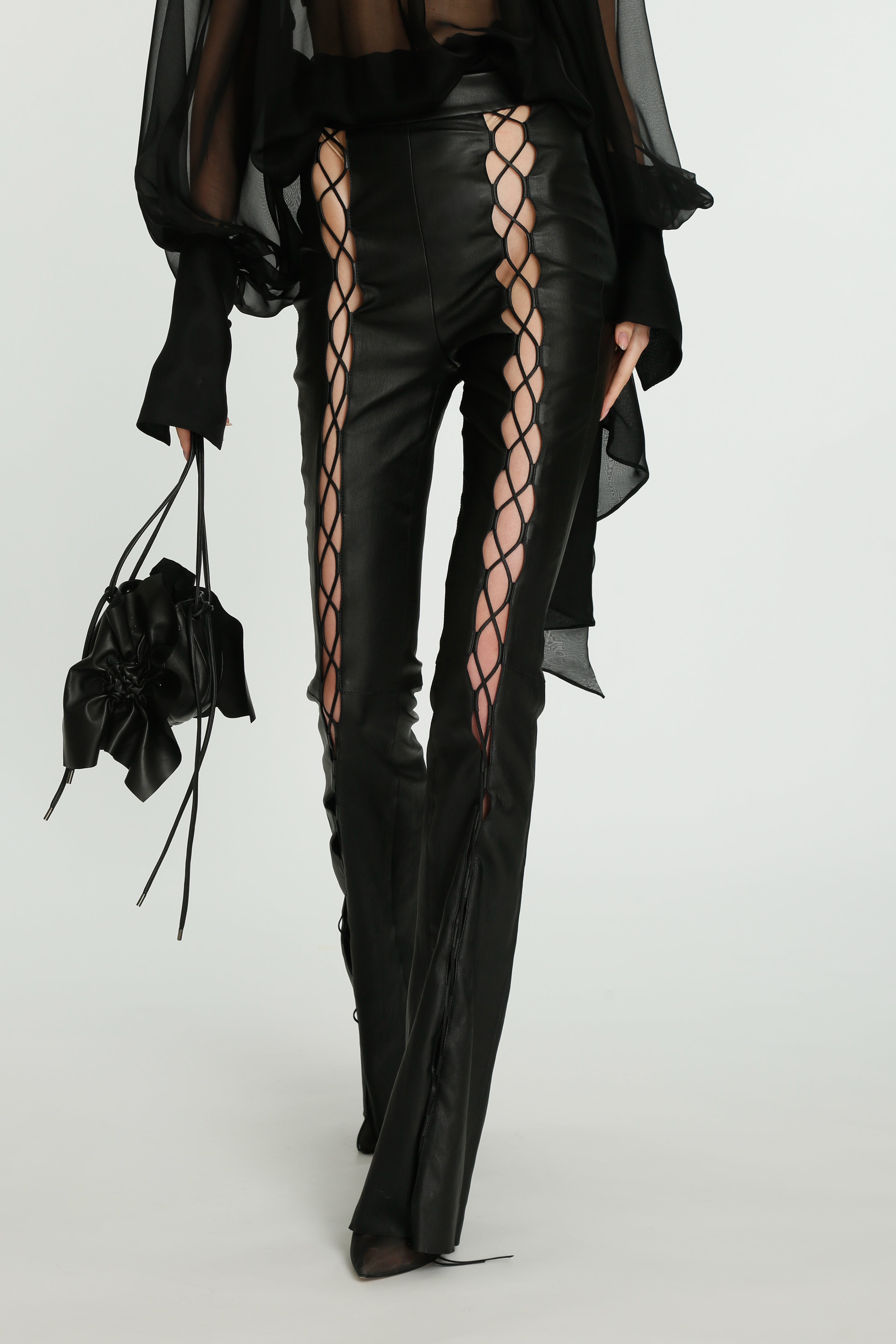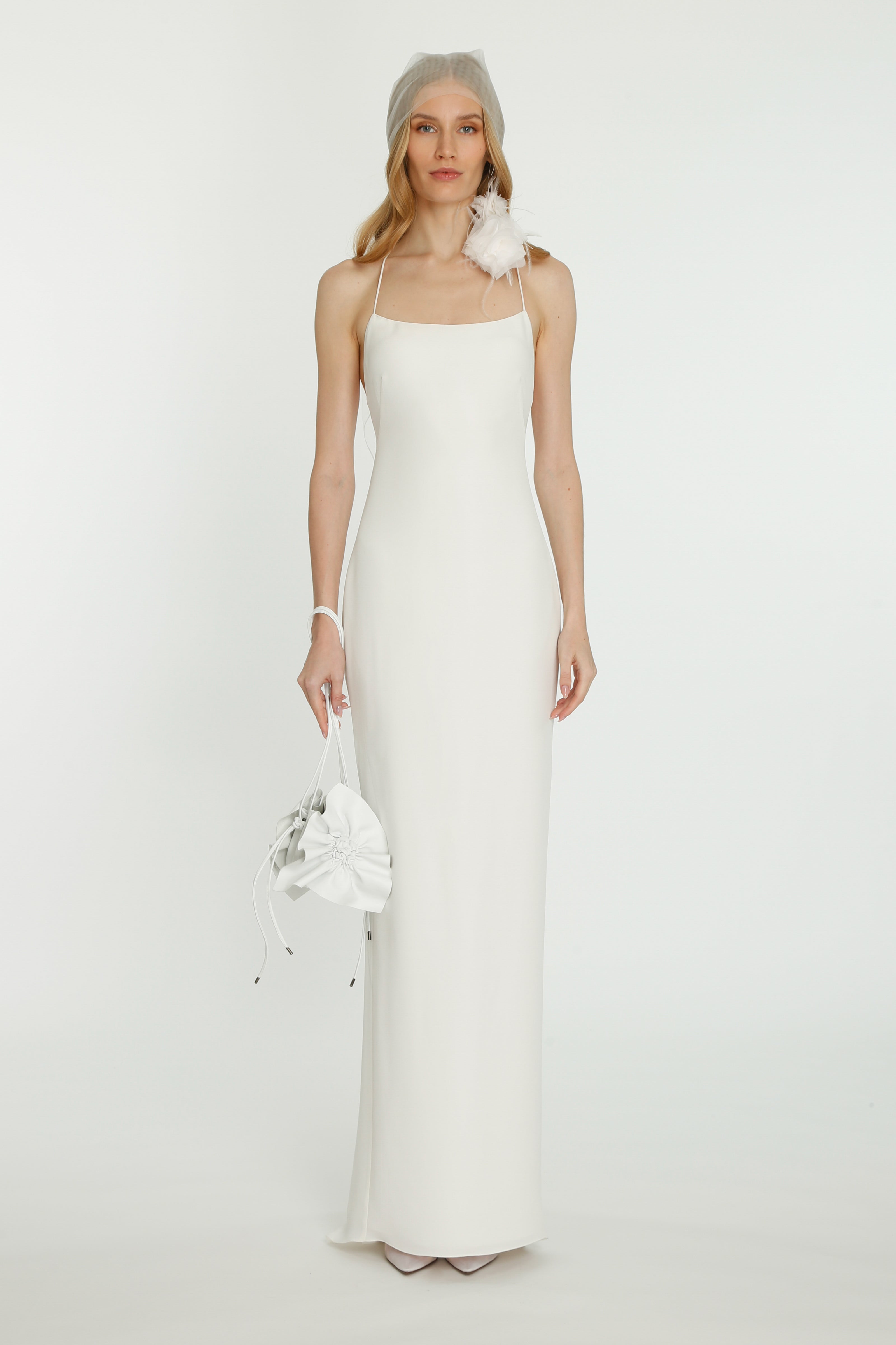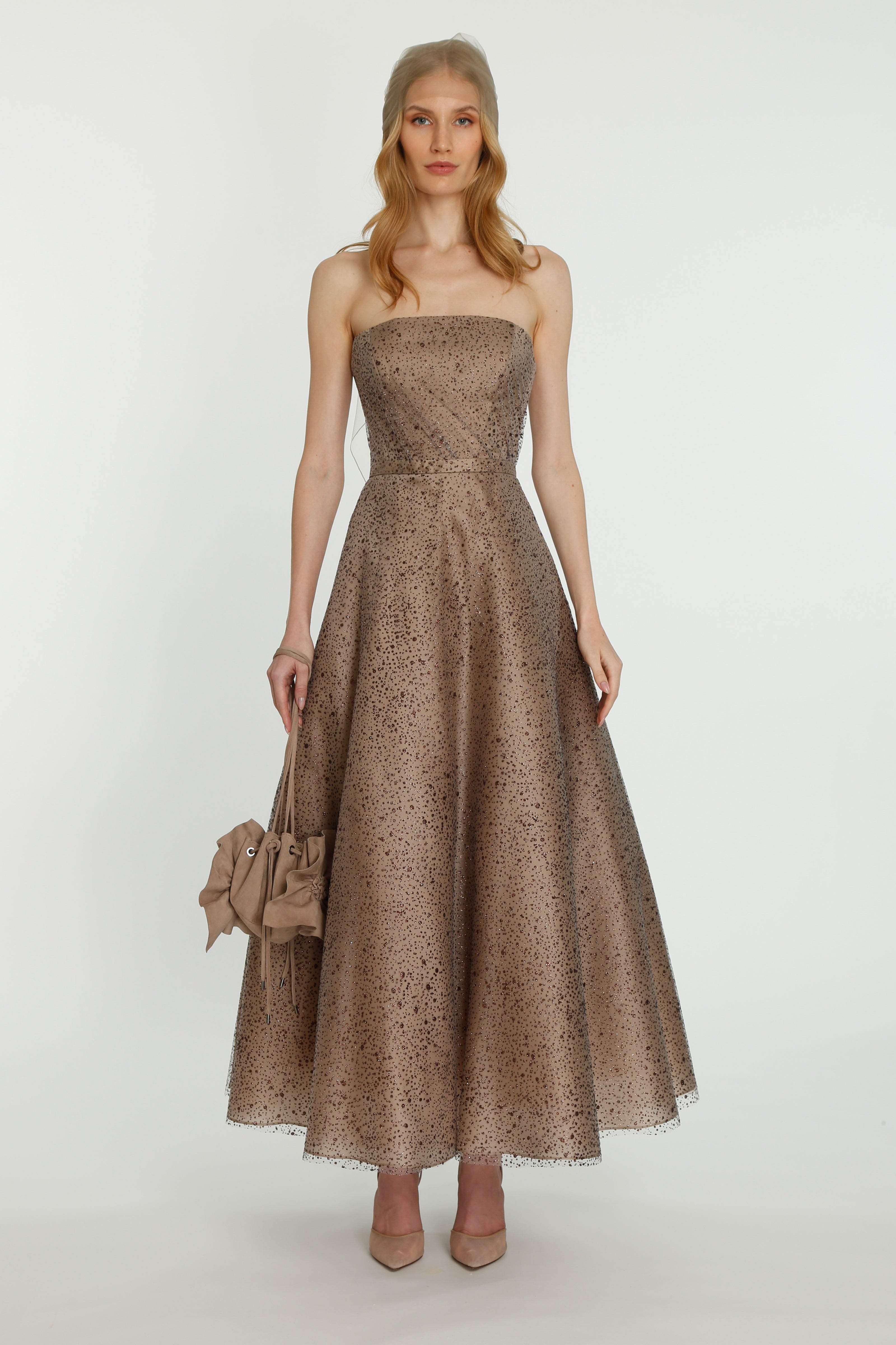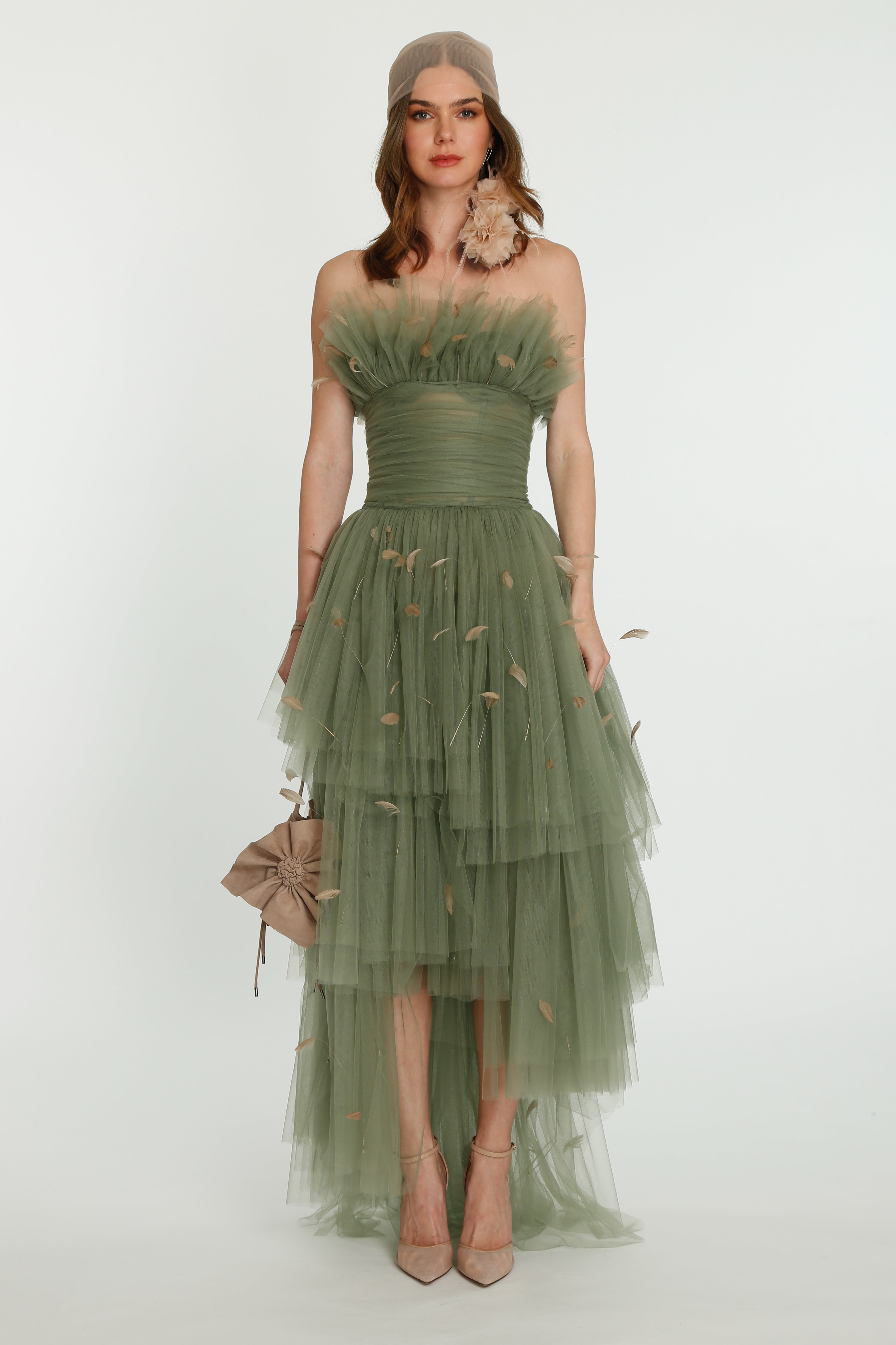 Coming into the character of a soft femininity blooming as a desirable flower, the notion of transformation unfolds until the very tip of our fingers in the transparency of the lightweight elements from organza blouses with extended balloon sleeves, integrated gloves high-neck tulle dresses as well as tops, delicate mousseline skirts and