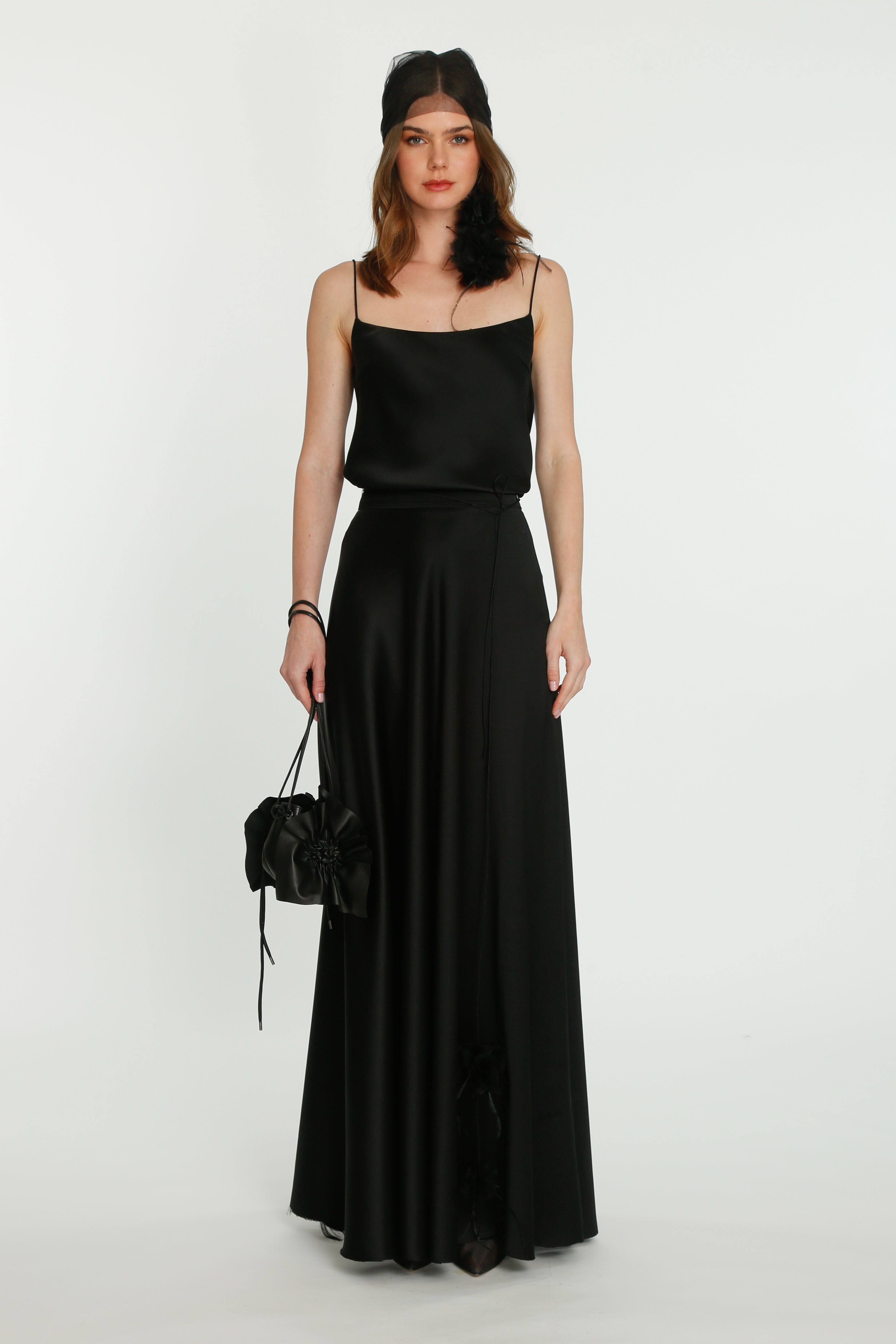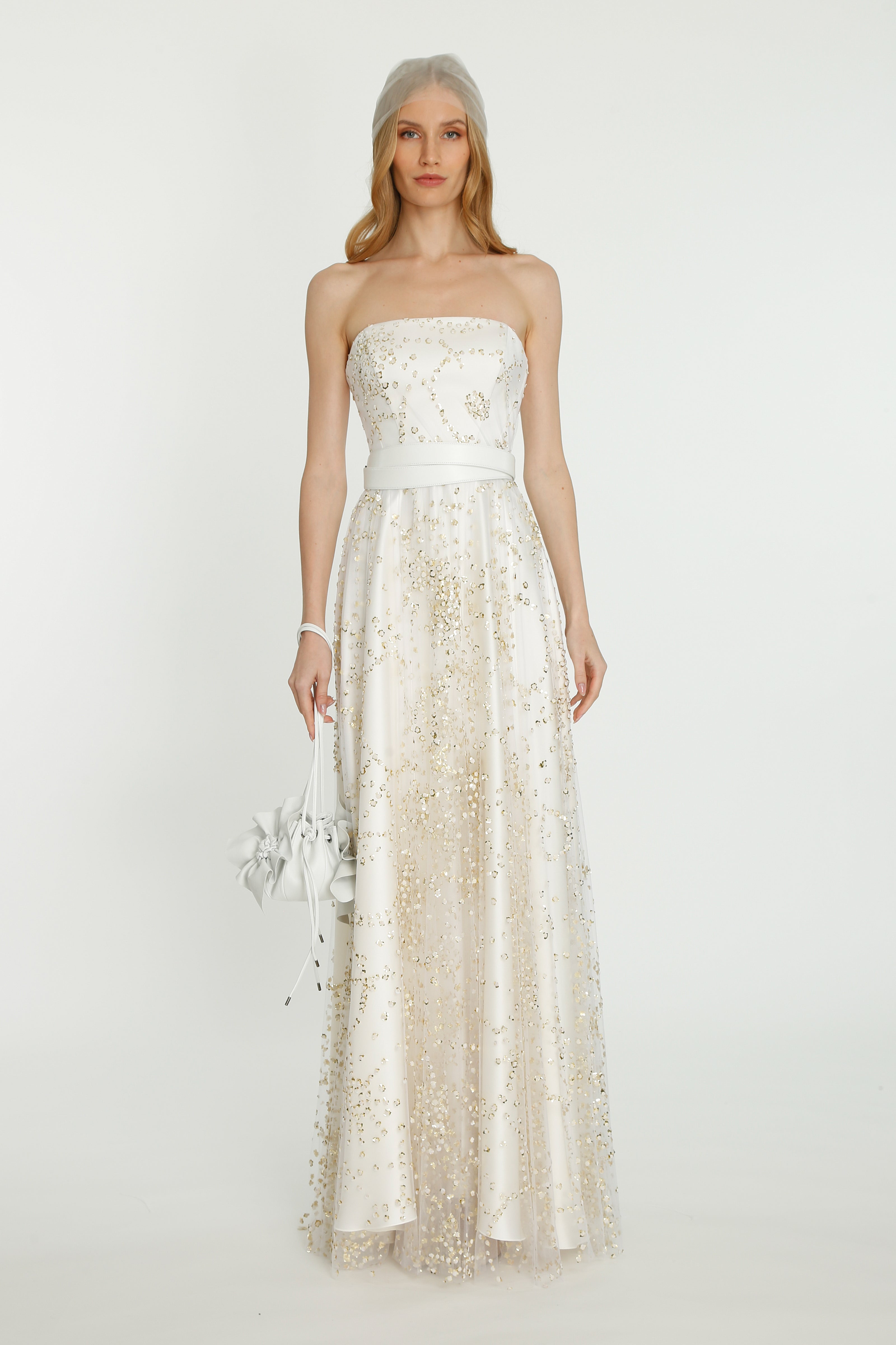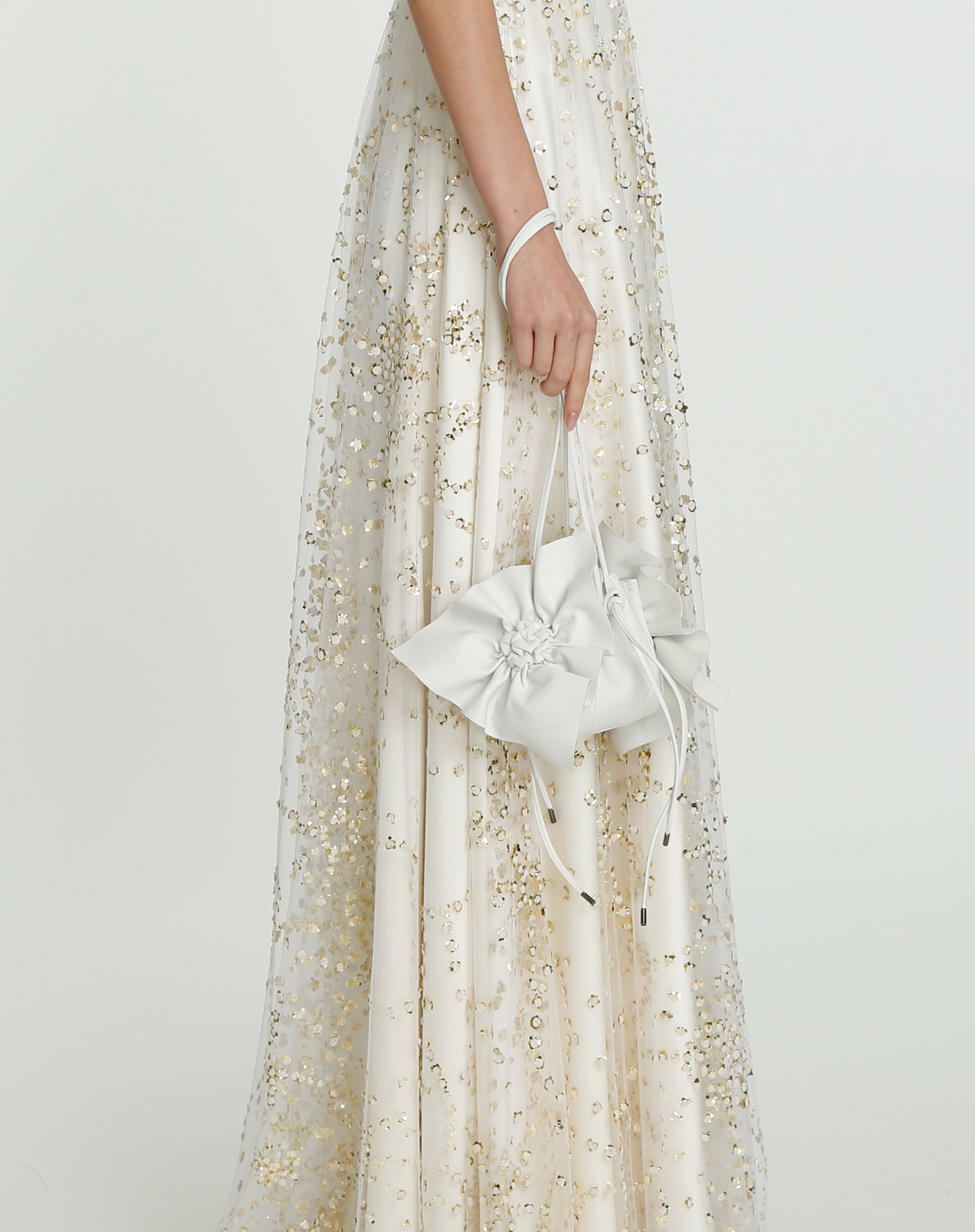 The sparkle looks are echoing this idea of achieving confidence to oneself and novelty into the brand. Thin flower belts appearing by the walking flow, earrings as petals falling onto our shoulders and a new interpretation of romance with leather for the bags, the complex savoir-faire of the brand is expressed until their new range of accessories.