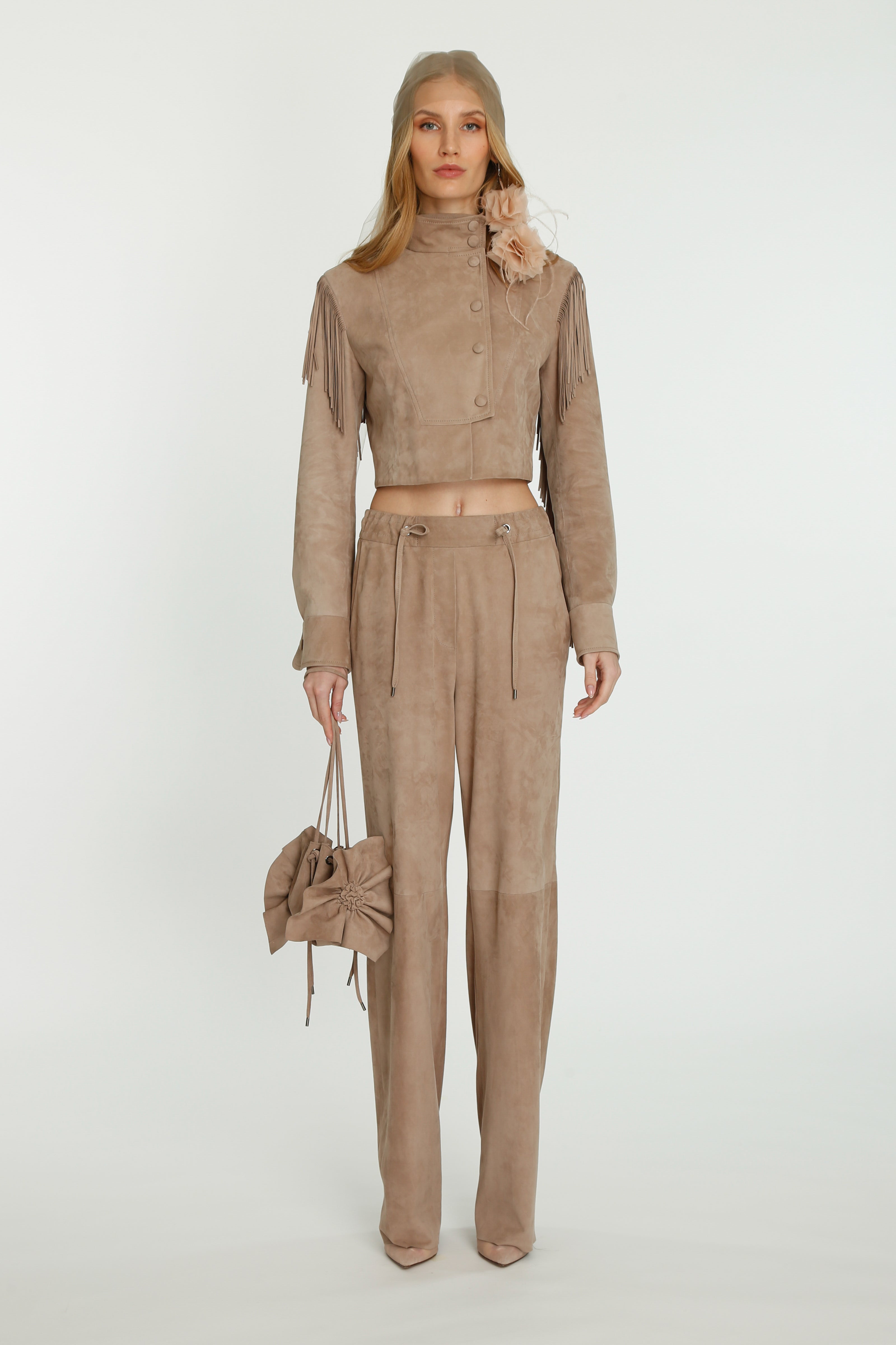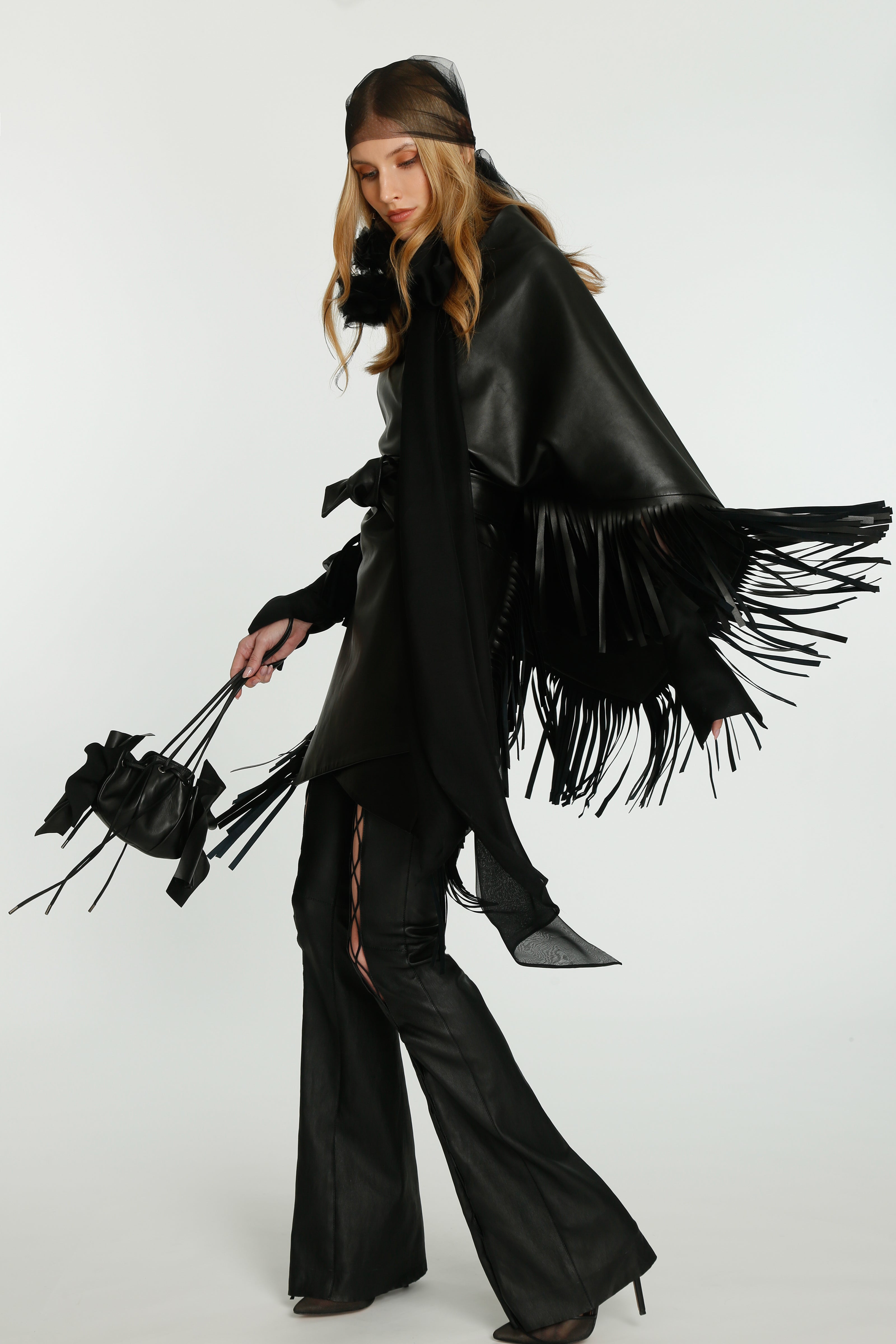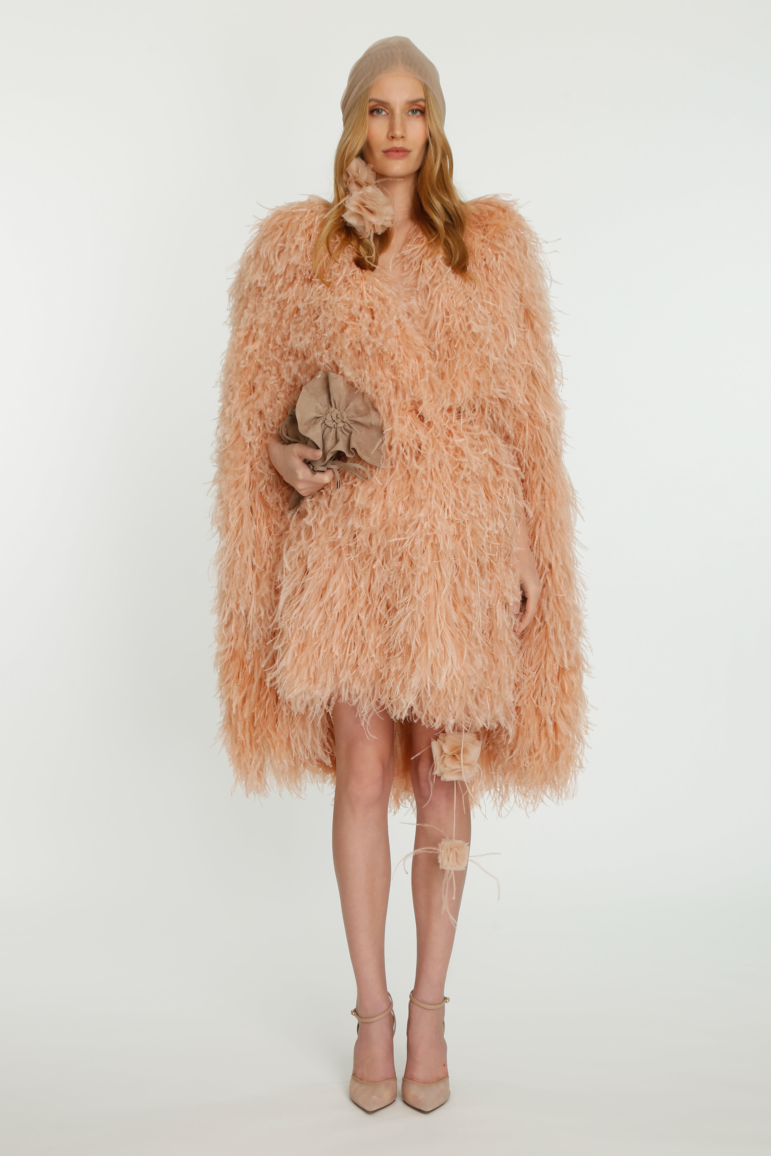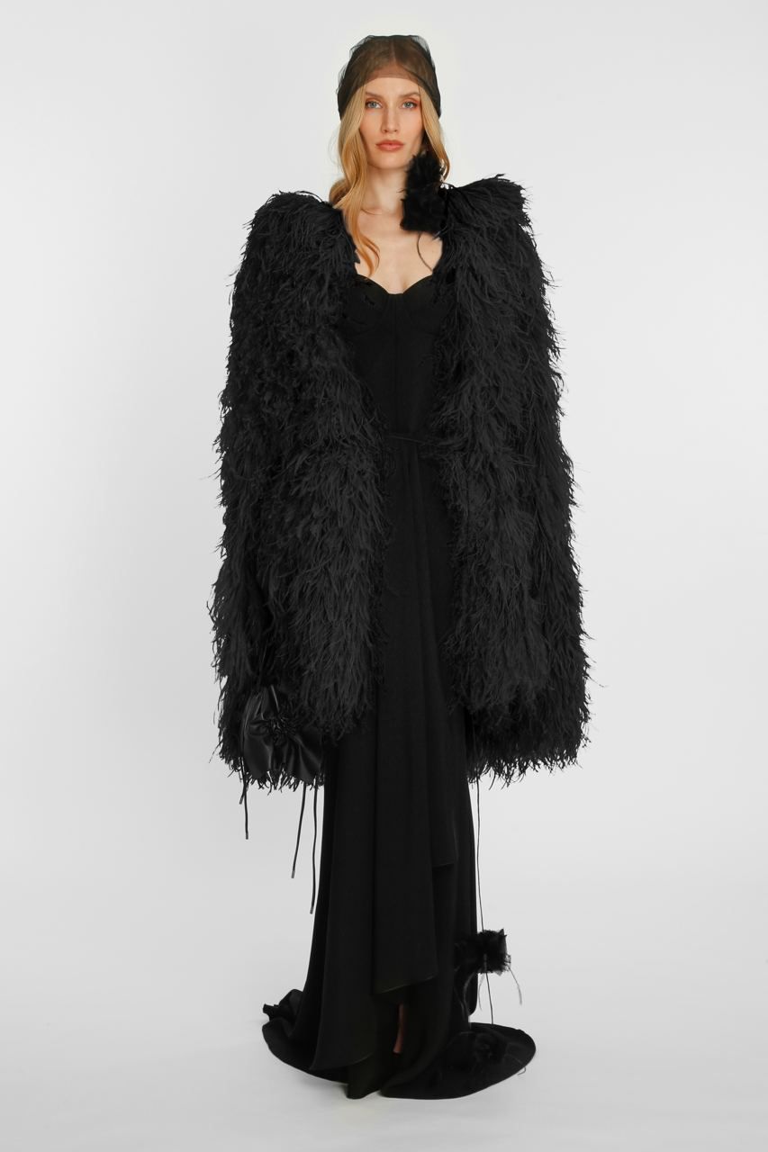 Layering the transparency with garments enhancing a new language of evening wear, our first bolero jackets inspired from our continuing cape story, feathered coats transforming into mini dresses, our signature cut-work statement suede and leather pieces molded to the body or re-interpreted with the complexity of fringes, this collection is a study of silhouette and material accentuated with the magic of the handmade ruffles as the signature of the brand.