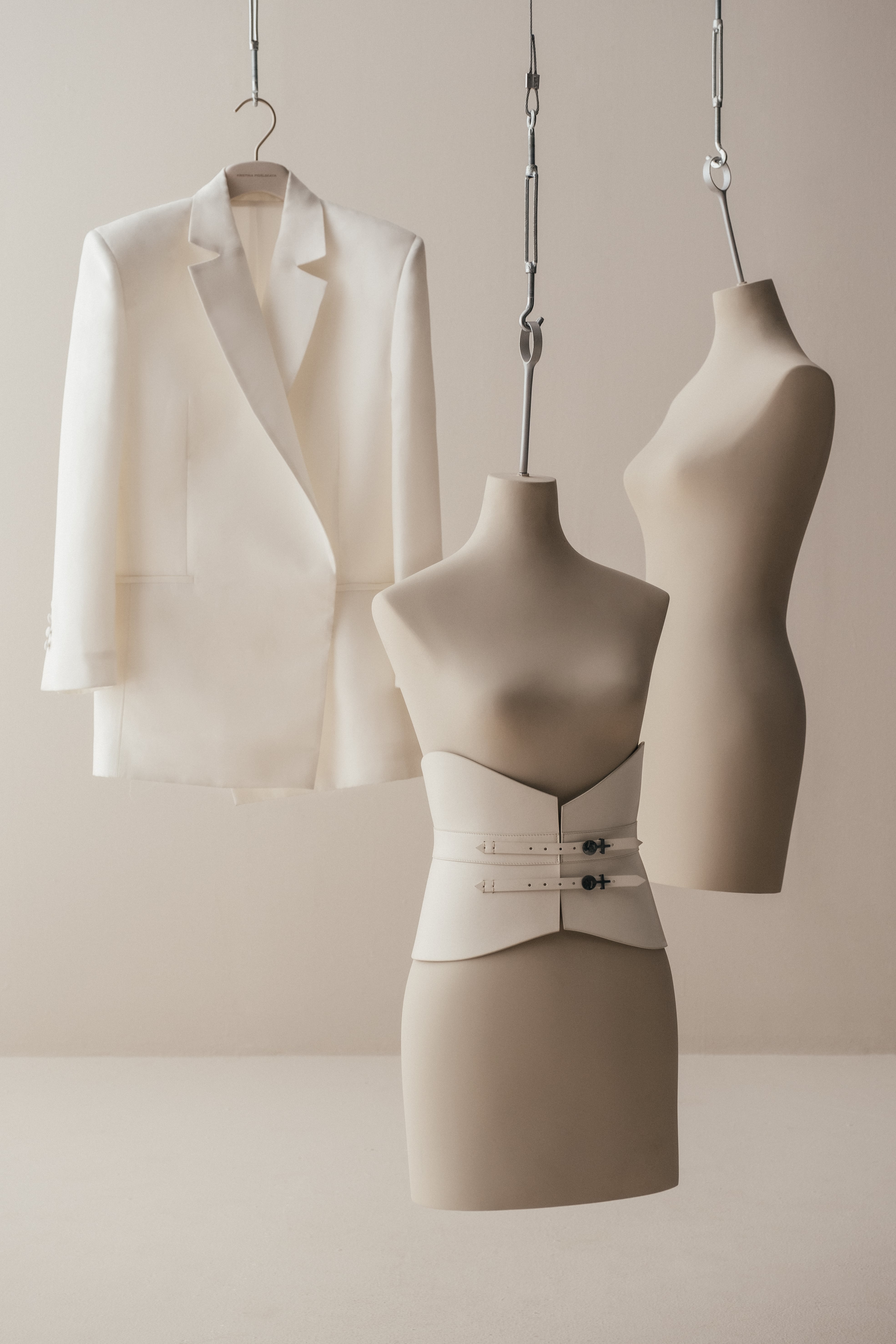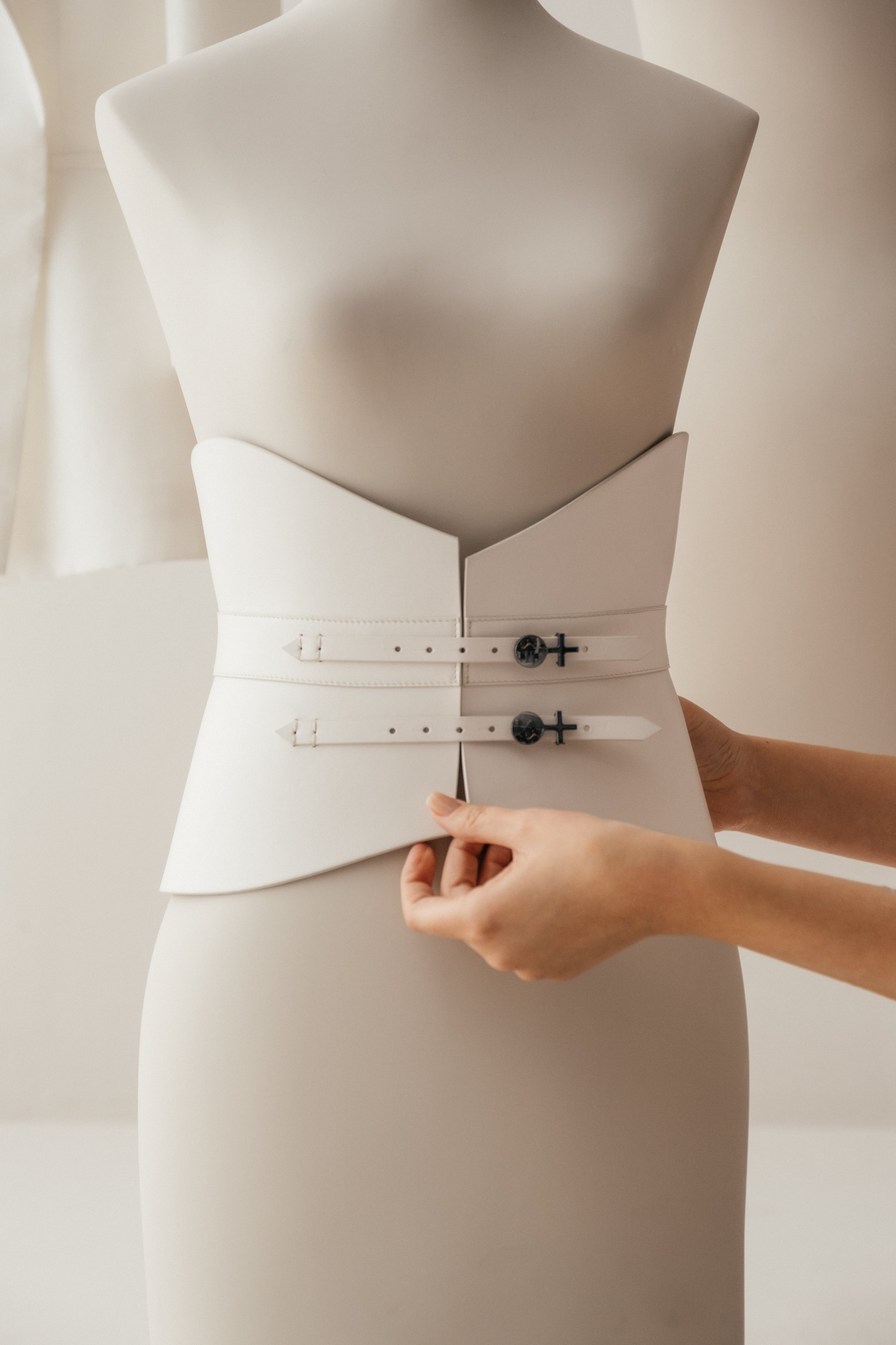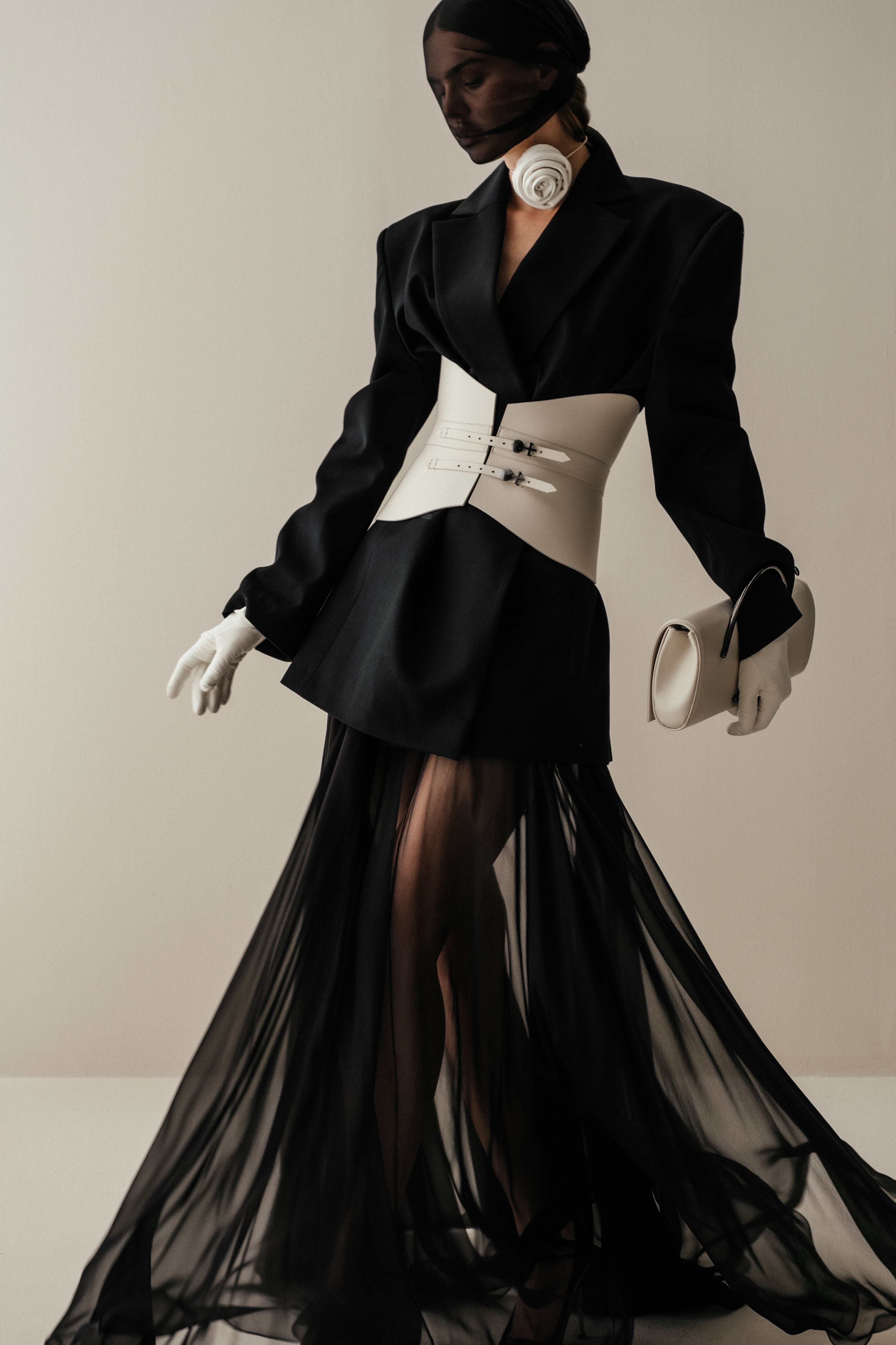 The corset story, as a soft armure, molded into the light-weight fabrics to awaken her inner muse.
