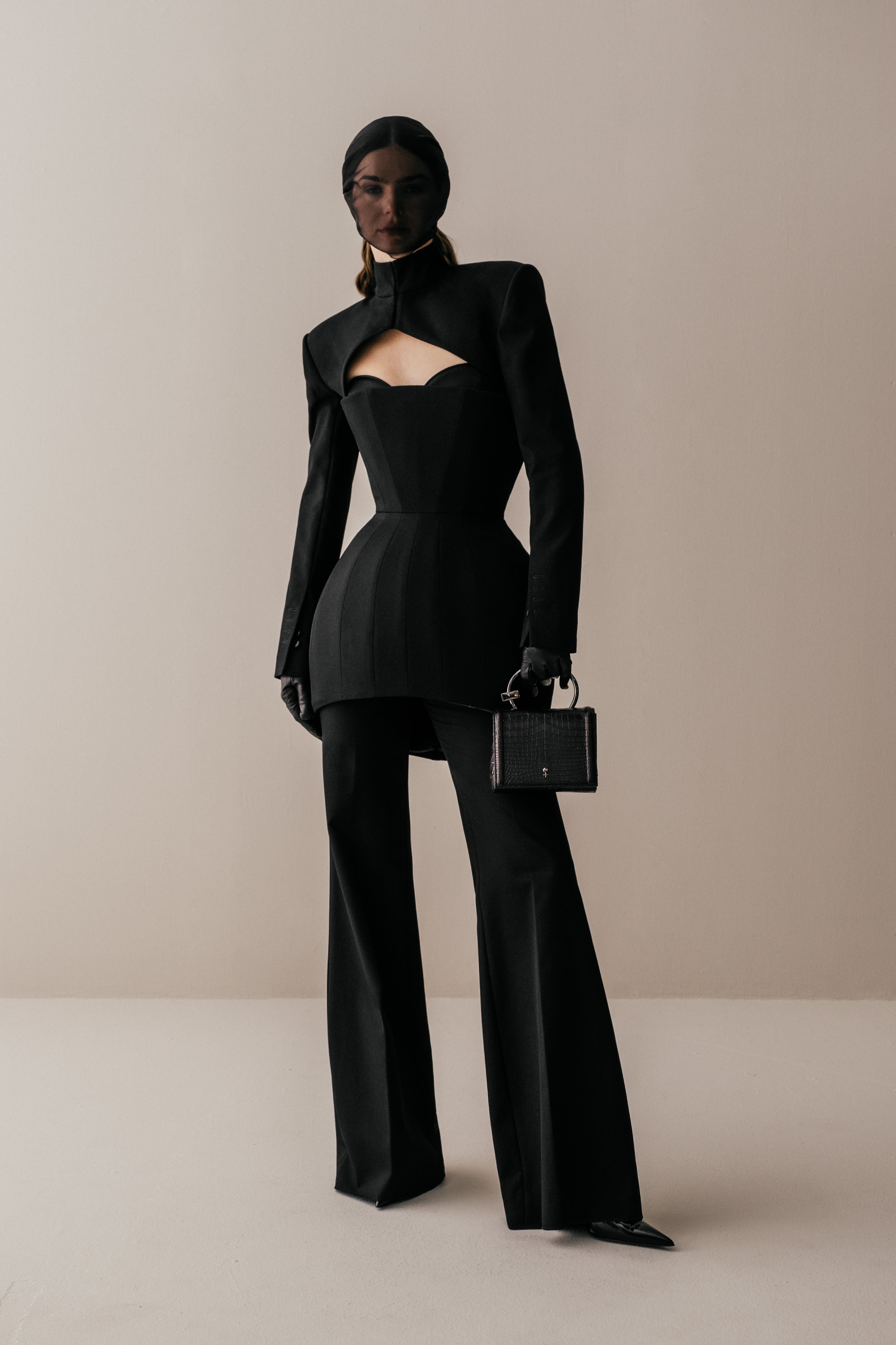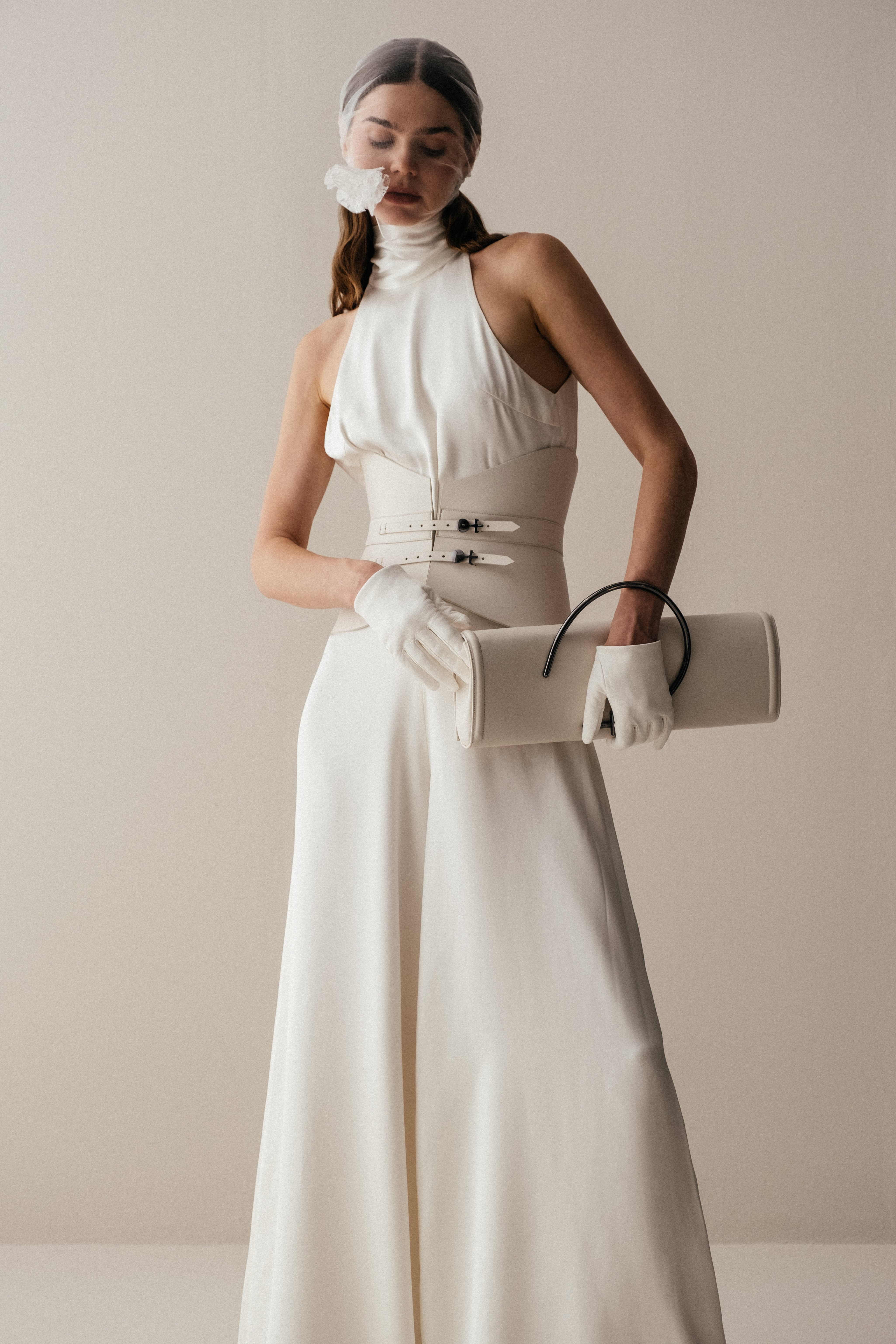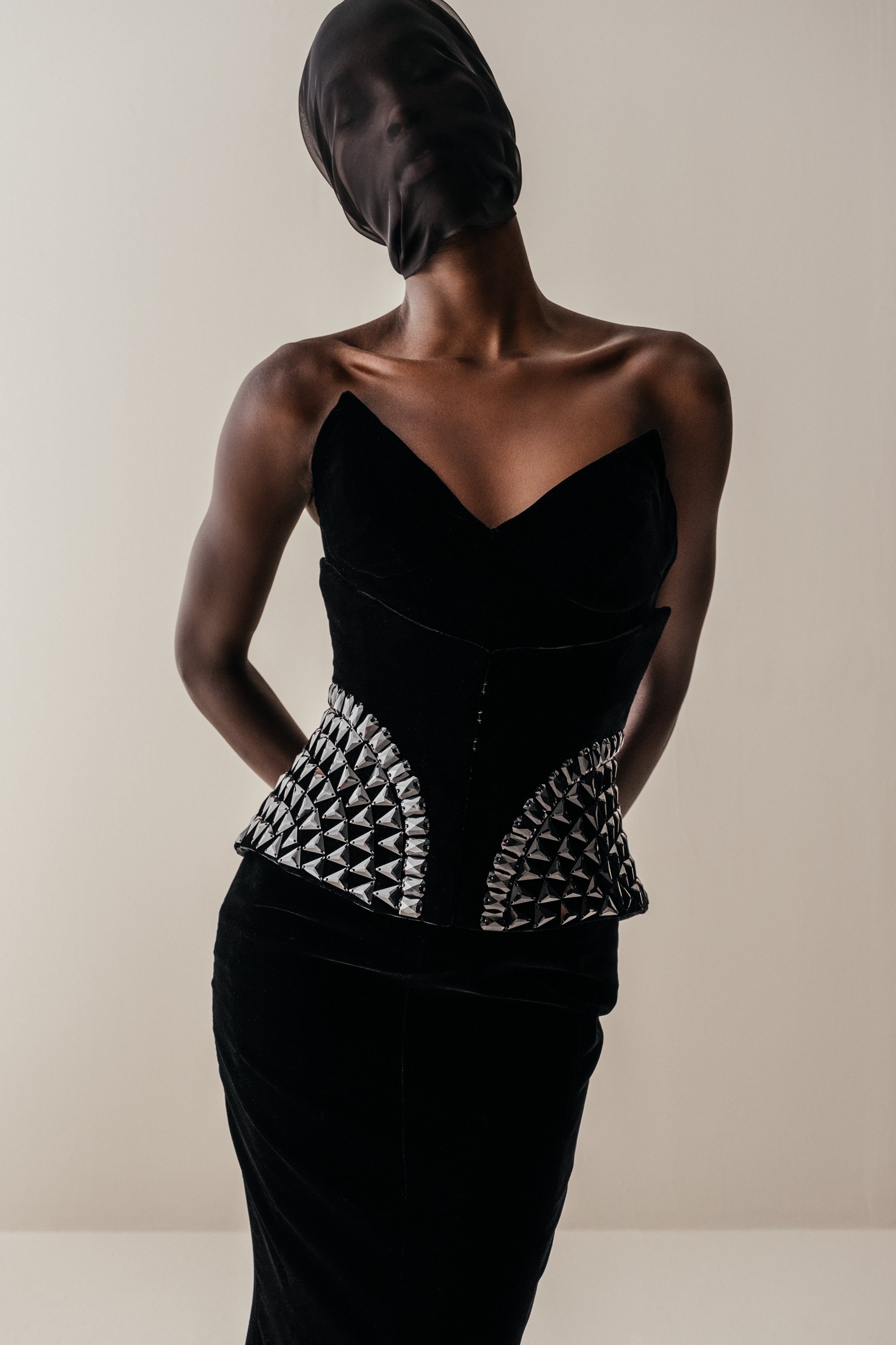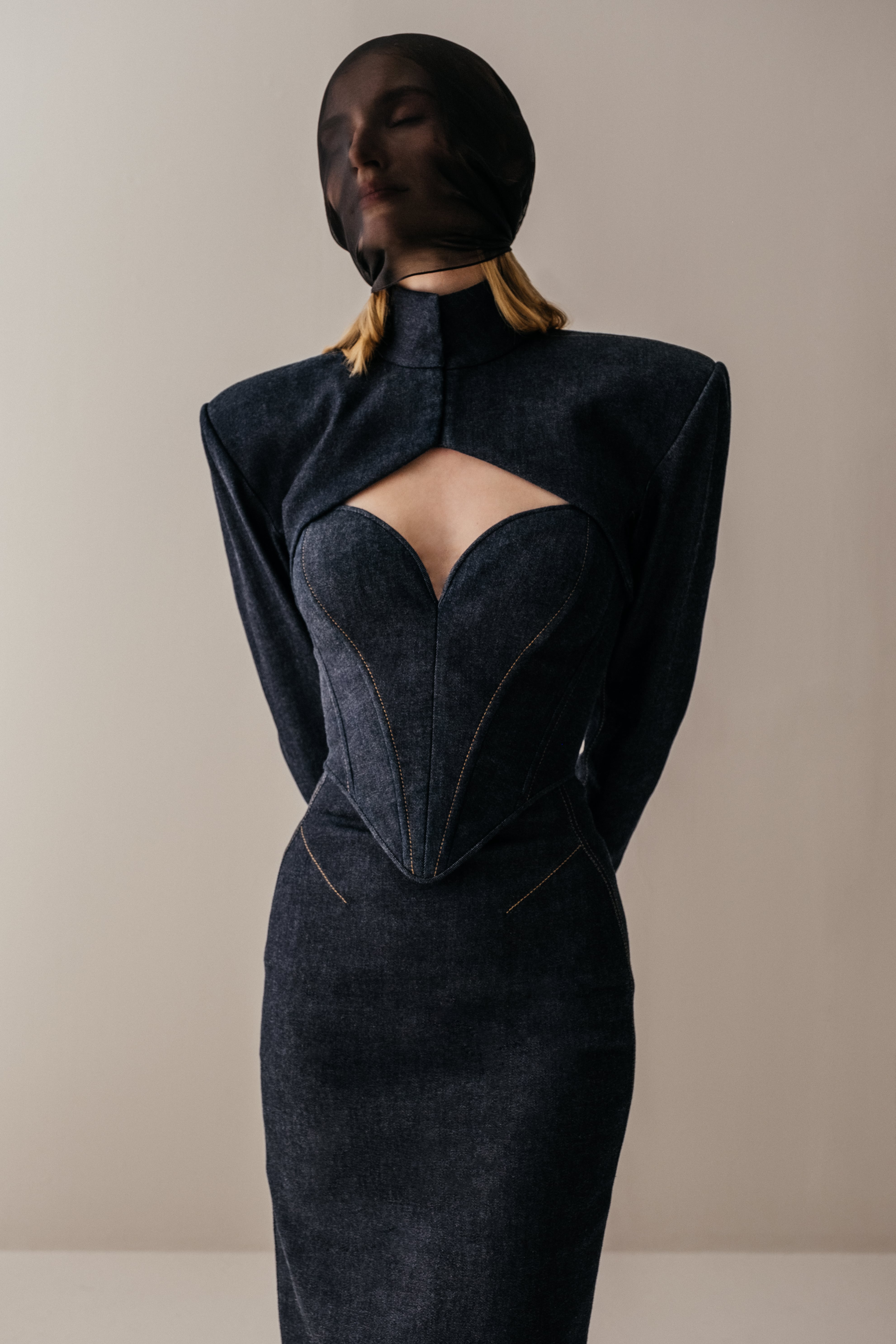 The corset story, as a soft armure, molded into the light-weight fabrics to awaken her inner muse.