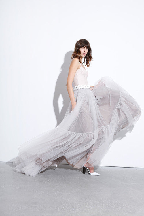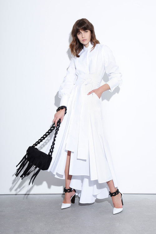The Spring / Summer 2021’s looks are a love letter to monochromatic dressing, with matching ensembles paired with color coded accessories. But it is also a story of contrasts – outerwear worn with panache, dark sleek trench coats paired with bright thigh-high burnt orange boots, provoking sculpted leather bustier tops assorted to graceful tulle. Primary hues, paired with provocative sartorial flair, make for an enduring summer – exuberant intrigue, intoxicating romance, requiring an absurdly chic and fast sports car, a must-have for any passionate affair of the heart.