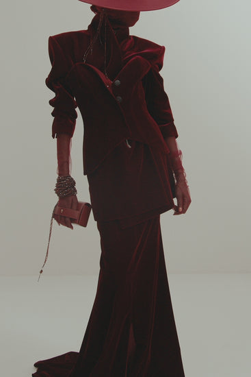 Velvet shaped into a tuxedo corset, opening at the front like a quiet gesture of confidence. Structured lines meet soft texture, creating a silhouette both strong and feminine.